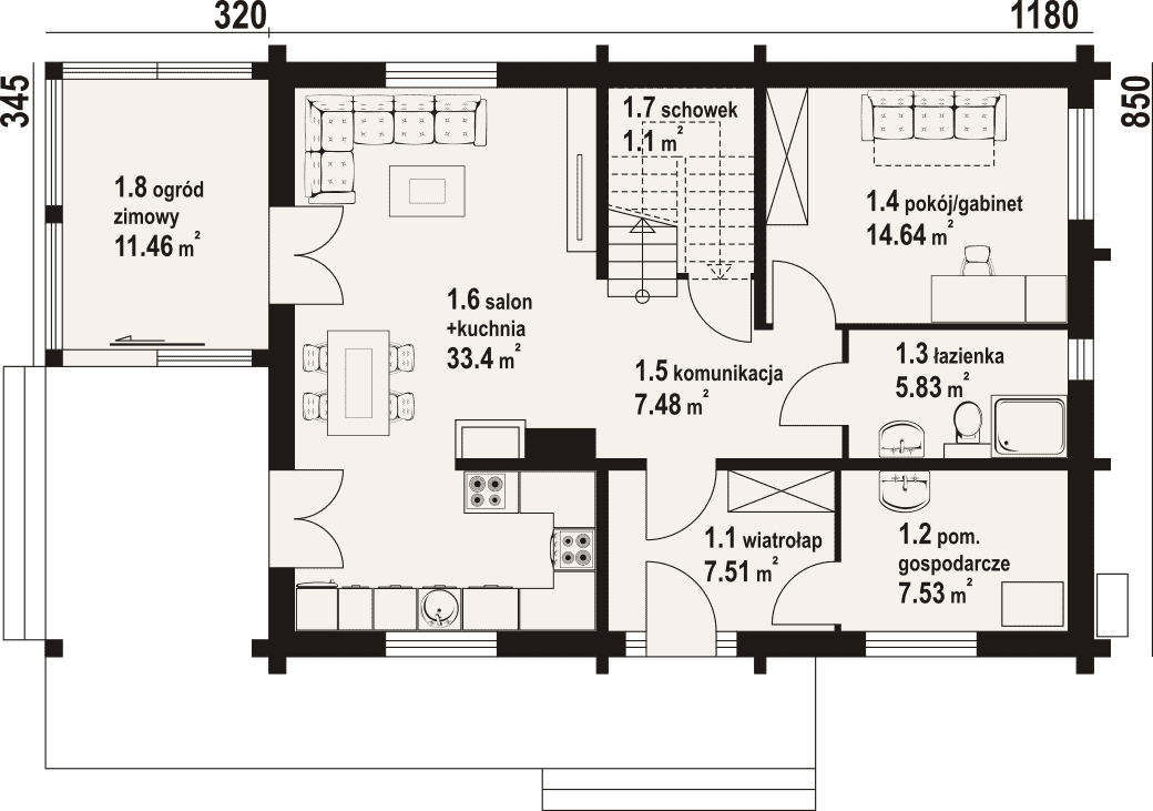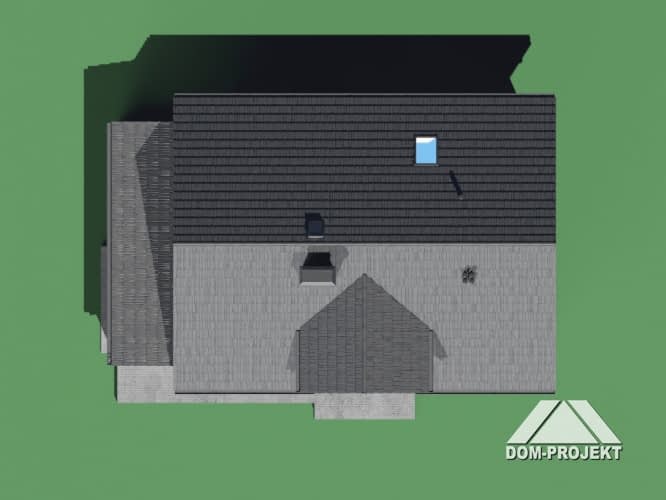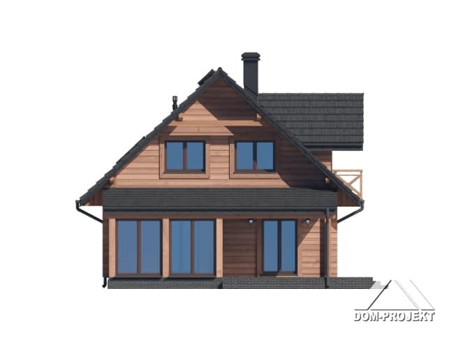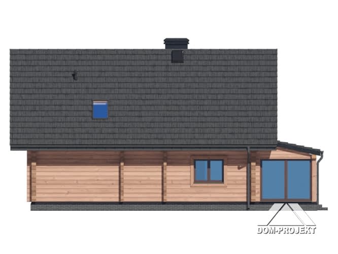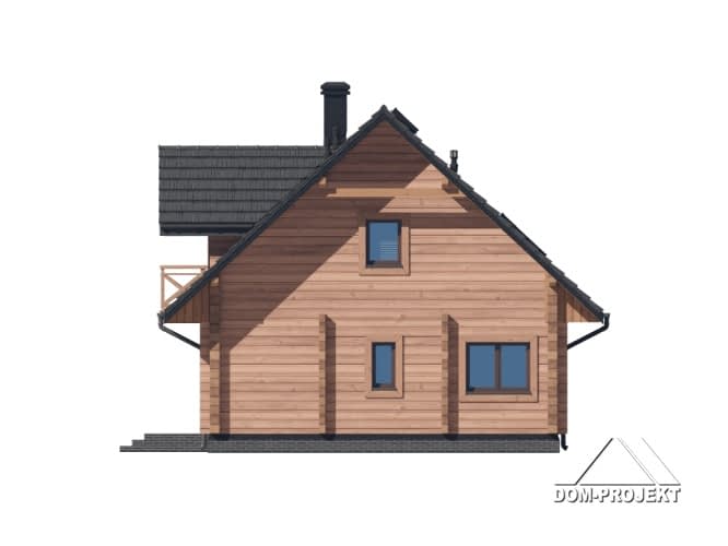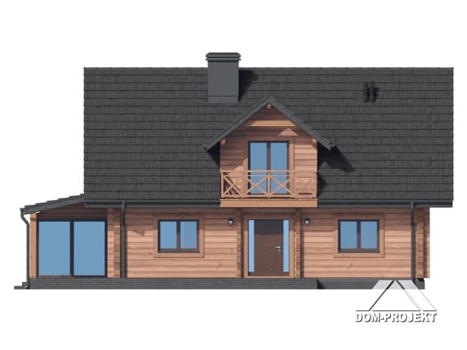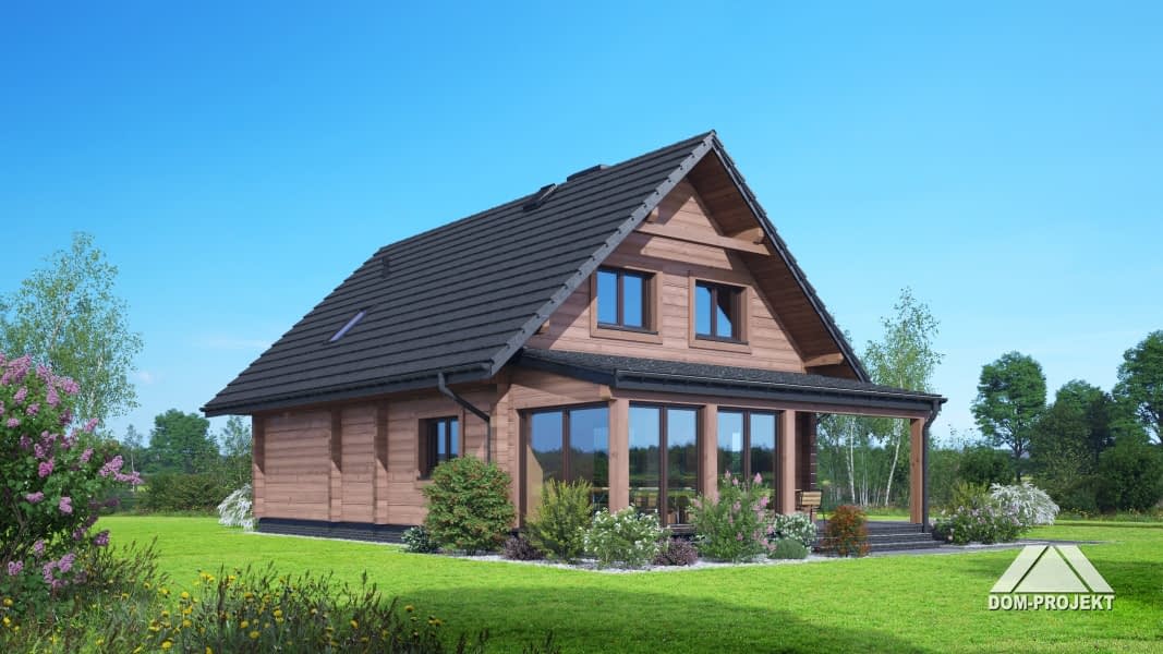 Dom z bali. Na parterze salon z kuchnią, kominkiem, wyjściem na zadaszony taras oraz przejściem do ogrodu zimowego. Pokój-gabinet, łazienka, pomieszczenie gospodarcze, wiatrołap, komunikacja, schowek pod schodami. Na poddaszu trzy pokoje, dwie garderoby, łazienka, pralnia, komunikacja oraz balkon. Zwarta bryła budynku oraz dach dwuspadowy sprzyjają szybkiej i taniej budowie oraz niskim kosztom eksploatacji.Rzuty