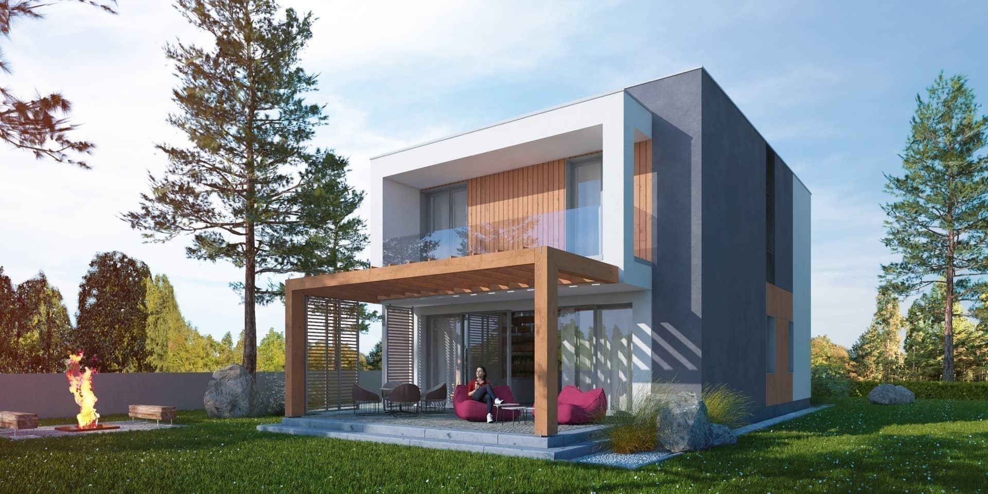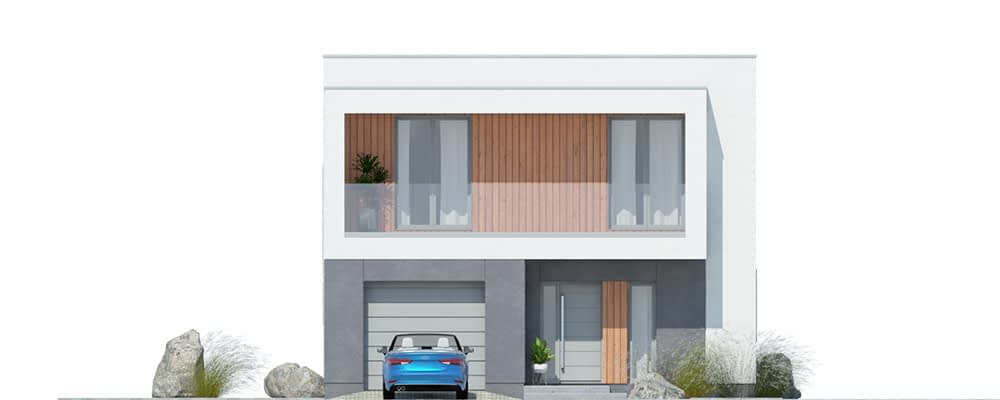Nowoczesny średniej wielkości piętrowy dom jednorodzinny, niepodpiwniczony, wolnostojący, z garażem jednostanowiskowym oraz dużymi balkonami z frontu i tyłu.