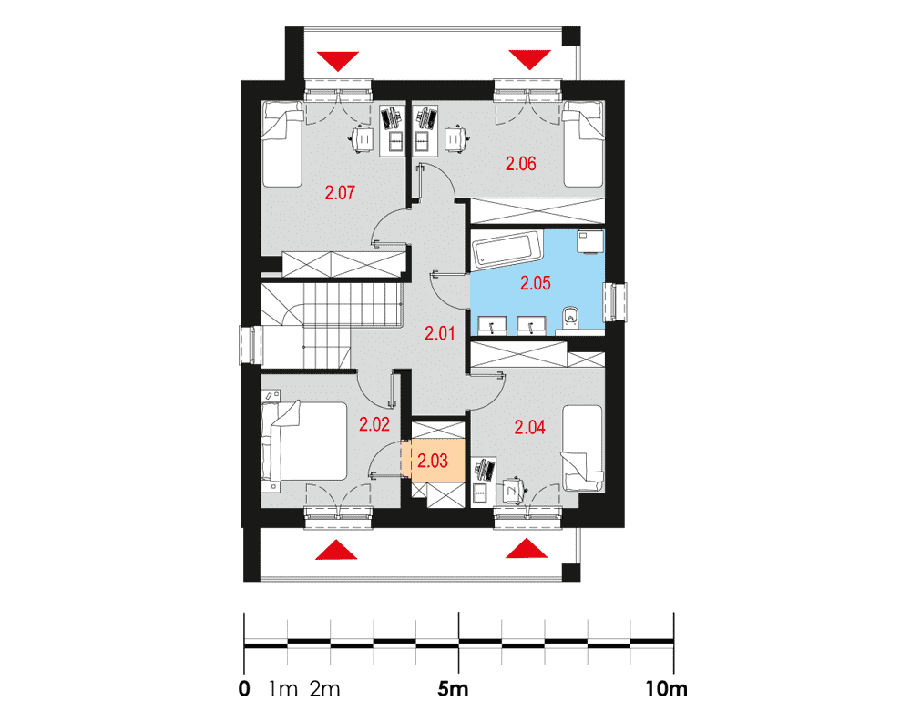 - rzuty wszystkich charakterystycznych poziomów obiektu budowlanego, w tym widok dachu lub przekrycia, przedstawiające również układ funkcjonalno-przestrzenny obiektu budowlanego,