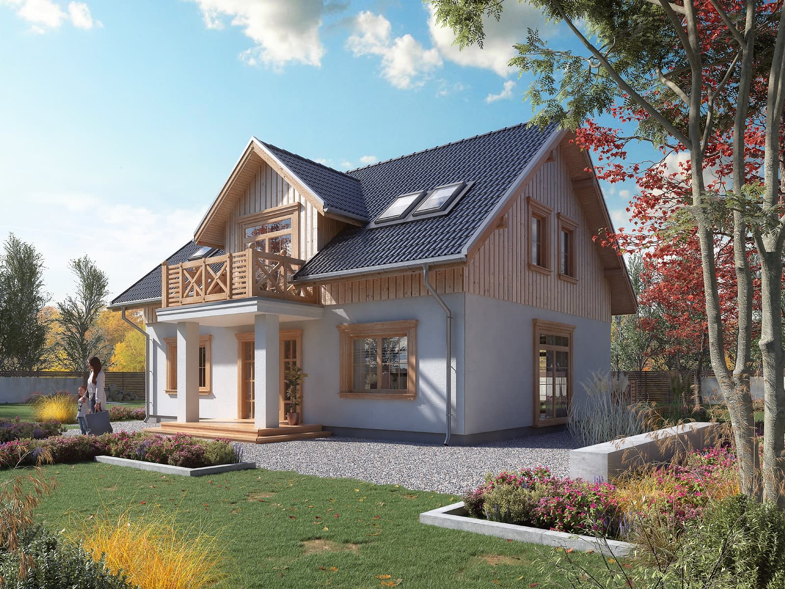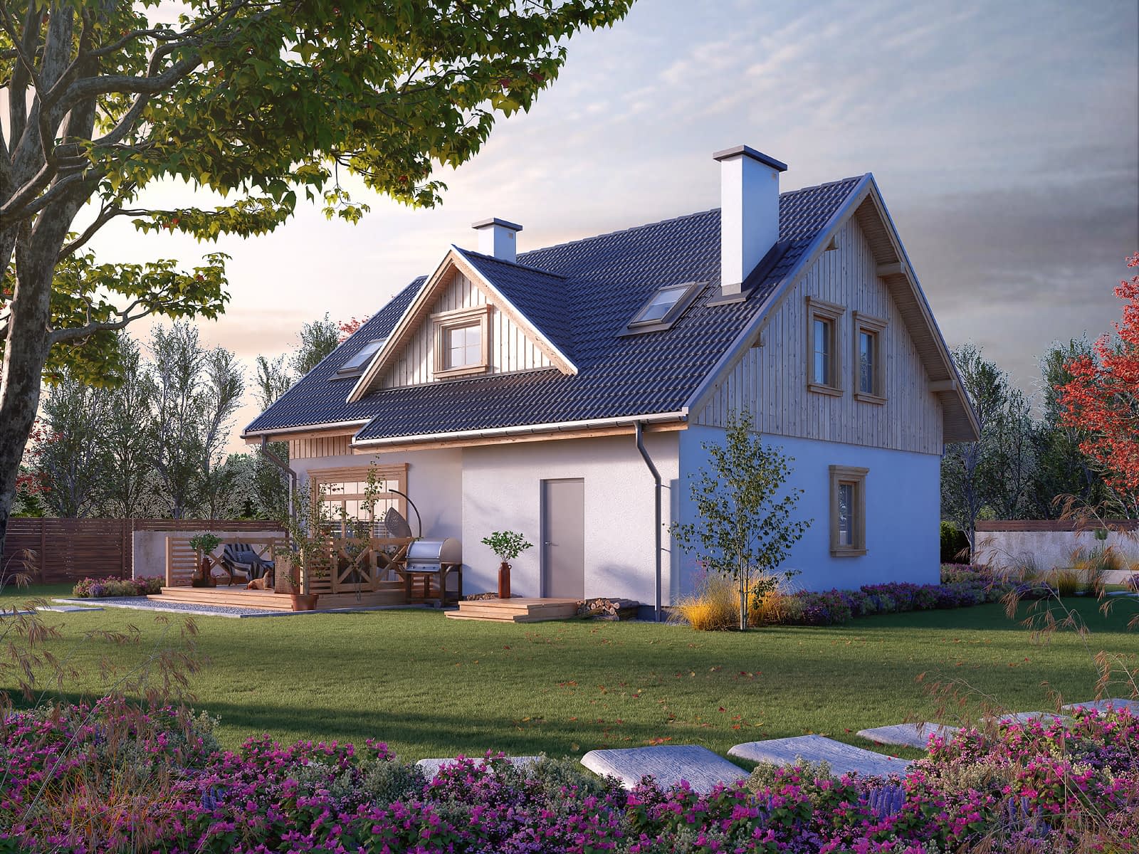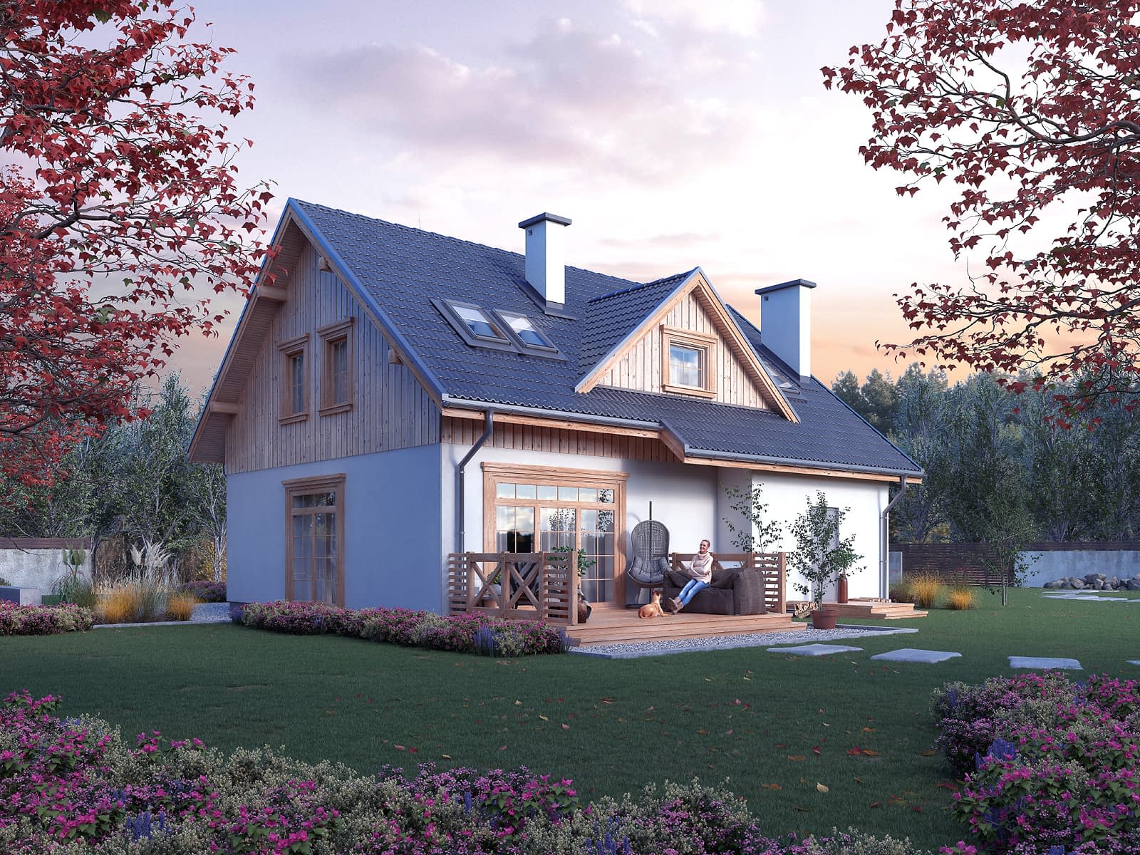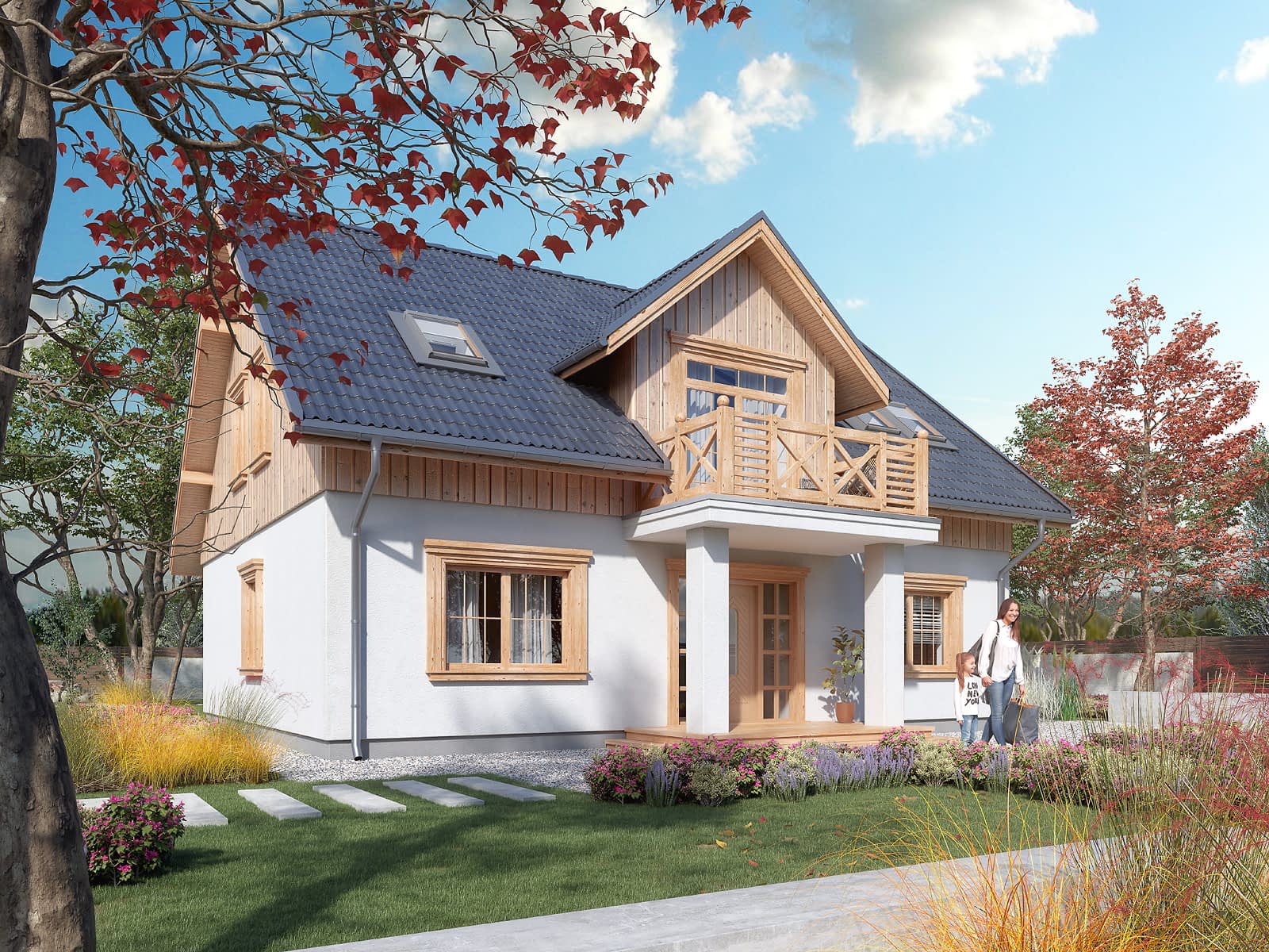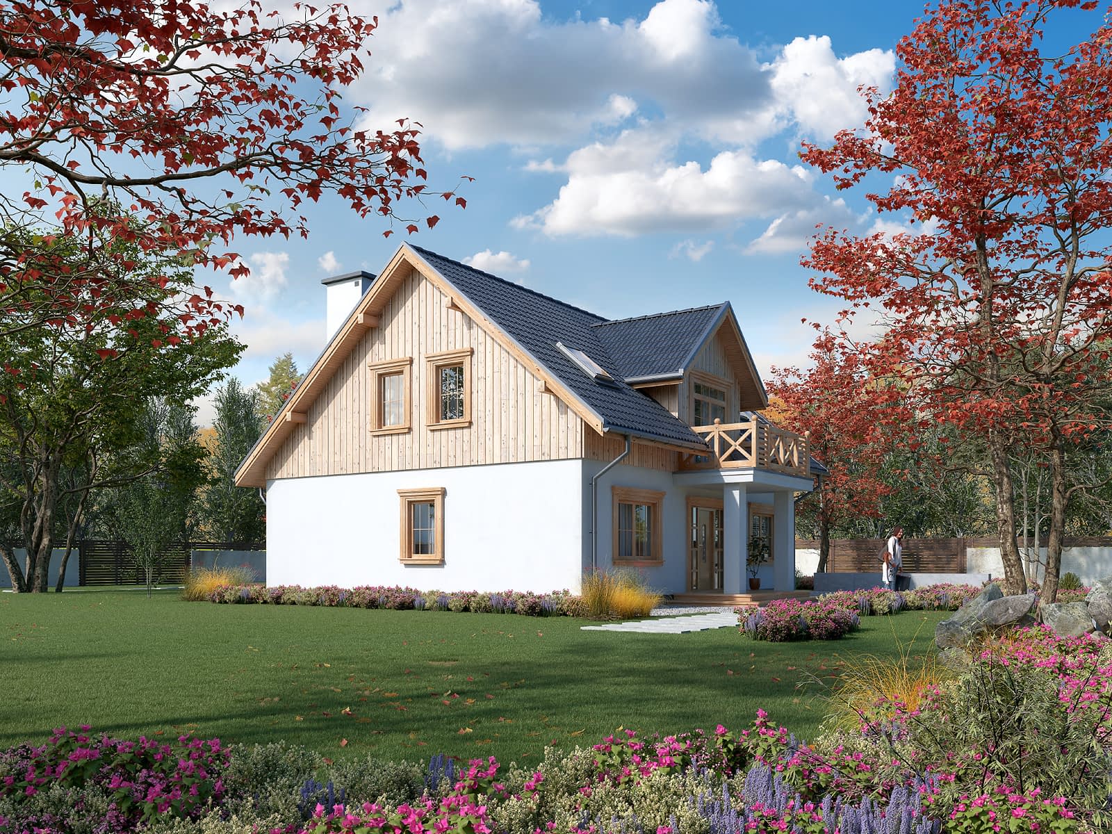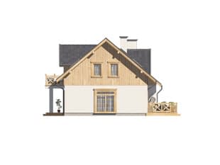Dudek 5 to projekt domu z użytkowym poddaszem o powierzchni 140 m2. Projekt utrzymany został w tradycyjnym stylu. Na elewacji pojawił się biały tynk oraz szalówka w kolorze naturalnego drewna. Uroku dodatkowo dodają drewniane balustrady oraz stolarka okienna, którą zdobią szprosy i drewniane gzymsy. Część dzienna to przestronny salon z kominkiem, jadalnia z dużymi przeszkleniami oraz kuchnia ze spiżarnią. Na parterze pojawił się również dodatkowy pokój, łazienka oraz duża kotłownia. Poddasze to strefa prywatna mieszkańców. Zaprojektowano tu trzy wygodne sypianie oraz rodzinną łazienkę.Konstrukcja