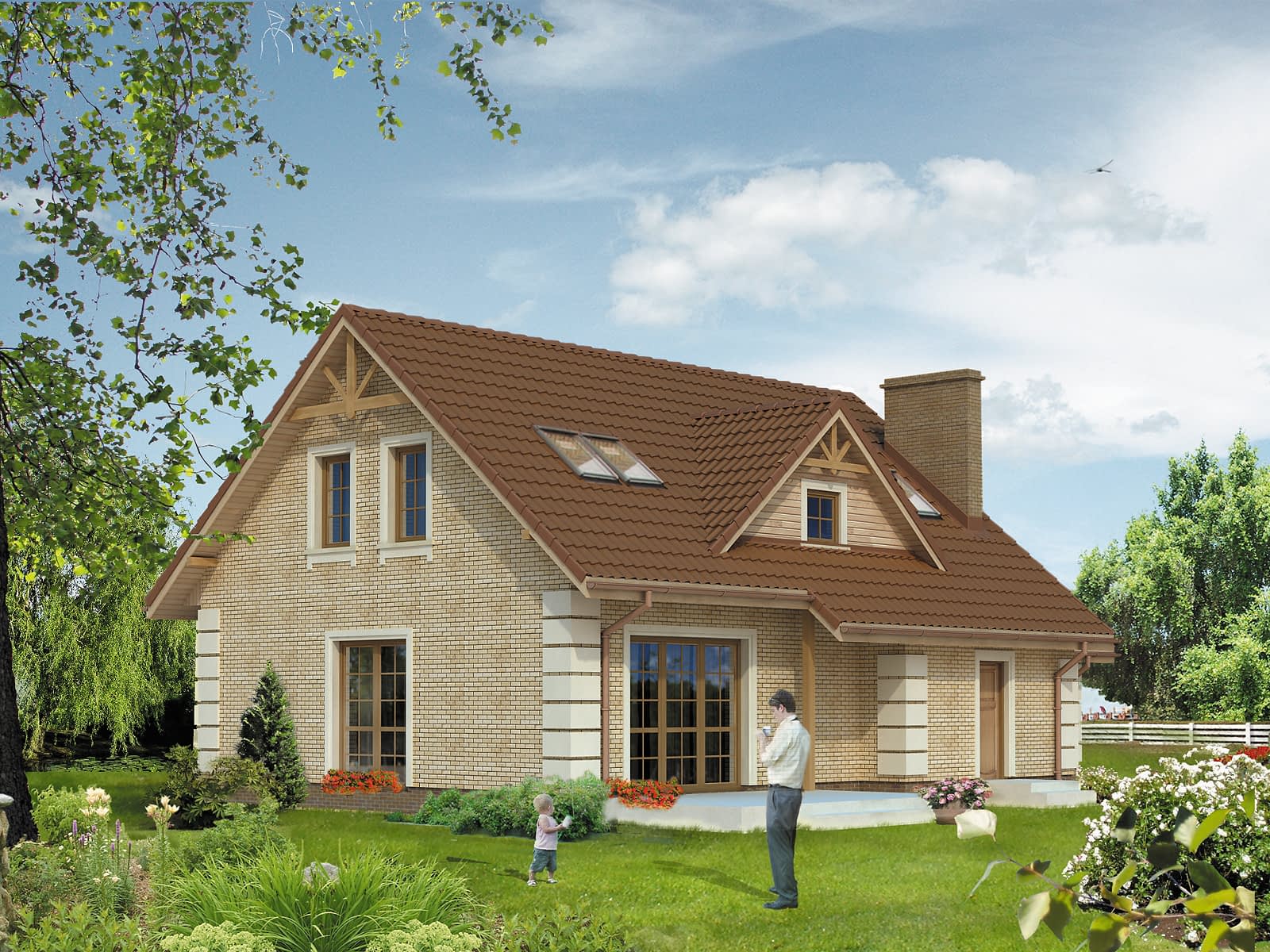 Dom jednorodzinny, parterowy z poddaszem użytkowym i garażem jednostanowiskowym. Na parterze, oprócz podstawowych pomieszczeń strefy dziennej, zaprojektowano dodatkowy pokój z łazienką. Na poddaszu zaprojektowano dwie sypialnie z garderobą i łazienkę.Konstrukcja