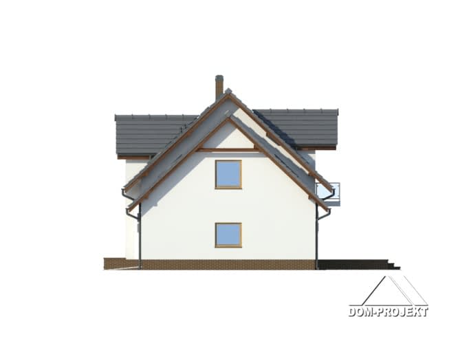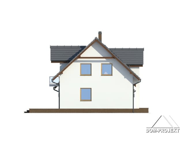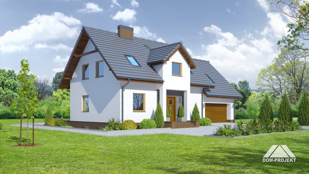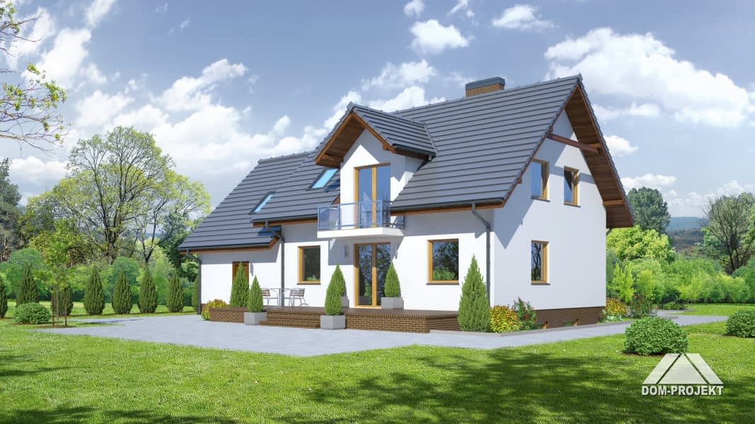 Dom z poddaszem użytkowym i podpiwniczeniem. Duży salon z aneksem kuchennym, kominkiem i wyjściem na taras. Pokój, łazienka, spiżarka, wiatrołap, schody na poddasze, garaż na dwa samochody i pomieszczenie gospodarcze. Na poddaszu trzy pokoje, garderoba, łazienka, pomieszczenie gospodarcze i komunikacja. W piwnicach kotłownia, łazienka z sauną, spiżarnia i pralnia.Zwarta bryła budynku oraz dach dwuspadowy sprzyjają szybkiej i taniej budowie oraz niskim kosztom eksploatacji.Rzuty