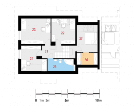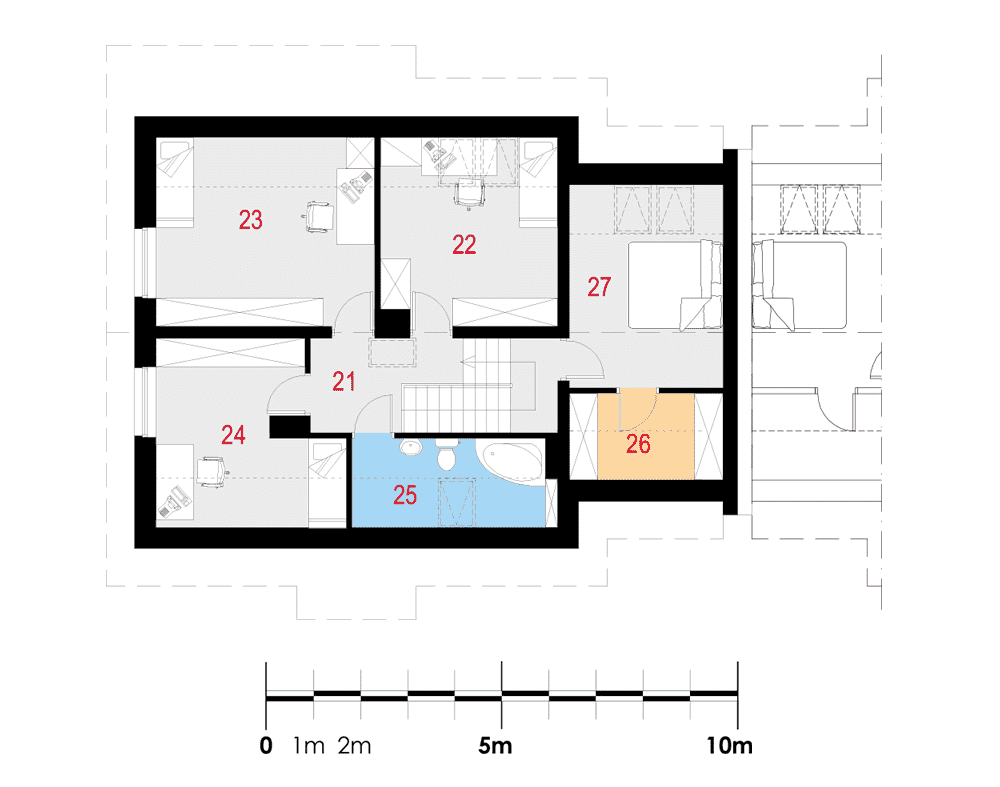 - rzuty wszystkich charakterystycznych poziomów obiektu budowlanego, w tym widok dachu lub przekrycia, przedstawiające również układ funkcjonalno-przestrzenny obiektu budowlanego,