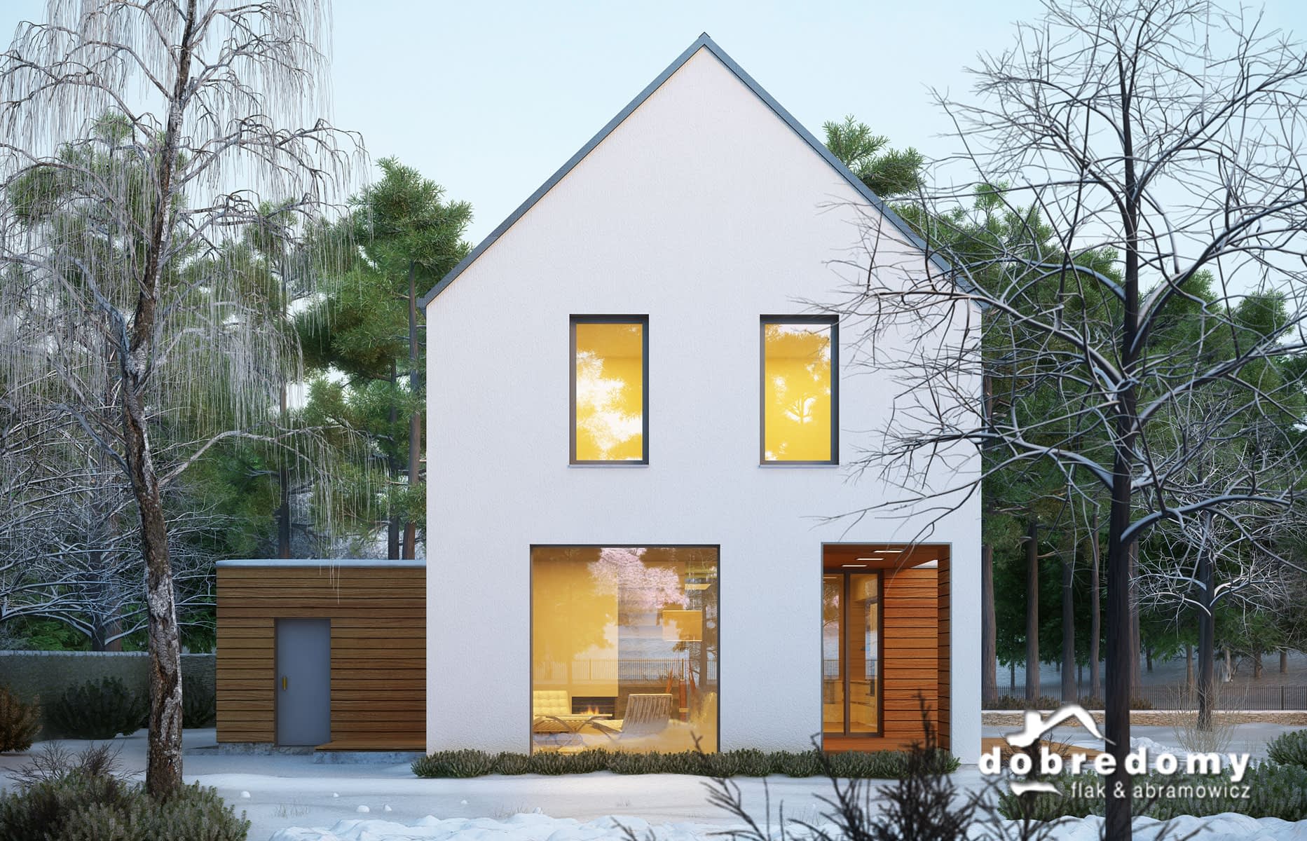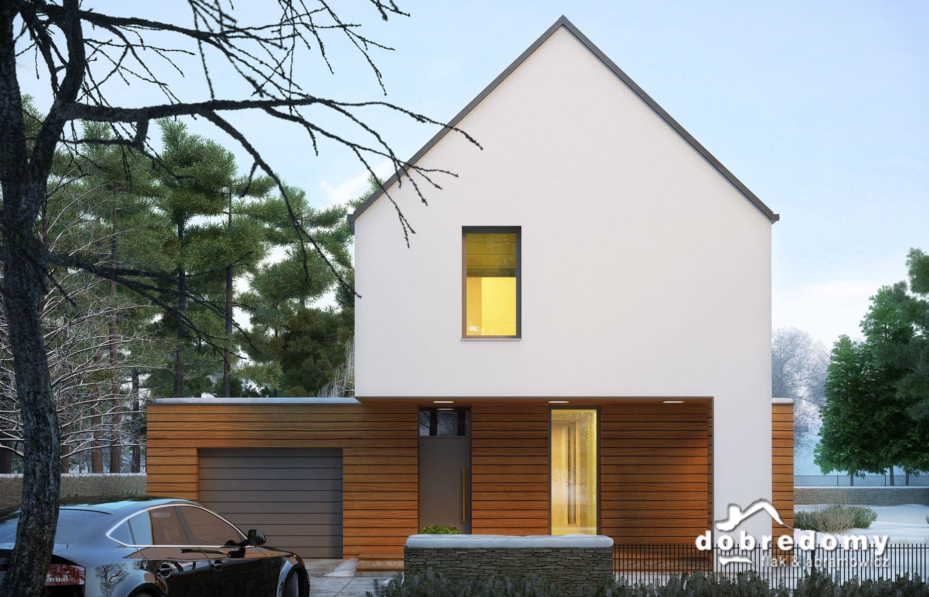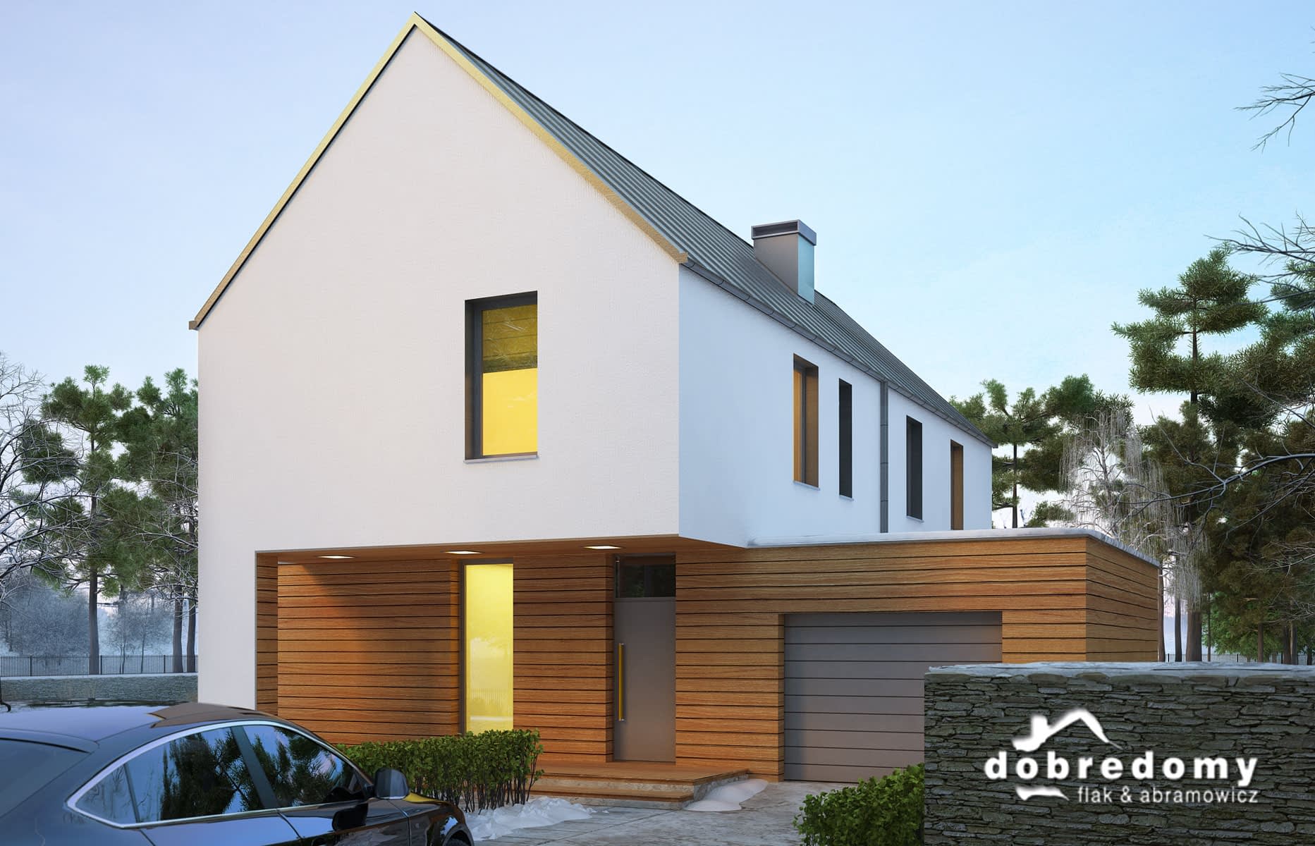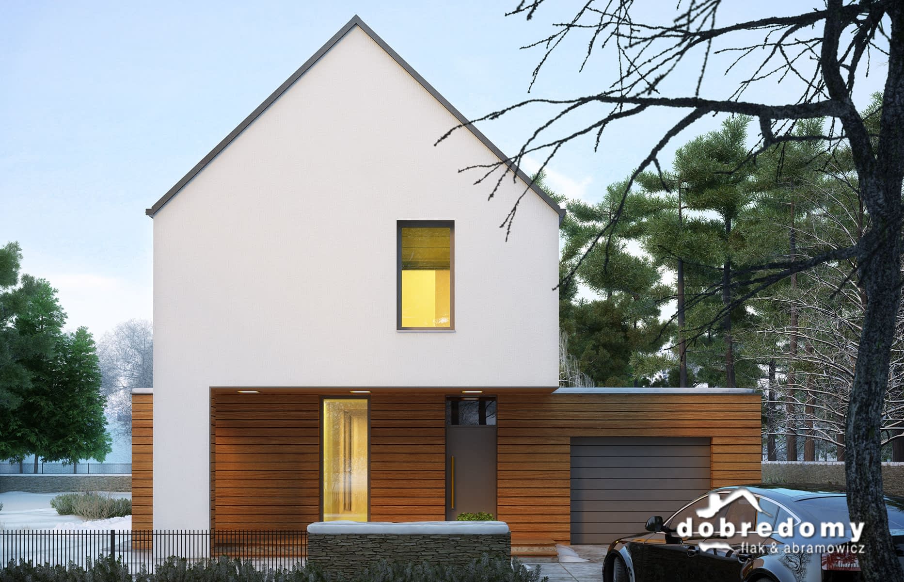 Dom z użytkowym poddaszem, przeznaczony dla 4-5-osobowej rodziny. Na parterze zlokalizowano pokój dzienny, kuchnię połączoną z jadalnią, garderobę dostępną z wiatrołapu, łazienkę, jednostanowiskowy garaż oraz pomieszczenie gospodarcze. Na poddaszu znajdują się cztery pokoje, garderoba łazienka oraz pralnia. Projekt może być wykorzystany do zabudowy bliźniaczej.
