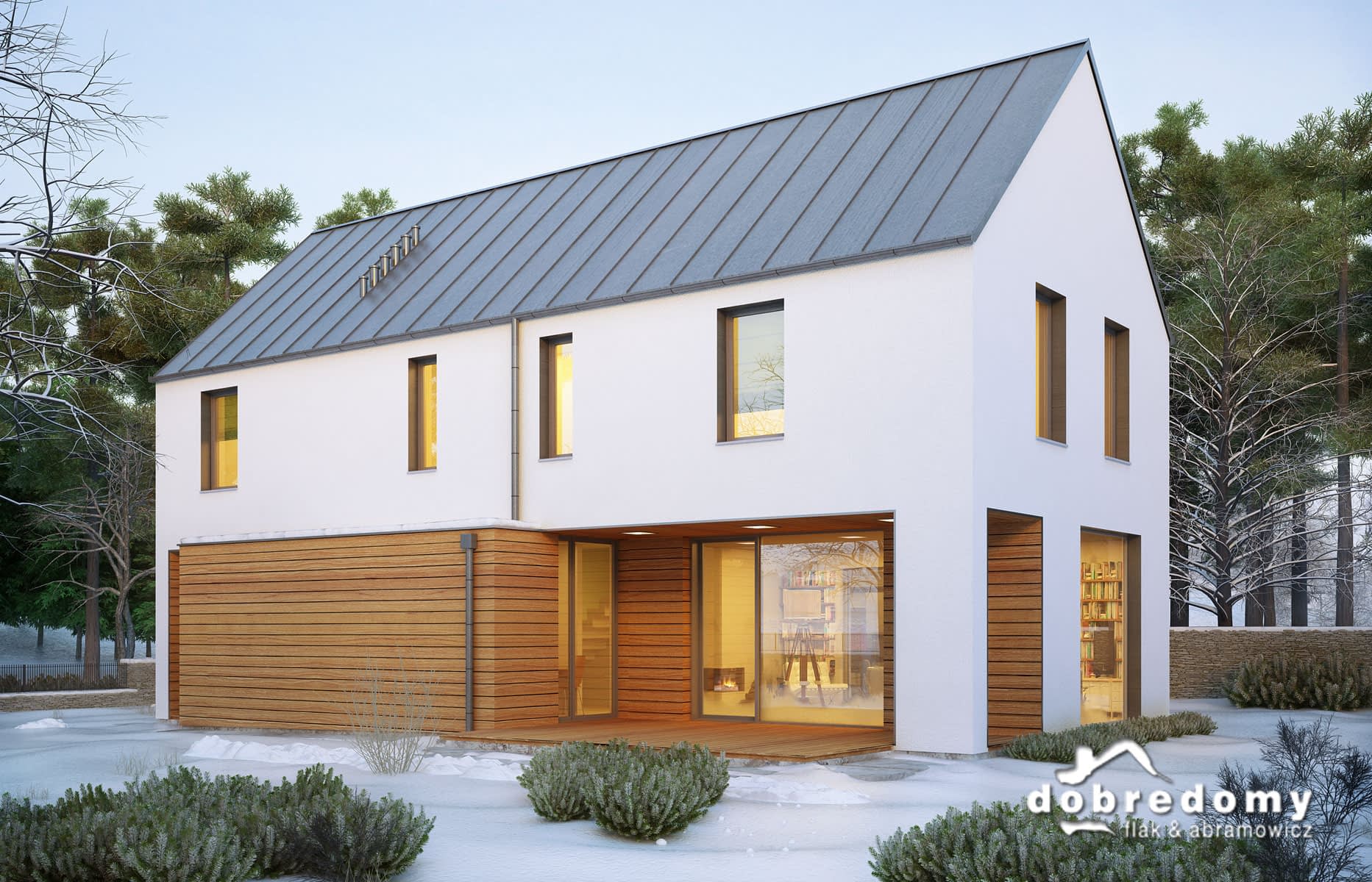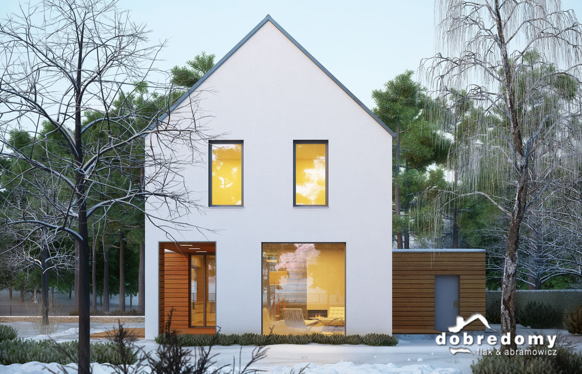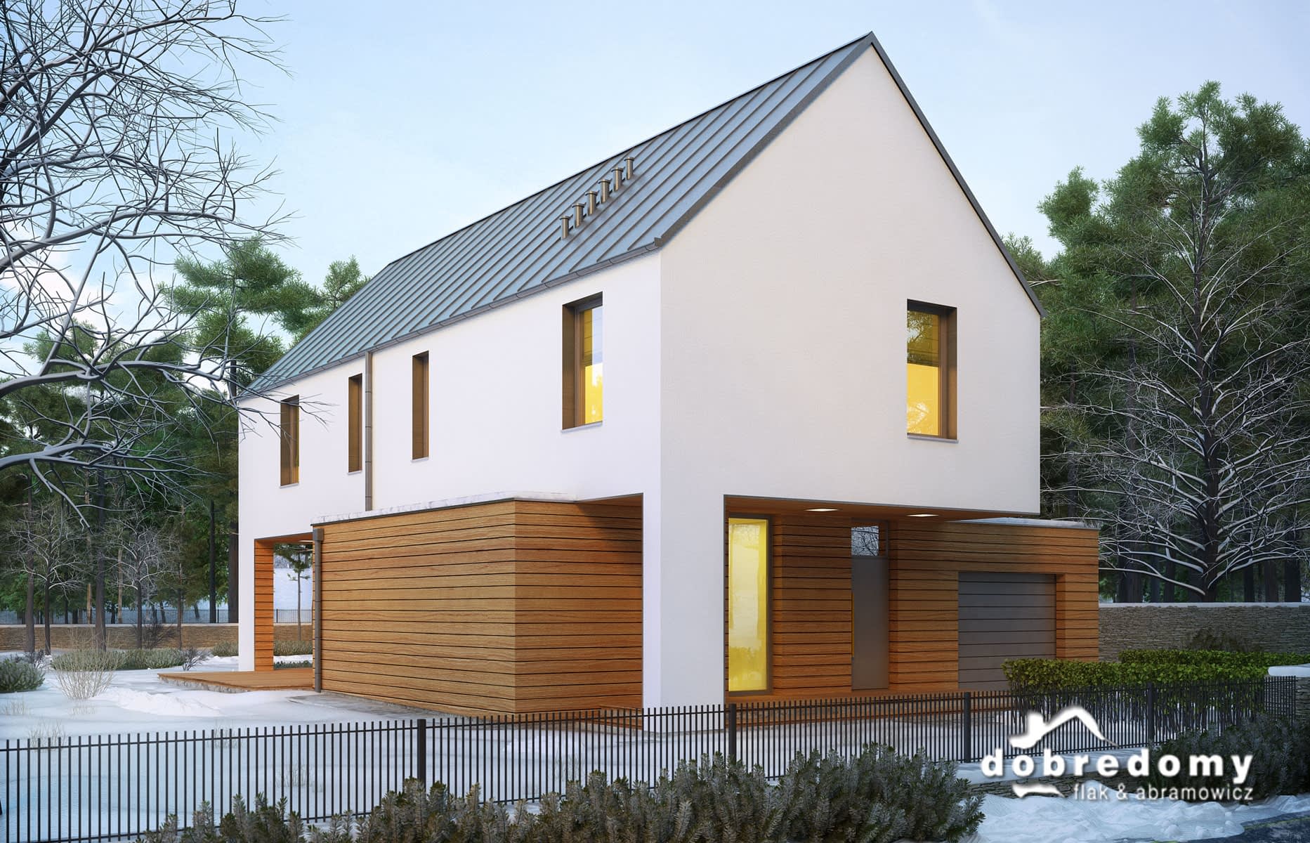 Dom z użytkowym poddaszem, przeznaczony dla 4-5-osobowej rodziny. Na parterze zlokalizowano pokój dzienny, kuchnię połączoną z jadalnią, garderobę dostępną z wiatrołapu, łazienkę, jednostanowiskowy garaż oraz pomieszczenie gospodarcze. Na poddaszu znajdują się cztery pokoje, garderoba łazienka oraz pralnia. Projekt może być wykorzystany do zabudowy bliźniaczej.