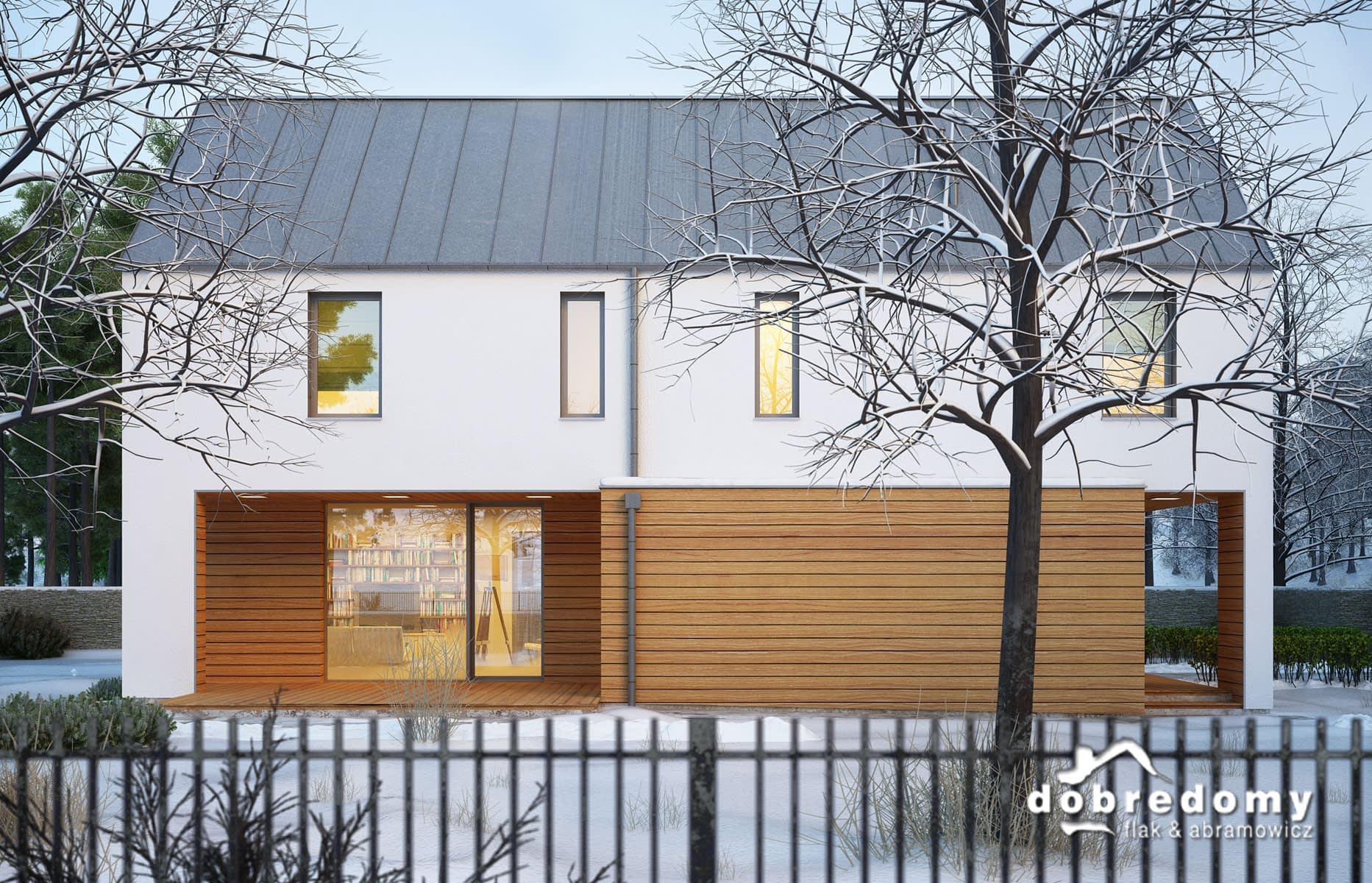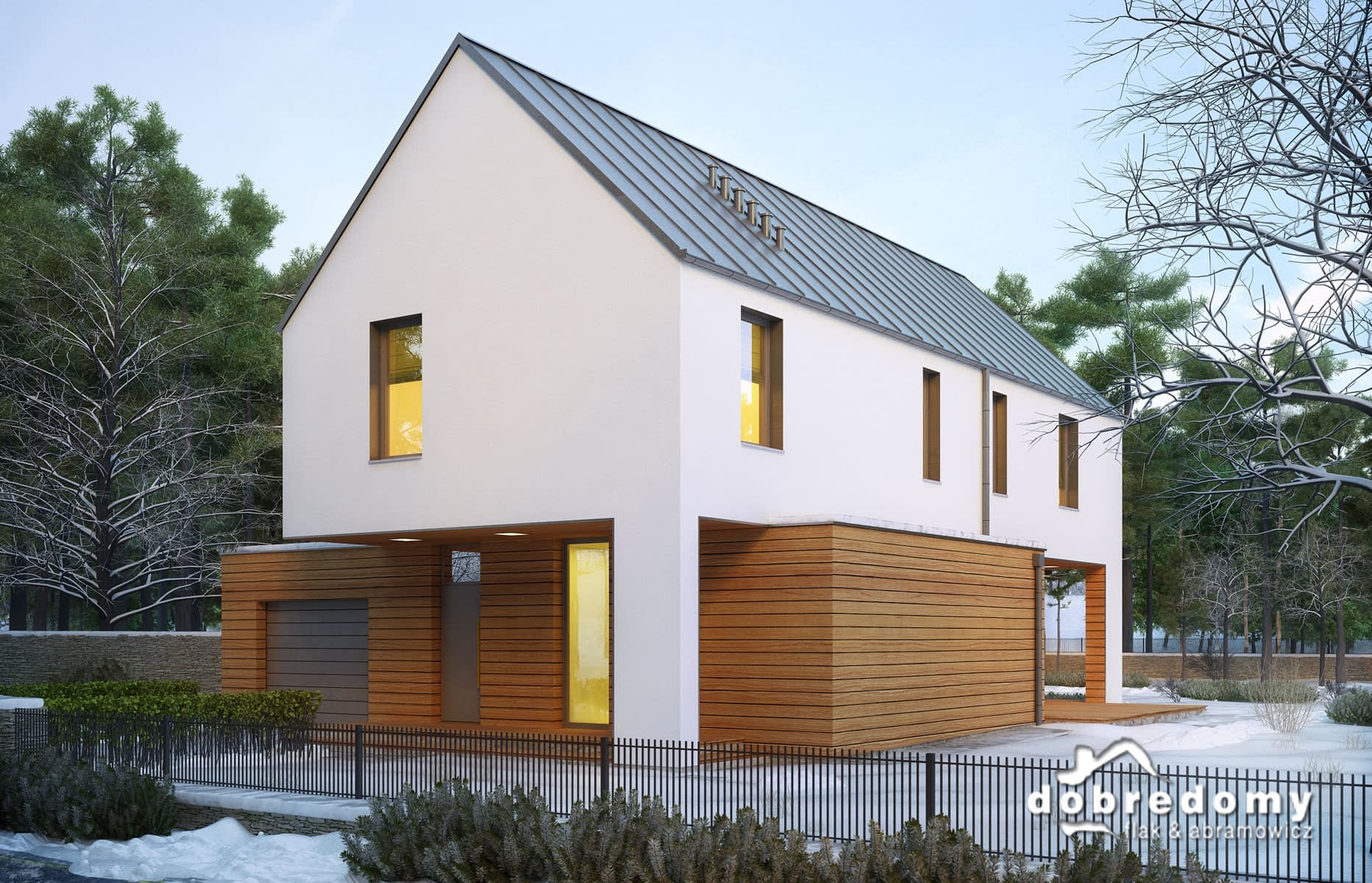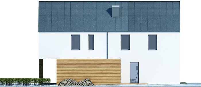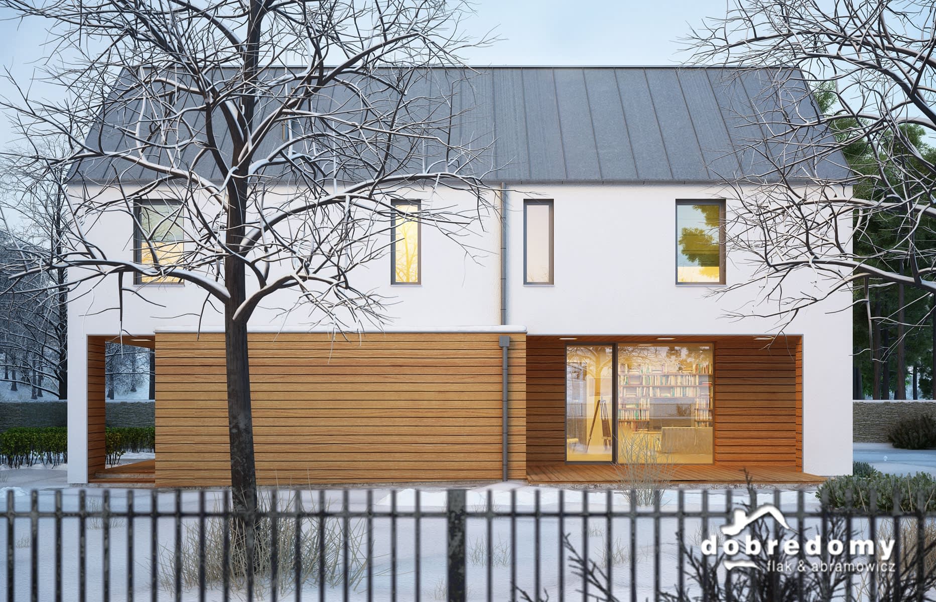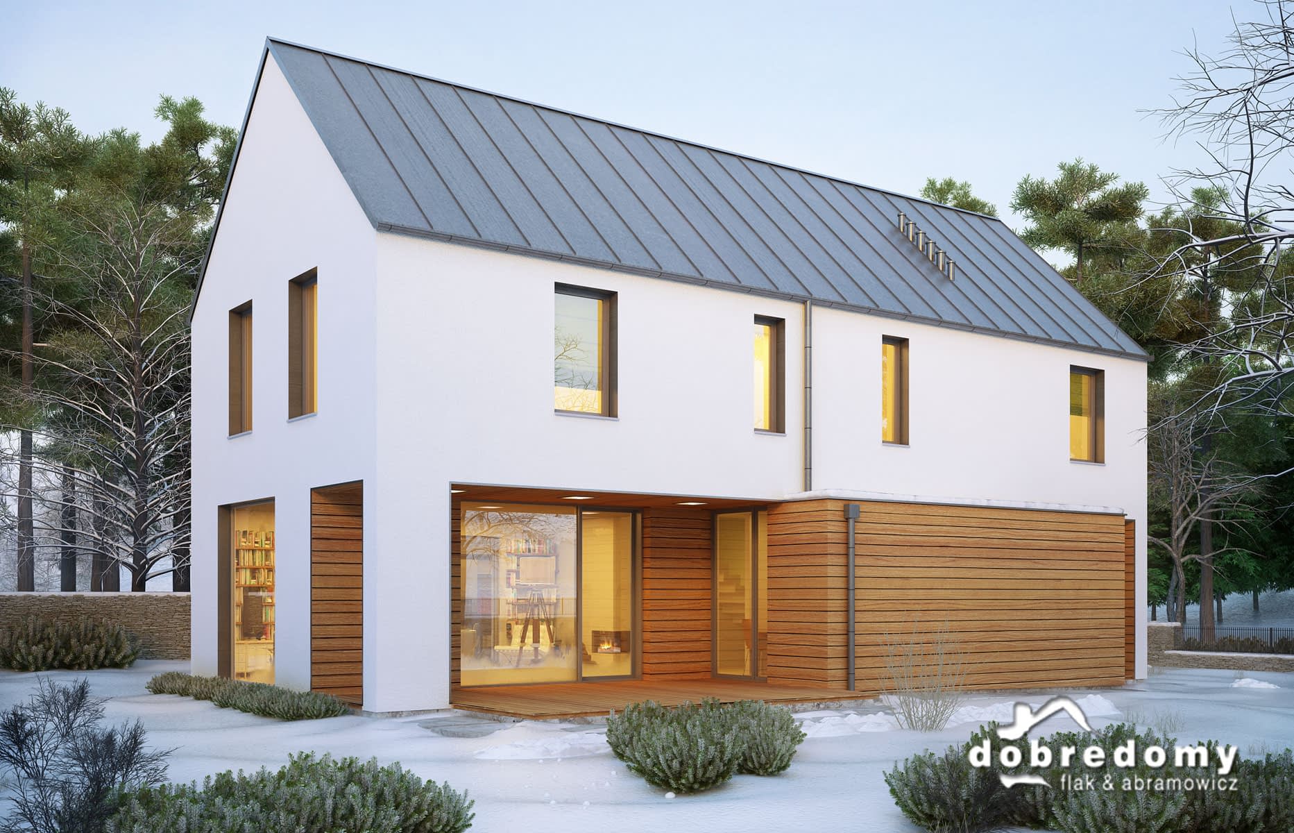 Dom z użytkowym poddaszem, przeznaczony dla 4-5-osobowej rodziny. Na parterze zlokalizowano pokój dzienny, kuchnię połączoną z jadalnią, garderobę dostępną z wiatrołapu, łazienkę, jednostanowiskowy garaż oraz pomieszczenie gospodarcze. Na poddaszu znajdują się cztery pokoje, garderoba łazienka oraz pralnia. Projekt może być wykorzystany do zabudowy bliźniaczej.