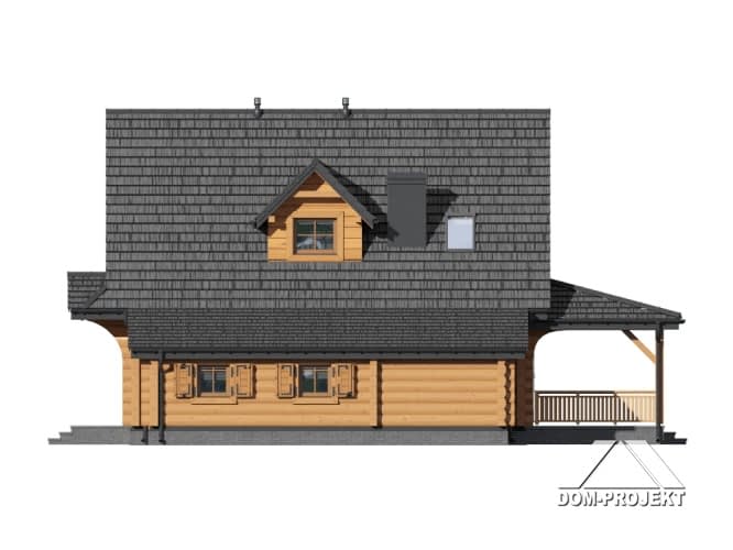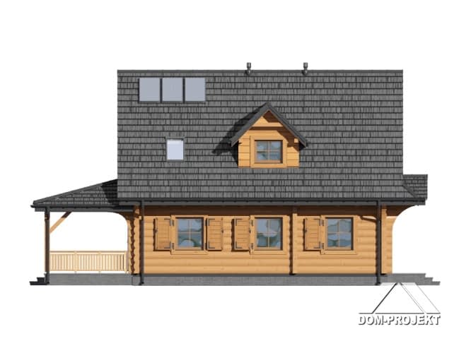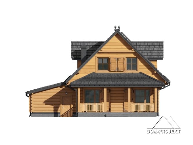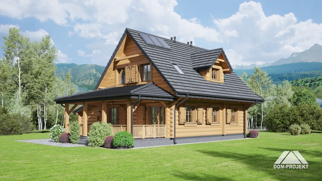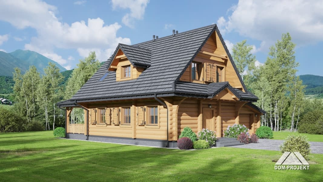 Dom z bali. drewnianych. Na parterze salon z aneksem kuchennym, wyjściami na zadaszony taras, kominkiem oraz schodami na poddasze. Pokój, łazienka, korytarz, garderoba, wiatrołap, garaż i kotłownia. Na poddaszu trzy pokoje, łazienka i komunikacja.Rzuty