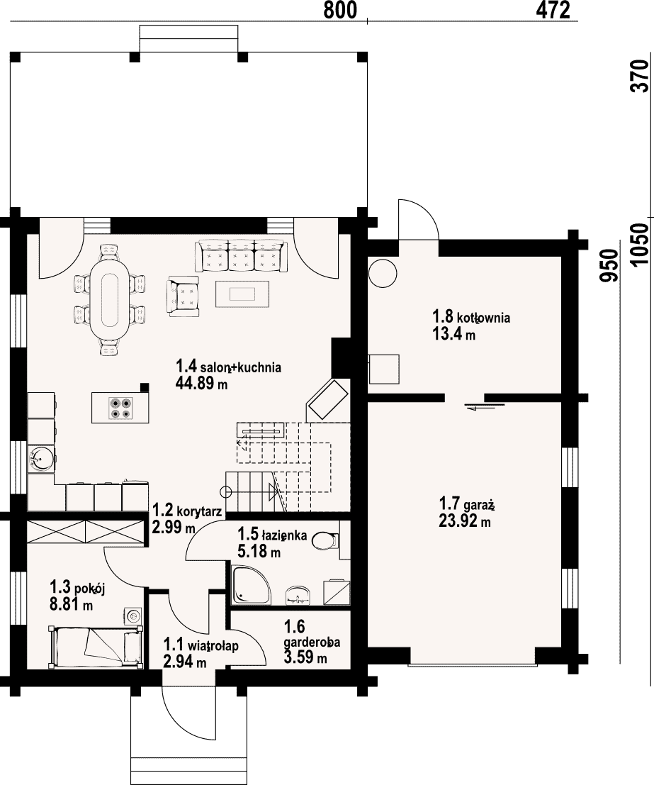 - 1.4 - salon+kuchnia44.89 m²