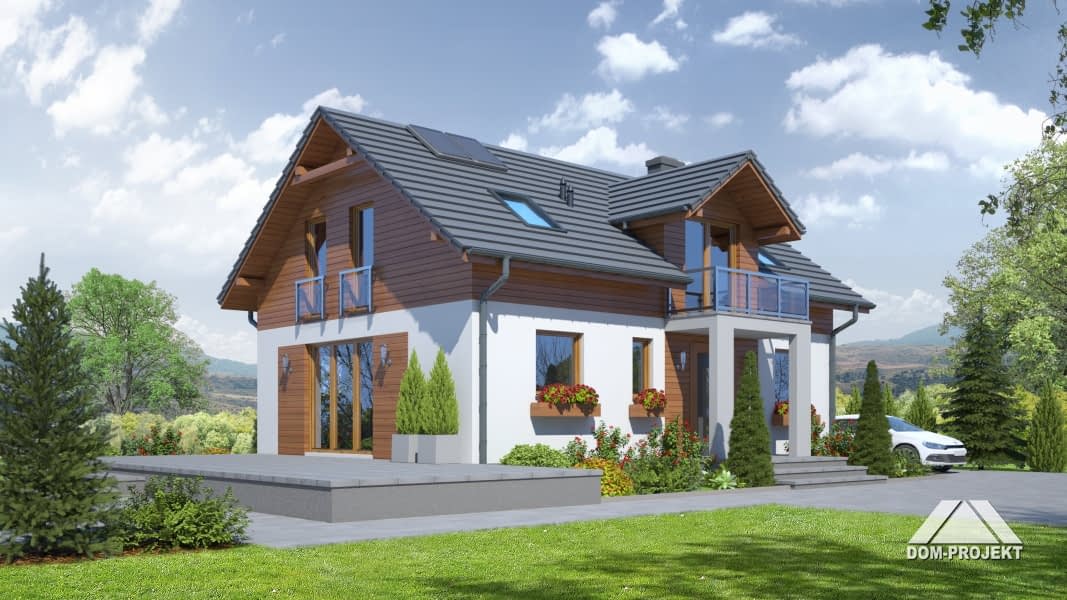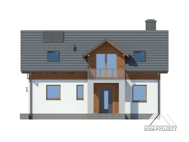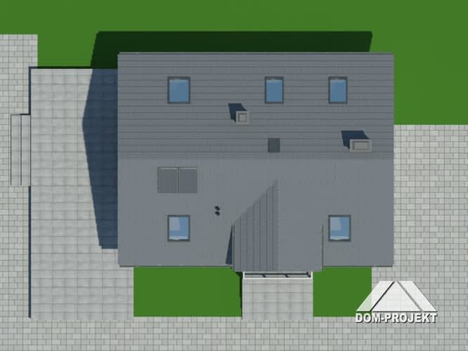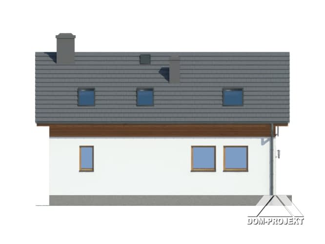 Dom z poddaszem. Duży salon z aneksem kuchennym, kominkiem i wyjściem na taras. Pokój, łazienka, wiatrołap, komunikacja i spiżarka. Na poddaszu trzy pokoje, łazienka, garderoba, schowek i komunikacja. Zwarta bryła budynku i dach dwuspadowy sprzyjają szybkiej i taniej budowie i niskim kosztom eksploatacji.Rzuty