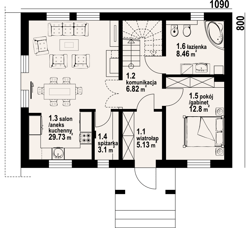 - 1.3 - salon z aneksem kuchennym29.73 m²