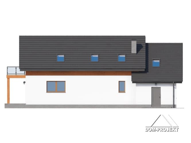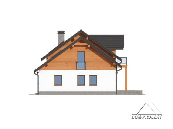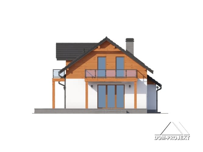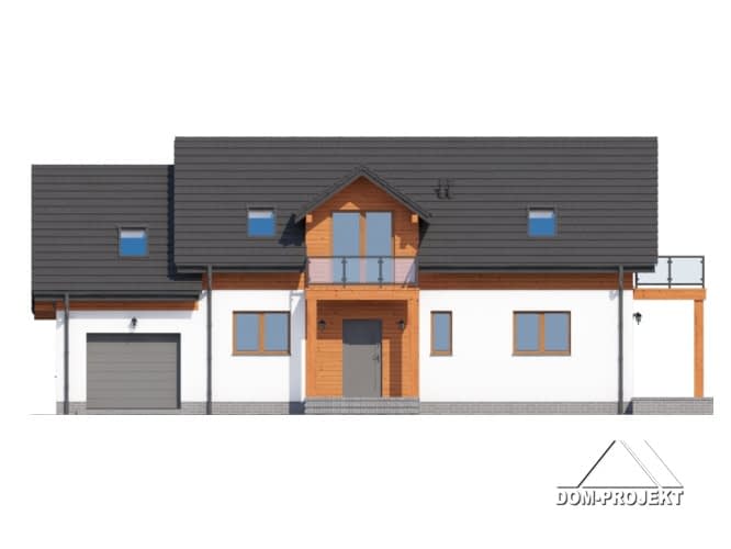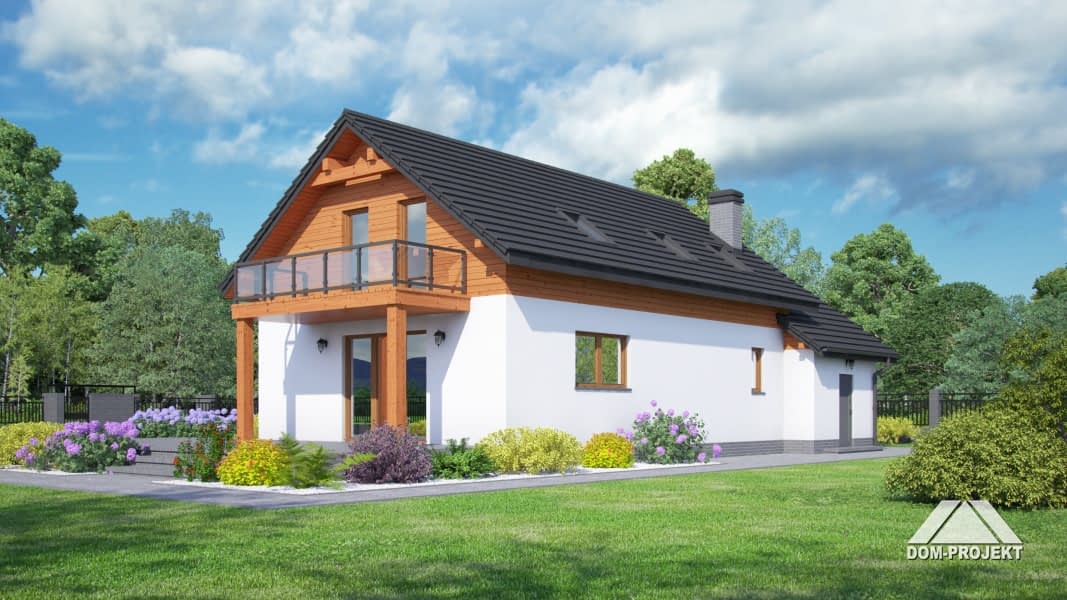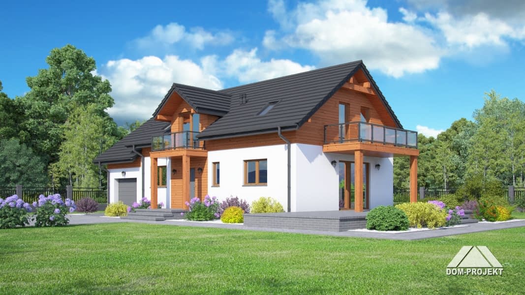 Dom w konstrukcji szkieletu drewnianego. Duży salon z aneksem kuchennym i wyjściem na zadaszony taras. Pokój, gabinet, łazienka, spiżarka, komunikacja, wiatrołap, garaż, kotłownia. Na poddaszu cztery pokoje, łazienka, garderoba, pralnia i balkon. Zwarta bryła buku i dach dwuspadowy sprzyjają szybkiej i taniej budowie i niskim kosztom eksploatacji.Rzuty