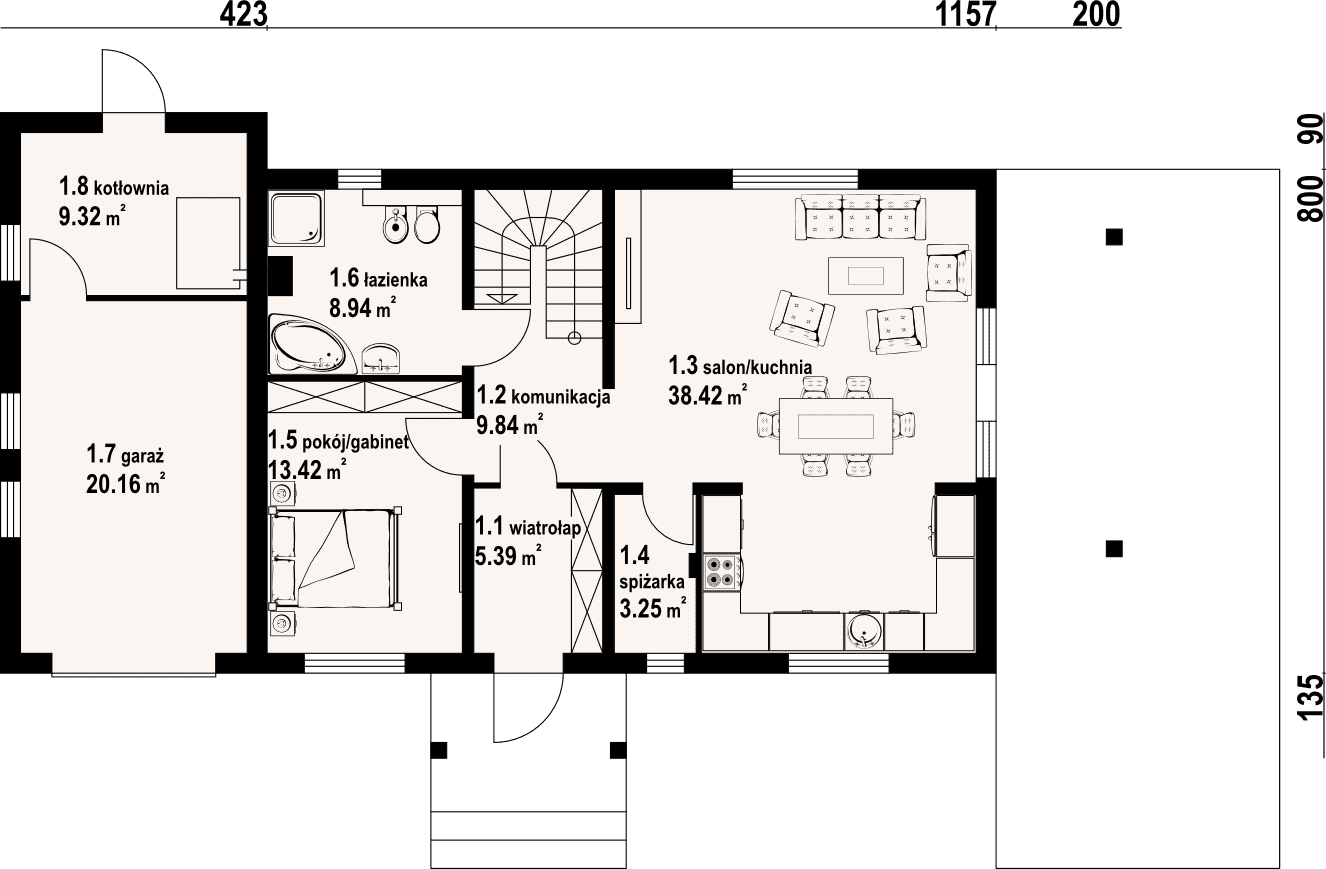 - 1.3 - kuchnia, salon38.42 m²