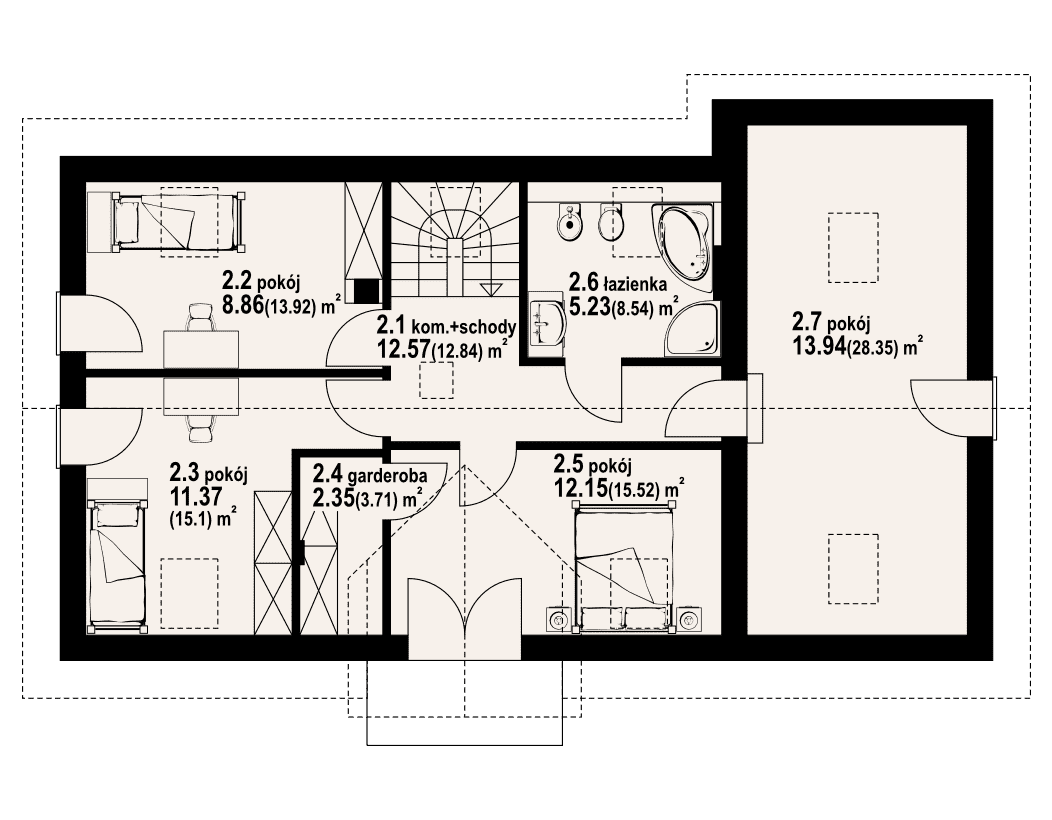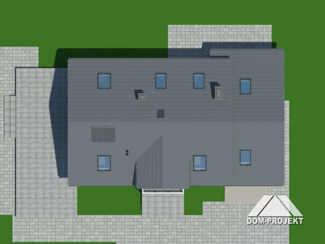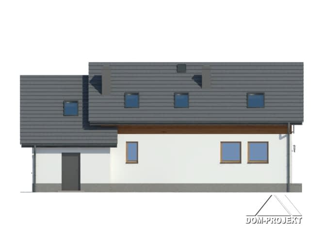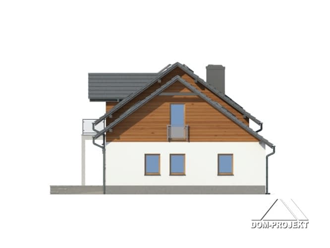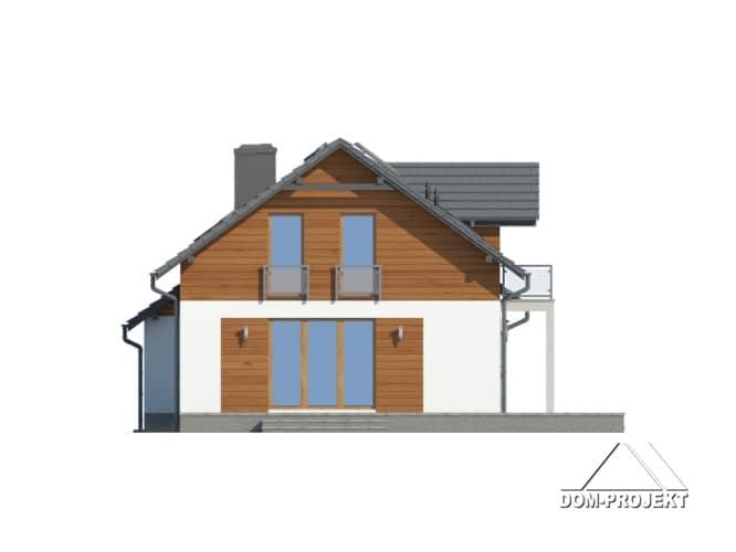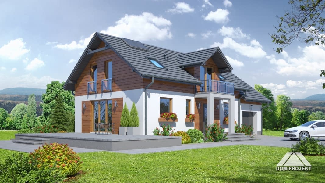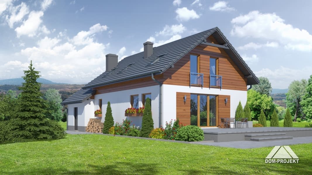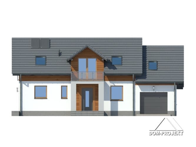 Dom z poddaszem, garażem i kotłownią Duży salon z aneksem kuchennym, kominkiem i wyjściem na taras. Pokój, łazienka, wiatrołap, komunikacja i spiżarka. Garaż i kotłownia. Na poddaszu cztery pokoje, łazienka, garderoba i komunikacja. Zwarta bryła budynku i dach dwuspadowy sprzyjają szybkiej i taniej budowie i niskim kosztom eksploatacji.Rzuty