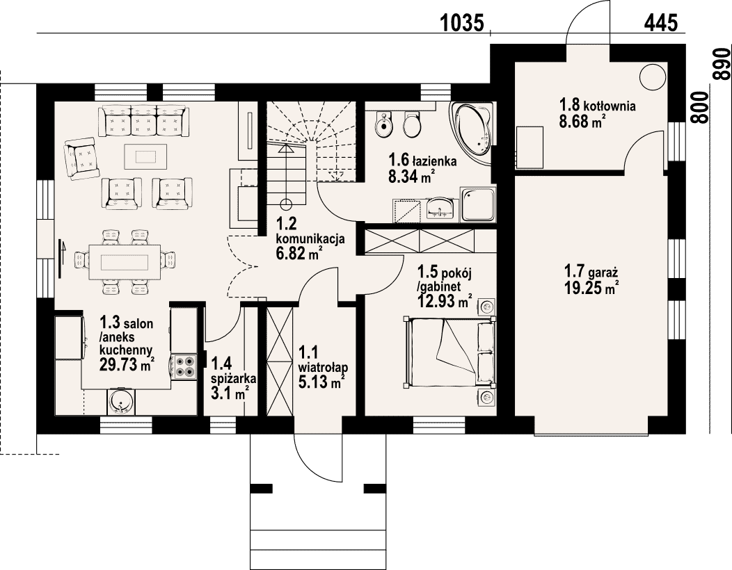 - 1.3 - salon z aneksem kuchennym29.73 m²
