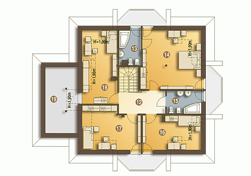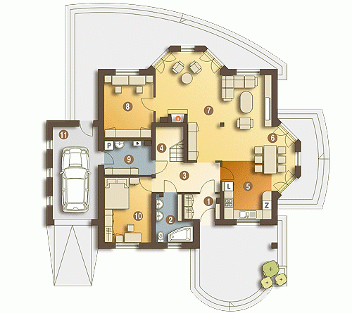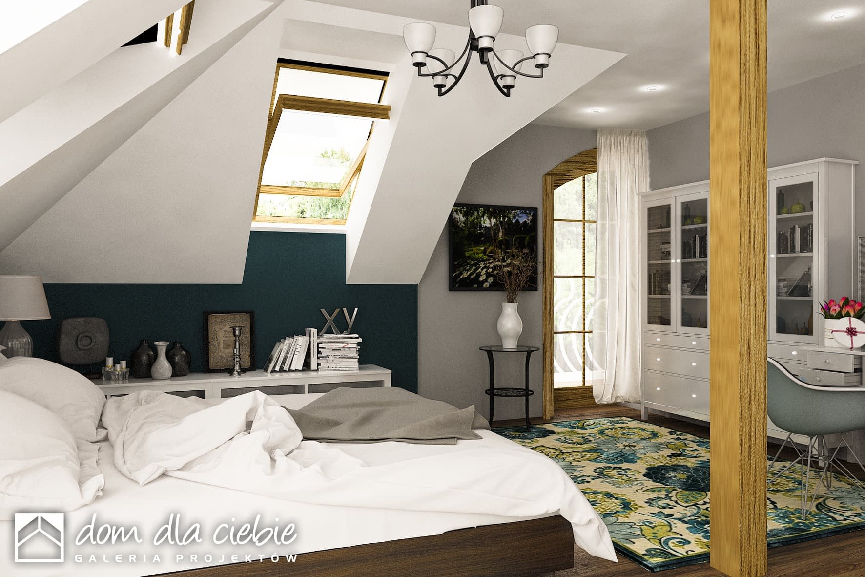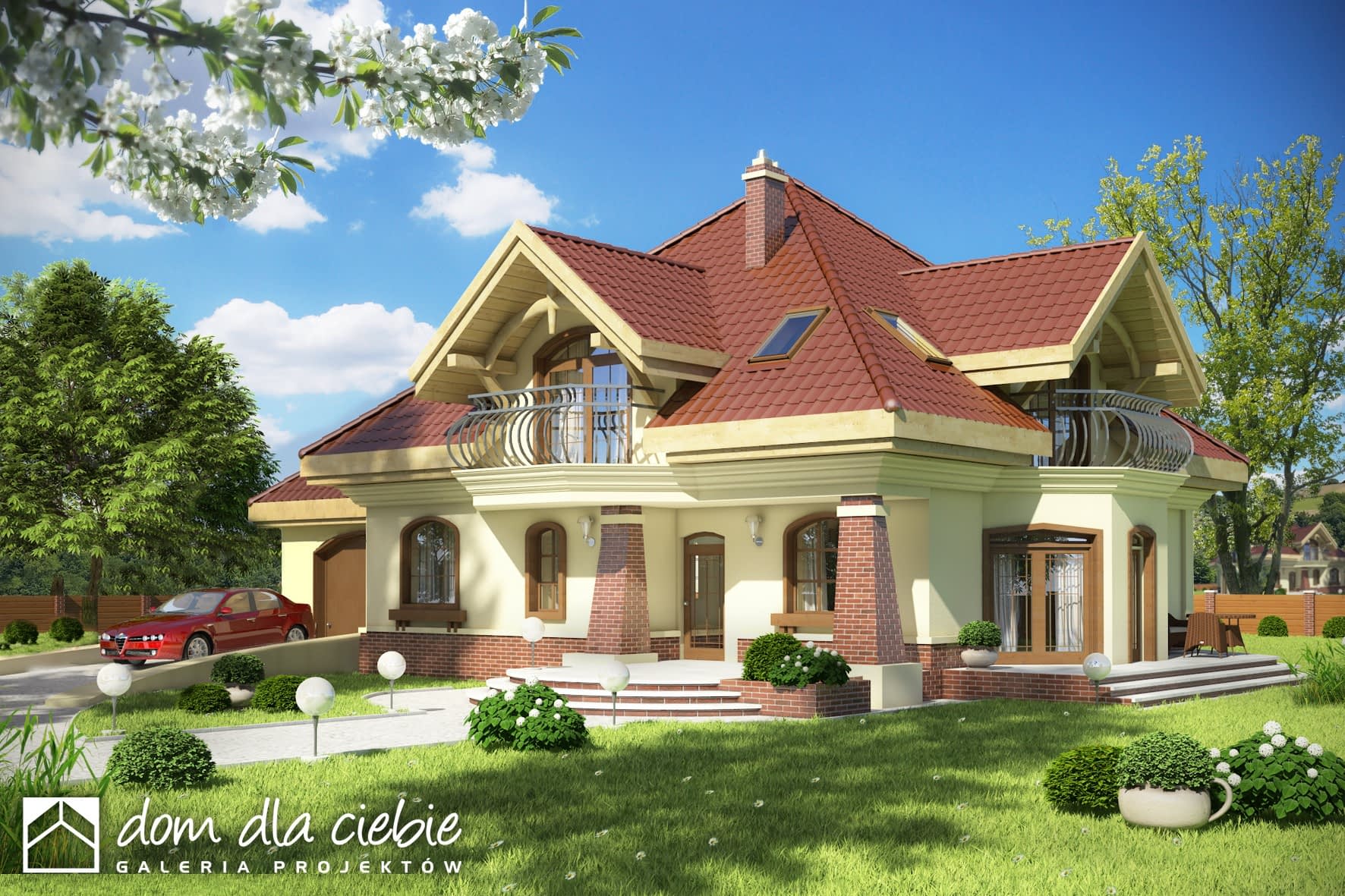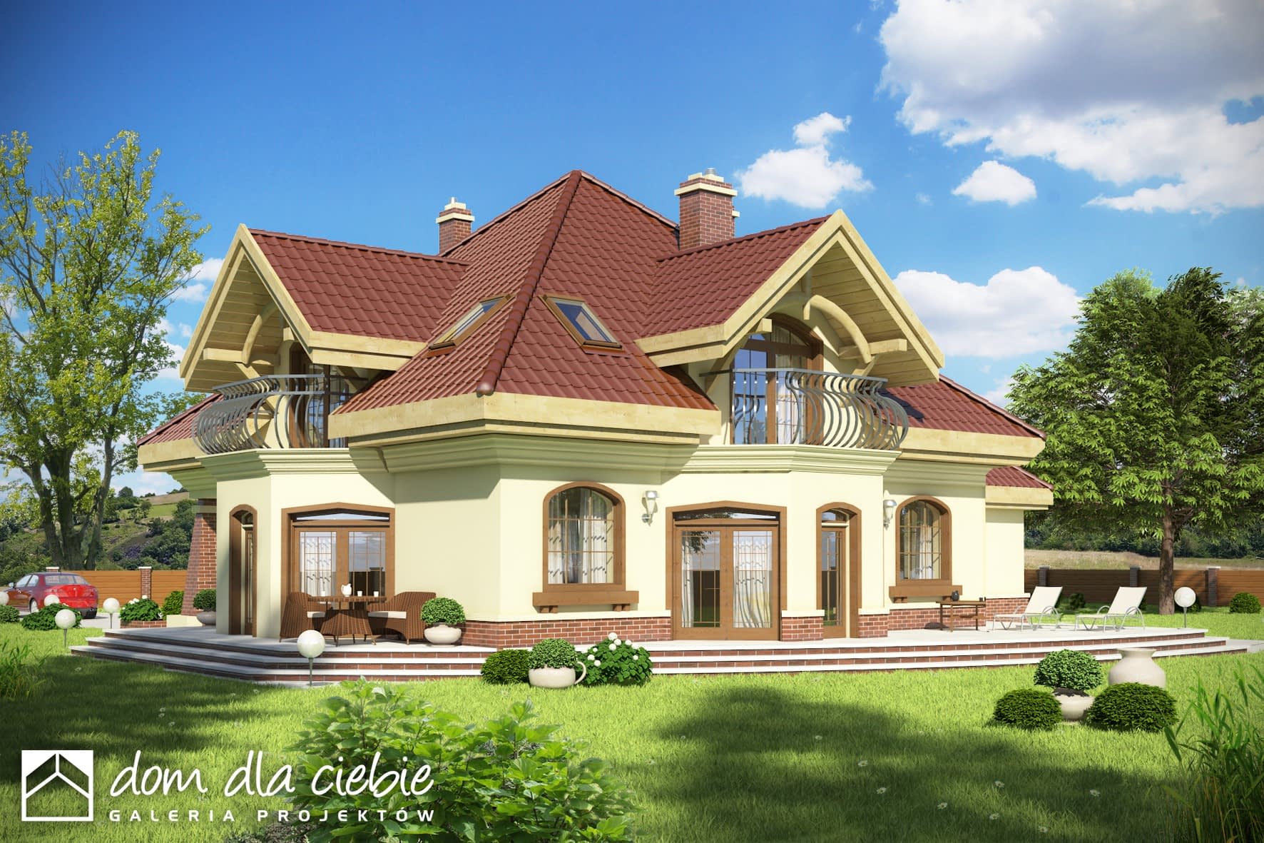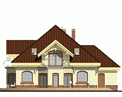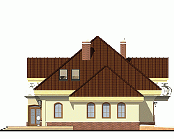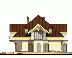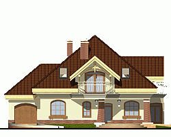 Reprezentacyjny, wytworny, rodzinny dom piętrowy dla 5-7-cio osobowej rodziny. Przewidziany układ funkcjonalny rozdziela przestrzeń ogólnodostępną, zlokalizowaną na parterze od części sypialnej, znajdującej się na piętrze. Parter obejmuje salon z kuchnią i jadalnią, pokój gościnny, pokój komputerowy, łazienkę oraz hol ze schodami i wiatrołap. W parterze przewidziano również pomieszczenie techniczne z piecem CO przejściowe do dużego dobudowanego garażu jednostanowiskowego. Piętro dostępne przez wygodne schody to przestrzeń obejmująca hol, cztery wygodne pokoje sypialne oraz dwie łazienki ( jedna połączona z sypialnią rodziców). Przestrzeń nad garażem dostępna przez piętro budynku mieszkalnego przeznacza się na cele gospodarcze.