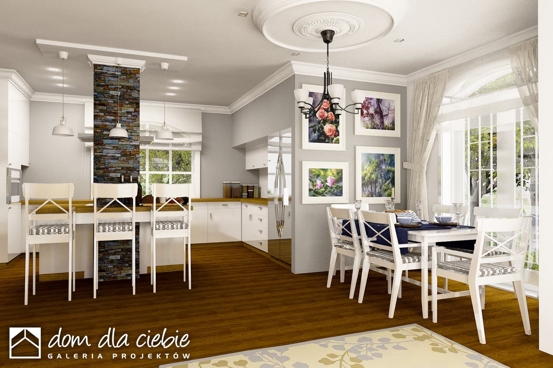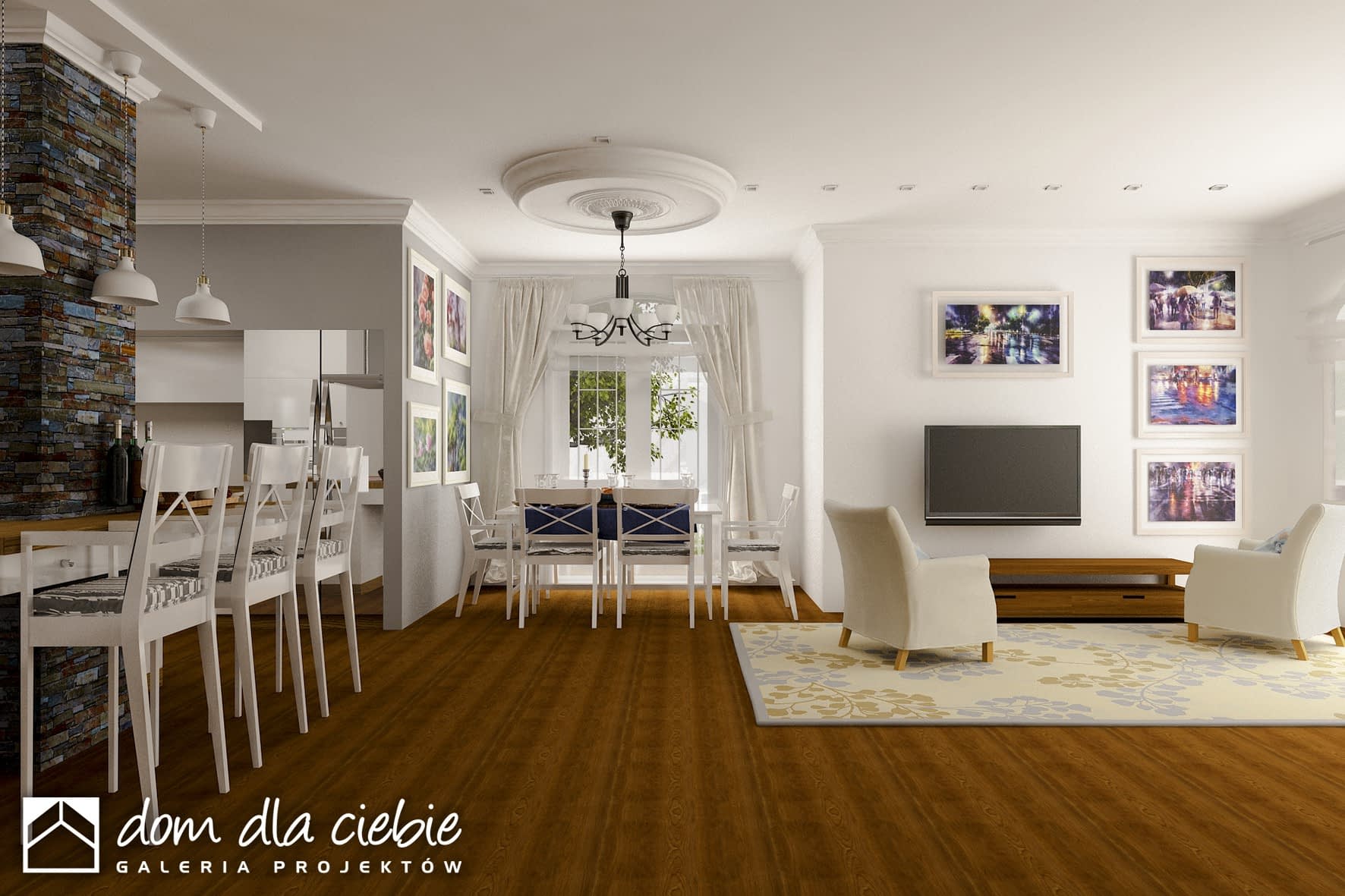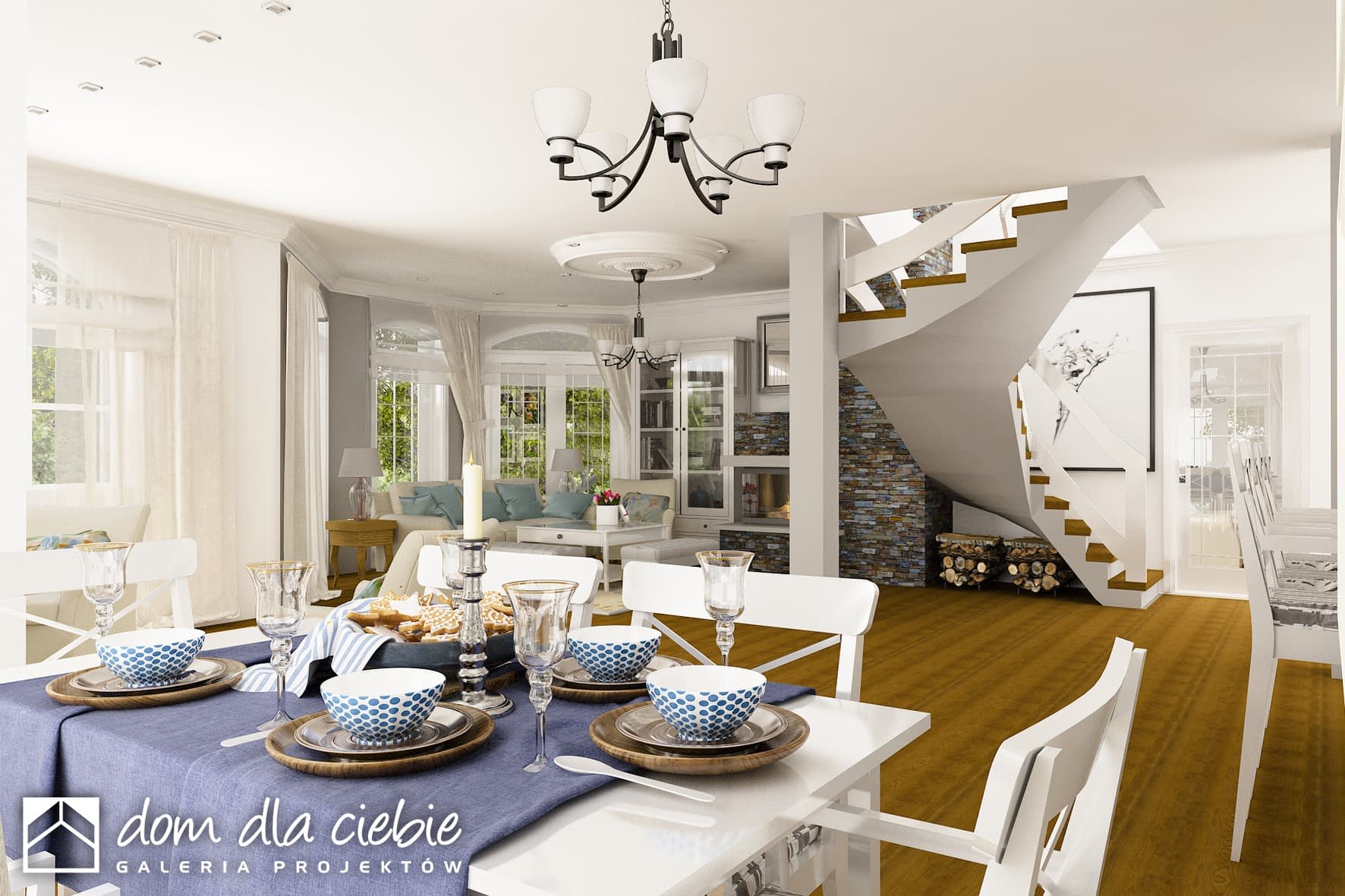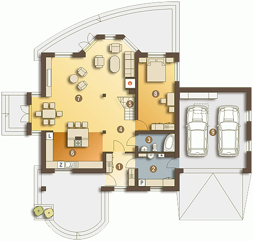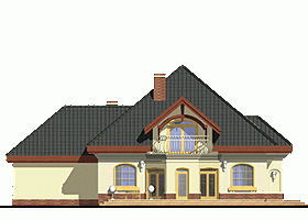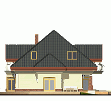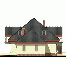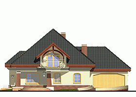 Reprezentacyjny, wytworny, rodzinny dom piętrowy dla 5-7-cio osobowej rodziny. Przewidziany układ funkcjonalny rozdziela przestrzeń ogólnodostępną, zlokalizowaną na parterze od części sypialnej, znajdującej się na piętrze. Parter obejmuje salon, dużą kuchnię z tzw.wyspą i jadalnią, pokój gościnny, łazienkę oraz hol z eleganckimi schodami i wiatrołap. W parterze przewidziano również pomieszczenie techniczne z piecem CO przejściowe do dobudowanego garażu dwu-stanowiskowego. Piętro dostępne przez wygodne schody to przestrzeń obejmująca hol, cztery wygodne pokoje sypialne oraz dwie łazienki ( jedna połączona z sypialnią rodziców). Przestrzeń nad garażem dostępna przez wyłaz stropowy przeznacza się na cele gospodarcze.