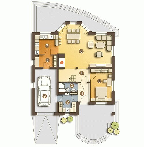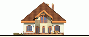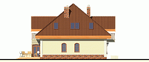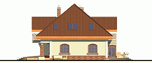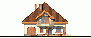 Rodzinny dom piętrowy dla 5-6-cio osobowej rodziny. Przewidziany układ funkcjonalny rozdziela przestrzeń ogólnodostępną, zlokalizowaną na parterze od części sypialnej, znajdującej się na piętrze. Parter obejmuje salon z kuchnią i jadalnią, pokój gościnny, łazienkę oraz spiżarnię przejściową z garażu, hol ze schodami i wiatrołap. W parterze przewidziano również wbudowany jednostanowiskowy garaż i pomieszczenie techniczne z piecem CO - przejściowe do wiatrołapu. Piętro dostępne przez wygodne schody to przestrzeń obejmująca hol, cztery wygodne pokoje sypialne oraz dwie łazienki ( jedna połączona z sypialnią rodziców).