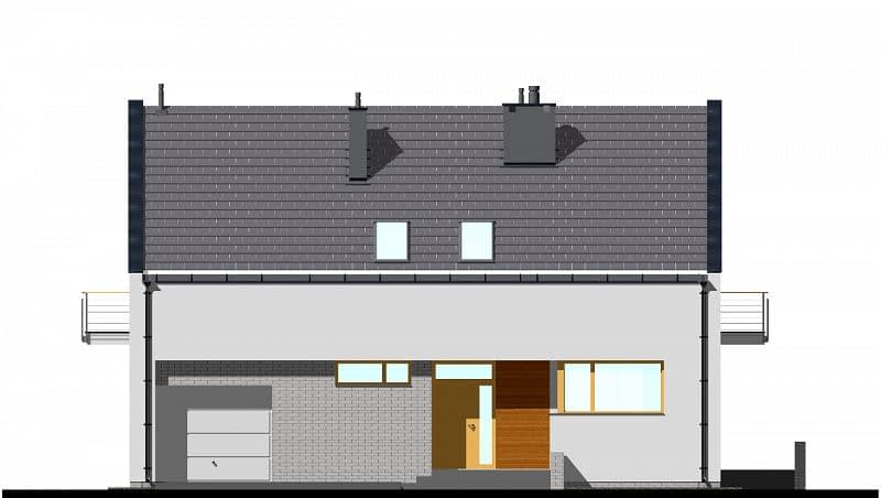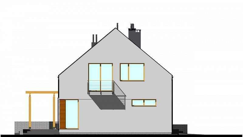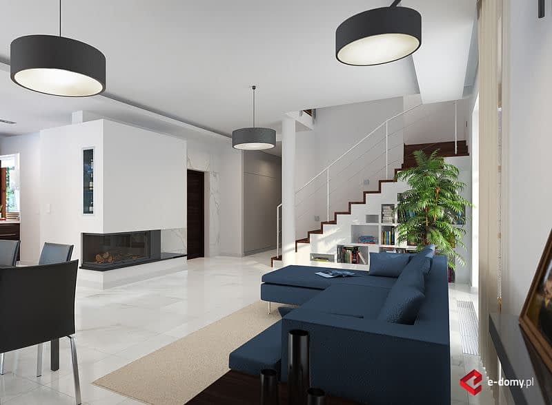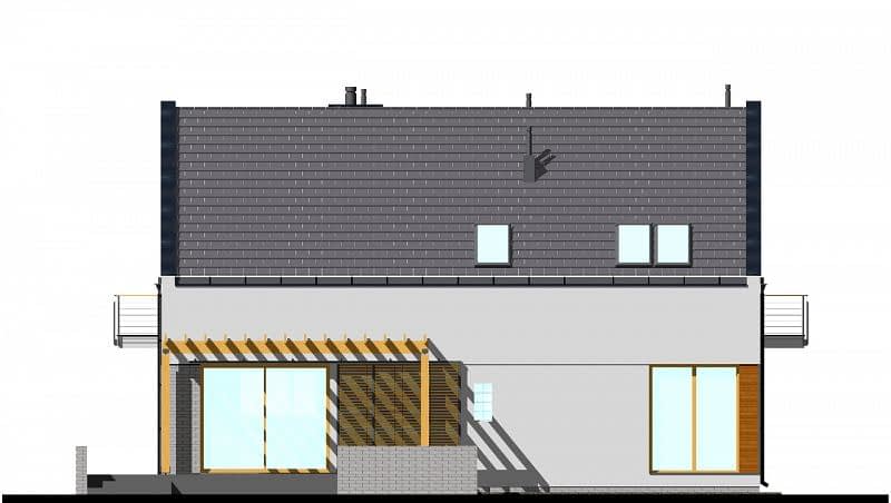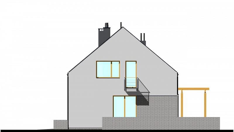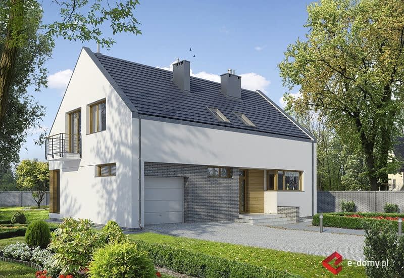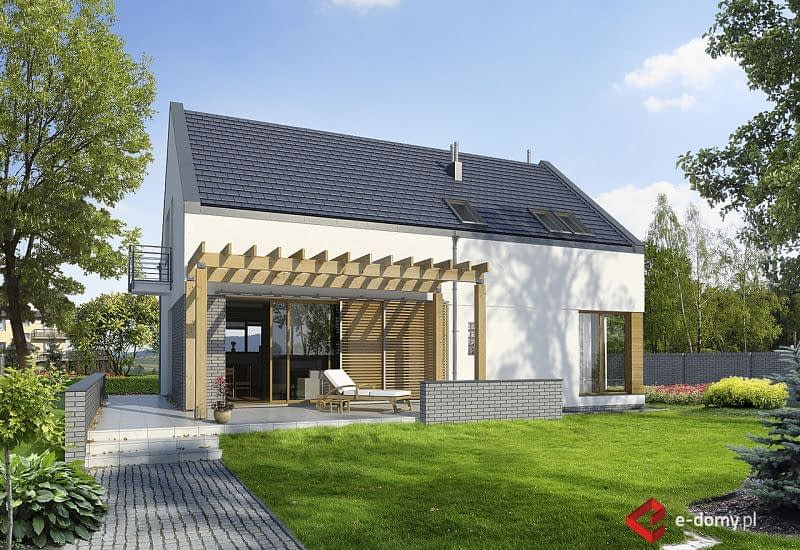 E-101 to dom o nowoczesnym wyglądzie i ładnych proporcjach. Prosta bryła budynku została urozmaicona drewnem i klinkierem oraz pergolą od strony tarasu. Na uwagę zasługuje częściowo otwarta przestrzeń nad salonem, dzięki której wnętrze domu jest przestronne i nowoczesne. Może to być np. doskonałe miejsce do pracy. Na parterze zaplanowano duży salon z jadalnią. W centralnym miejscu umieszczono kominek. Z jadalnią graniczy półotwarta kuchnia ze spiżarnią. Na tym poziomie zaprojektowano także dodatkowy pokój z funkcjonalną łazienką. Na poddaszu znajdują się trzy sypialnie, w tym jedna główna z garderobą i łazienką. Jest tutaj również obszerna łazienka dla całej rodziny. Ścianka kolankowa ma wysokość ok. 1m.