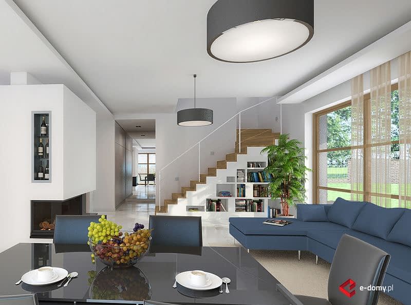 Projekt nowoczesnego domu z czterospadowym dachem i charakterystycznym podcieniem, podkreślającym wejście do domu. Dom E-105 łączy ładną, prostą bryłę z uniwersalnym układem funkcjonalnym. Dach bez lukarn, podkreśla nowoczesny charakter domu, a jednocześnie jest łatwy w budowie. Na parterze zaplanowano przestronny salon z jadalnią. W centralnym miejscu umieszczono kominek. Z jadalnią graniczy półotwarta kuchnia. Na poddaszu (ze ściankami kolankowymi wys. 100cm) znajdują się trzy sypialnie, w tym jedna główna z garderobą, schowkiem i osobną łazienką wyposażoną w prysznic i wannę. Dodatkowo na tym poziomie zaplanowano dużą garderobę i łazienkę dla całej rodziny oraz pralnię.