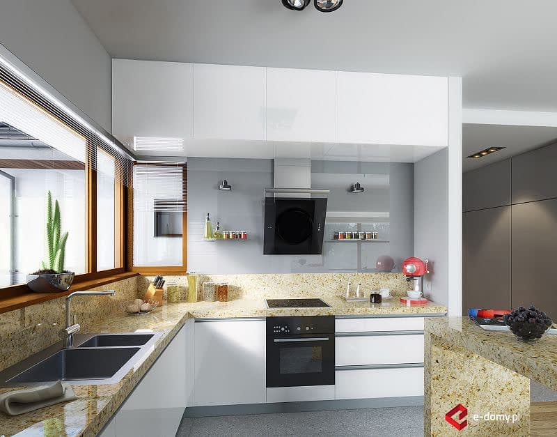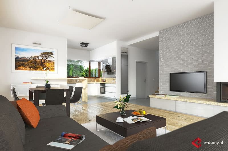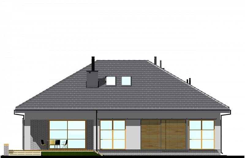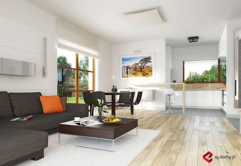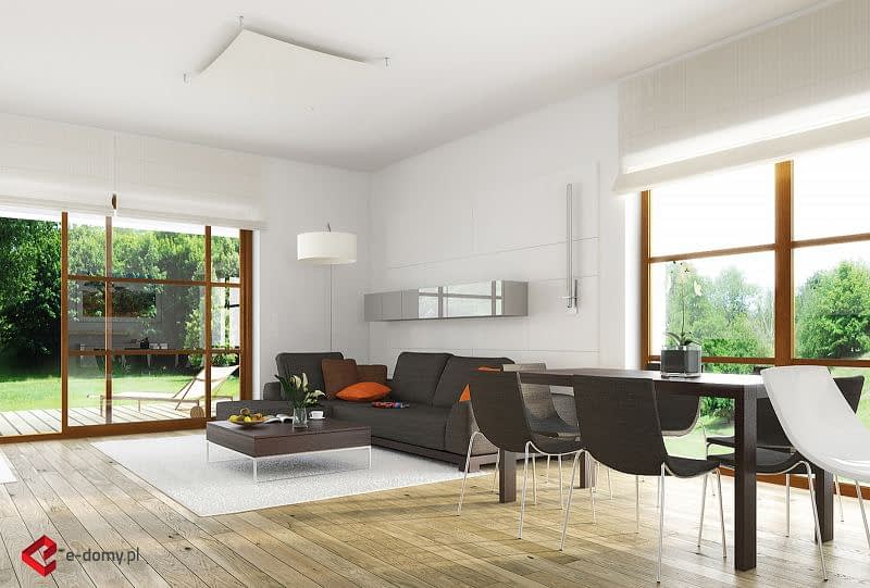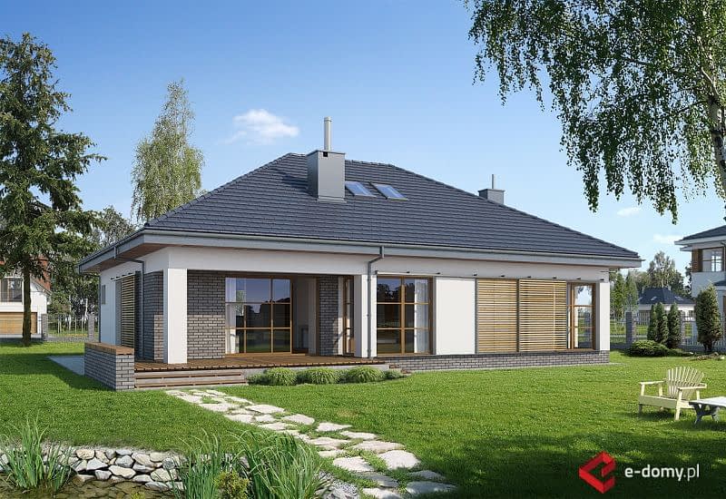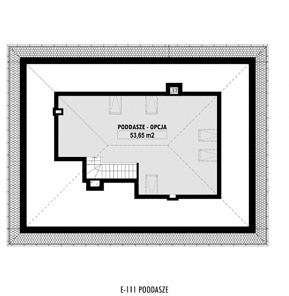 Projekt niewielkiego, nowoczesnego domu z czterospadowym dachem. Dom E-111 to prosta bryła, oparta na rzucie prostokąta i uniwersalny układ funkcjonalny. Czytelny układ funkcjonalny umożliwią podział domu na część dzienną i nocną. Atutem domu jest garaż umieszczony w bryle, oraz bardzo łatwa możliwość zaadaptowania poddasza. W części dziennej zaplanowano salon z jadalnią oraz półotwartą kuchnię ze spiżarnią. W części sypialnej zaplanowano dwie sypialnie, WC oraz łazienkę z wanną i prysznicem. Na poddaszu pokazujemy wariantową powierzchnię możliwą do zaadaptowania. Dla zobrazowania jej wielkości, na rysunku podano powierzchnię netto poddasza, tj. po obrysie ścian. W zakładce \\\"Pliki do pobrania\\\" prezentujemy naszą propozycję podziału poddasza, które można zaadaptować, w ramach adaptacji projektu.