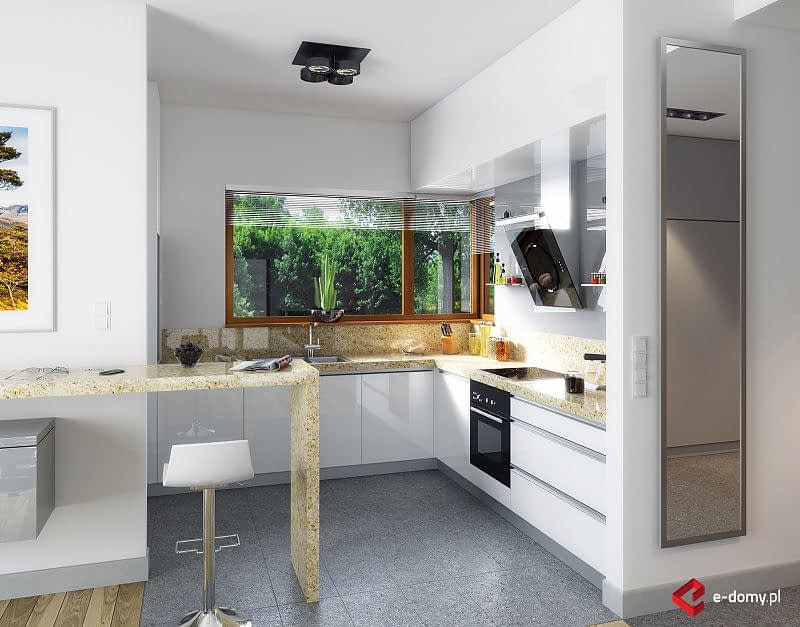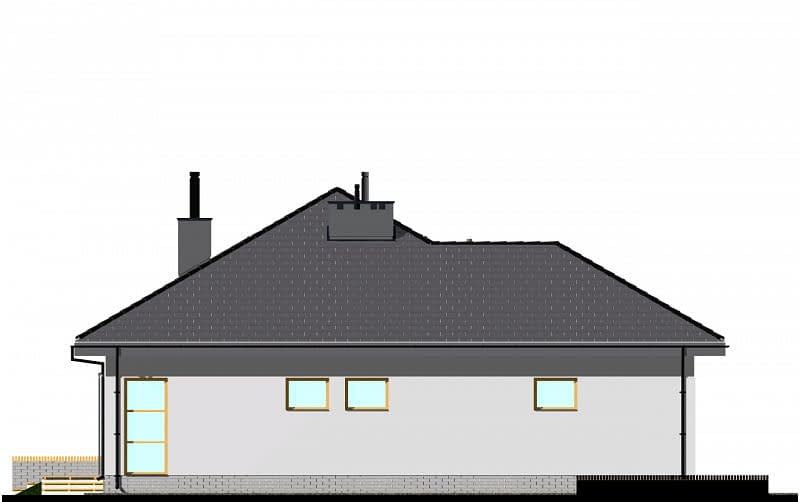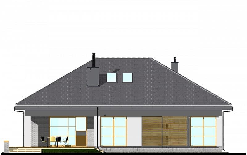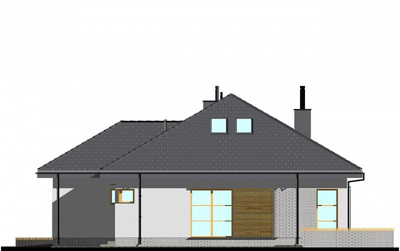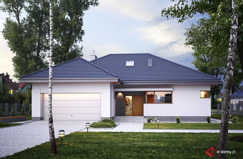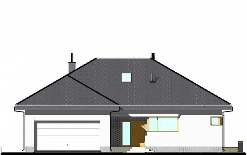 Projekt nowoczesnego domu parterowego z czterospadowym dachem, z dwustanowiskowym garażem. Prosta bryła połączona z uniwersalnym układem funkcjonalnym. Atutem domu jest łatwa możliwość zaadaptowania poddasza. W części dziennej zaplanowano salon z jadalnią oraz półotwartą kuchnię ze spiżarnią. W części sypialnej zaplanowano dwie sypialnie, WC oraz łazienkę z wanną i prysznicem. Na poddaszu pokazujemy wariantową powierzchnię możliwą do zaadaptowania. Dla zobrazowania jej wielkości, na rysunku podano powierzchnię netto poddasza, tj. po obrysie ścian. Na rysunkach szczegółowych przedstawiliśmy naszą propozycję podziału poddasza, które można zaadaptować, w ramach adaptacji projektu.