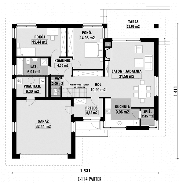 - Minimalne wymiary działki23.11 x 23.31m