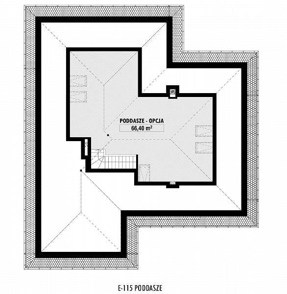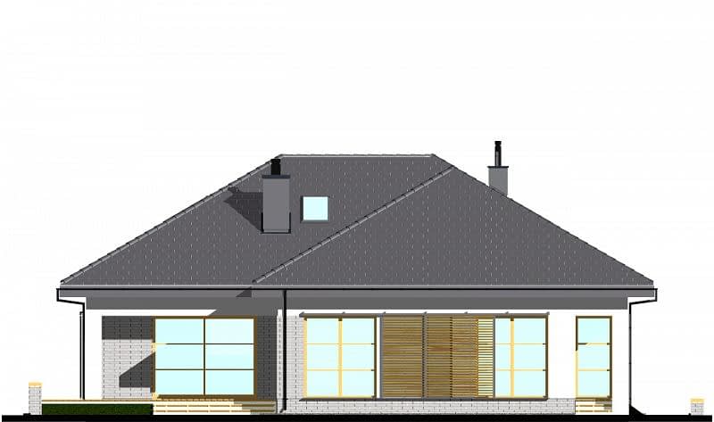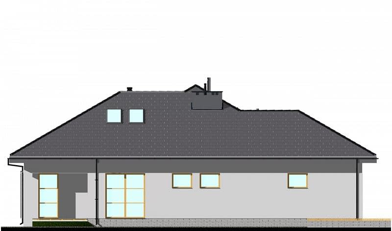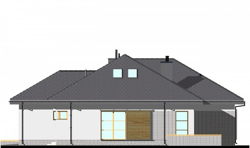 Projekt niedużego domu parterowego, z czterospadowym dachem. Funkcjonalnie dom został podzielony na trzy części. W części dziennej zaplanowano: salon z jadalnią i wyjściem na zadaszony taras oraz półotwartą kuchnię ze spiżarnią, z możliwością jej zamknięcia lub otwarcia. W tej części domu znajduje się również WC. W części sypialnej znajdują się: obszerna łazienka z wanną i prysznicem, garderoba oraz trzy sypialnie. Każda sypialnia ma możliwość wyjścia na taras. Na poddaszu pokazujemy wariantową powierzchnię do zaadaptowania (podano powierzchnię po obrysie ścian). Układ schodów, pozwala na bezkolizyjną adaptację poddasza, nawet po zakończeniu budowy.