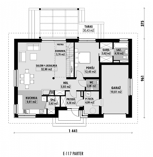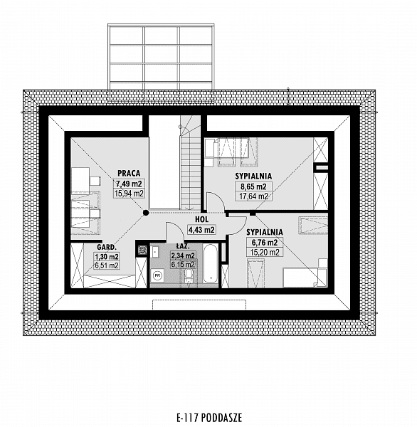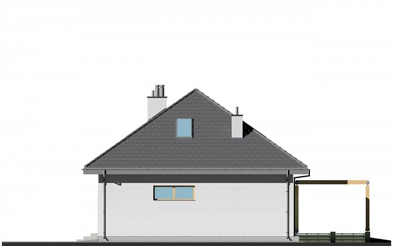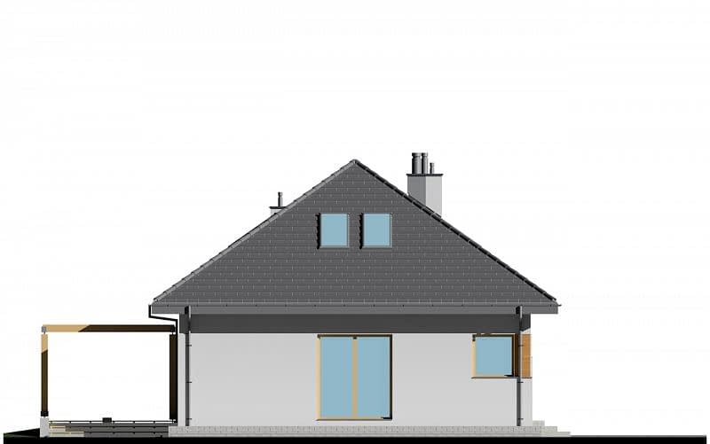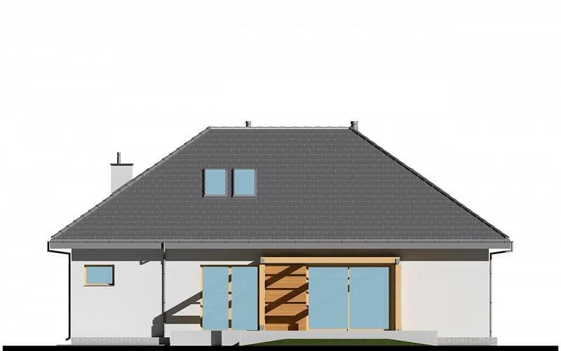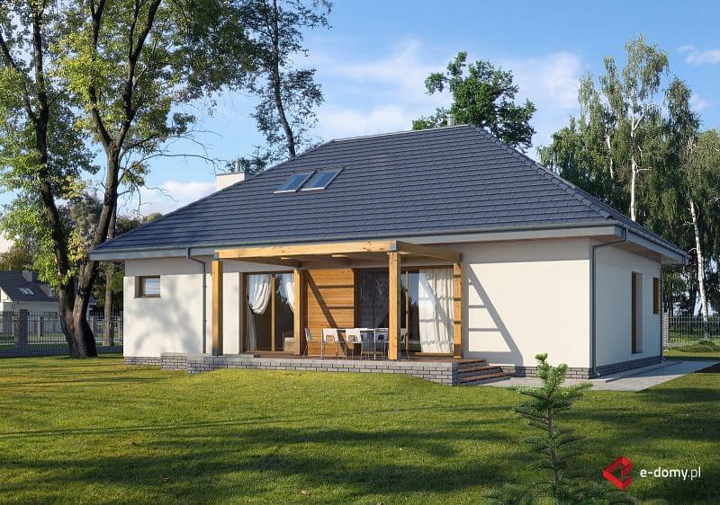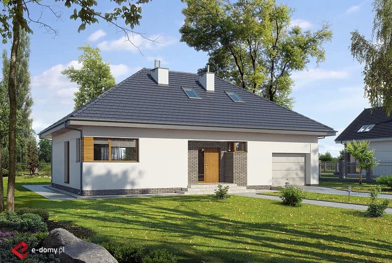 Niewielki dom z prostym, czterospadowym dachem, który zapewni wygodę mieszkania dla 4-5 osobowej rodziny. W części dziennej zaplanowano salon, jadalnię oraz półotwartą kuchnię ze spiżarnią. Część sypialna składa się z jednej dużej sypialni, znajdującej się na parterze oraz dwóch mniejszych zlokalizowanych na poddaszu. Na antresoli stworzyliśmy miejsce do pracy dla 2 osób. Dostępna jest również podobna wersja projektu z garażem dwustanowiskowym E-129.