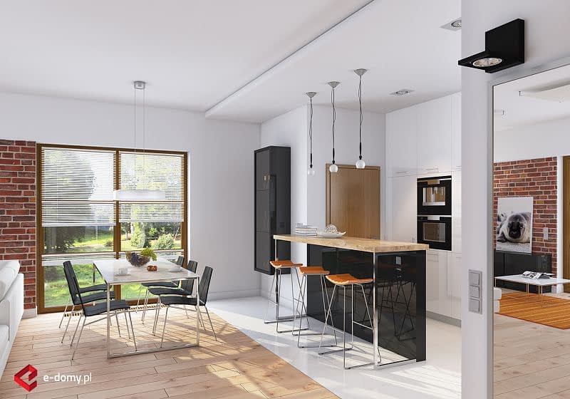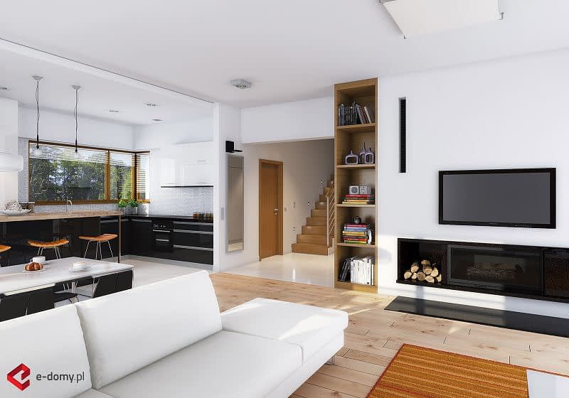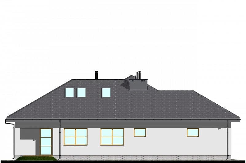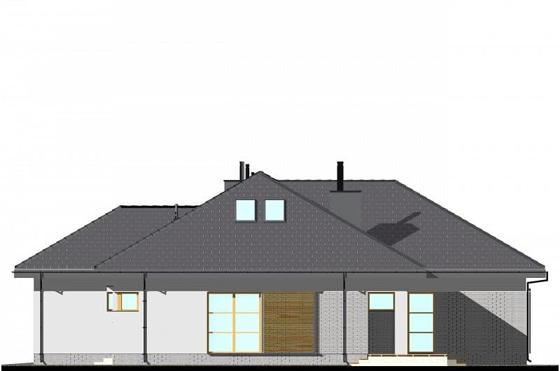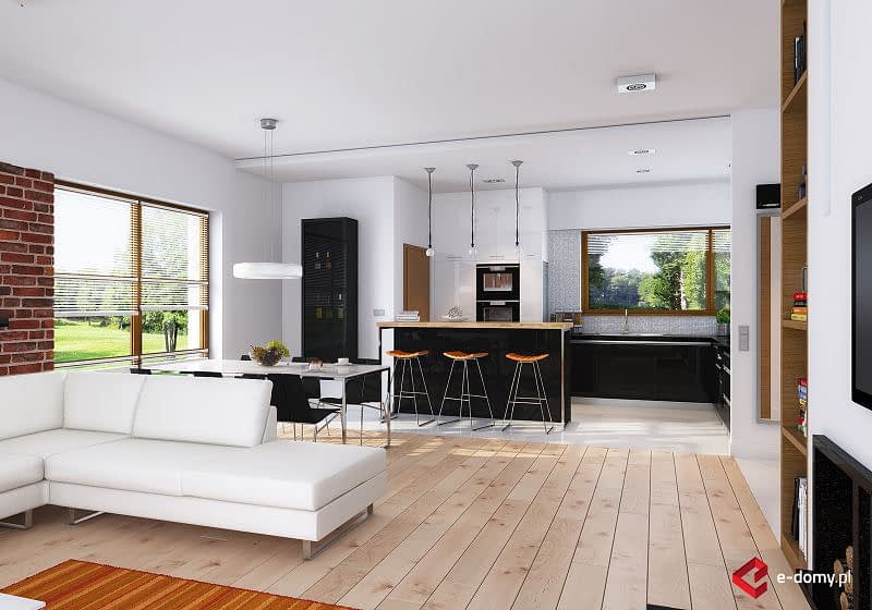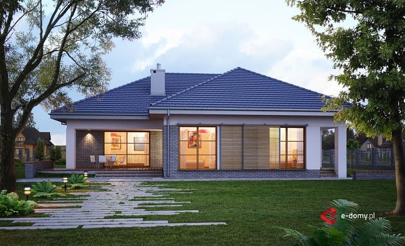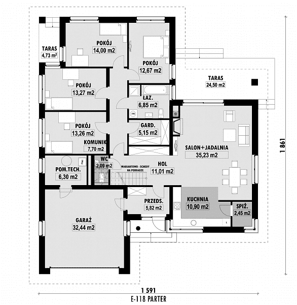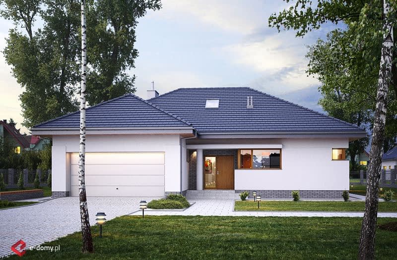 Projekt komfortowego domu E-118 należy do rodziny projektów E-114 do E-119. Prosta bryła połączona z uniwersalnym układem funkcjonalnym i dwustanowiskowym garażem. W części dziennej zaplanowano duży salon z jadalnią (szerszy o 60cm w stosunku do E-115/116) i półotwartą kuchnię ze spiżarnią. W części sypialnej: cztery sypialnie, WC oraz duża łazienka z wanną i prysznicem. Wysokość pomieszczeń parteru wynosi 2,95m. Atutem domu jest też duża garderoba. Na poddaszu pokazujemy powierzchnię możliwą do zaadaptowania. Dla zobrazowania jej wielkości, na rysunku podano powierzchnię netto poddasza, tj. po obrysie ścian.