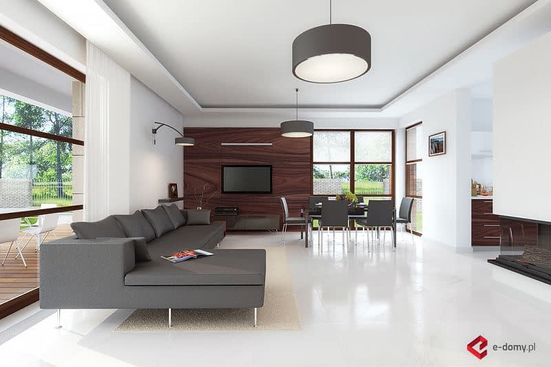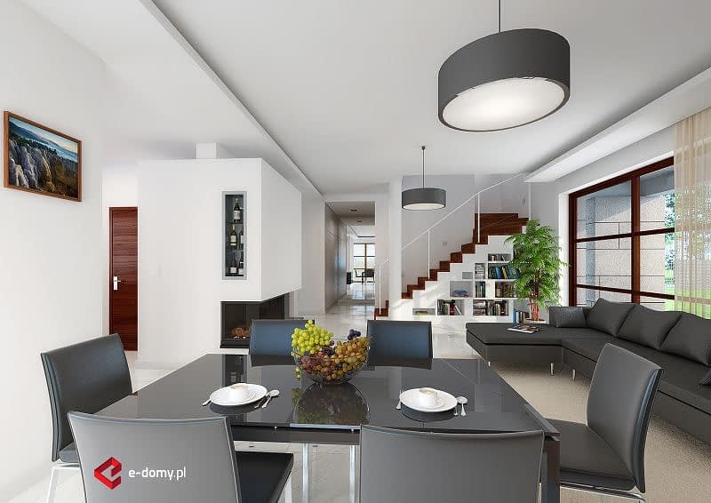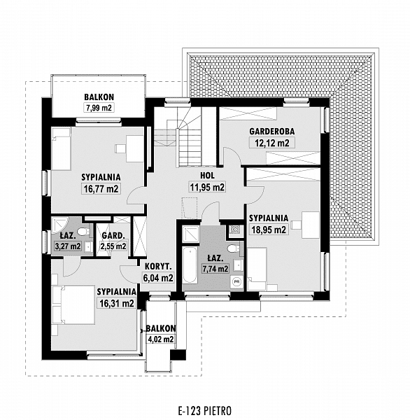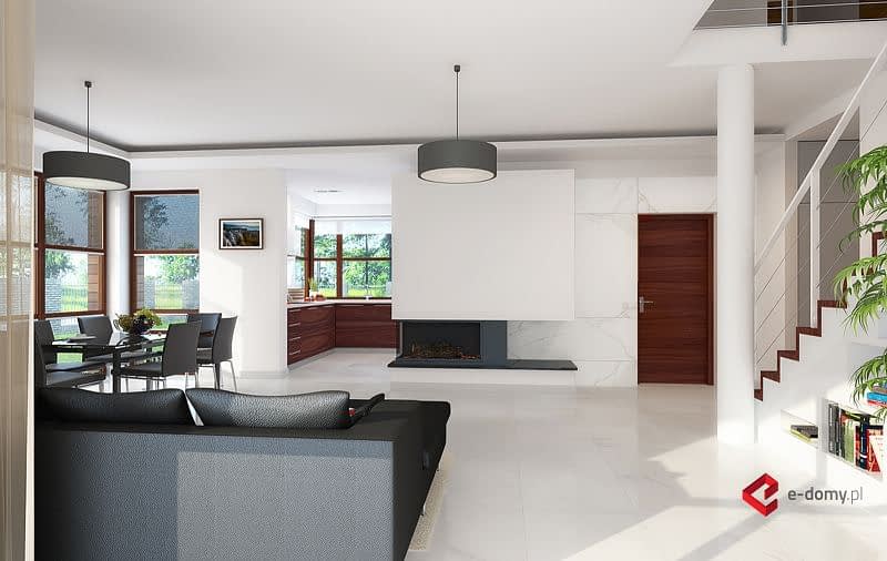 E-123 to nieco powiększona wersja projektu E-122, z dodatkową z łazienką i garderobą przy sypialni na piętrze, kosztem tarasu nad garażem. Na parterze zaplanowano przestronny salon z jadalnią. W centralnym miejscu umieszczono kominek. Z jadalnią graniczy półotwarta kuchnia ze spiżarnią. Na parterze zaplanowano również dodatkowy pokój z niewielką łazienką z prysznicem. Na piętrze znajdują się trzy sypialnie, jedna z łazienką i garderobą oraz duża garderoba i łazienka dla całej rodziny.