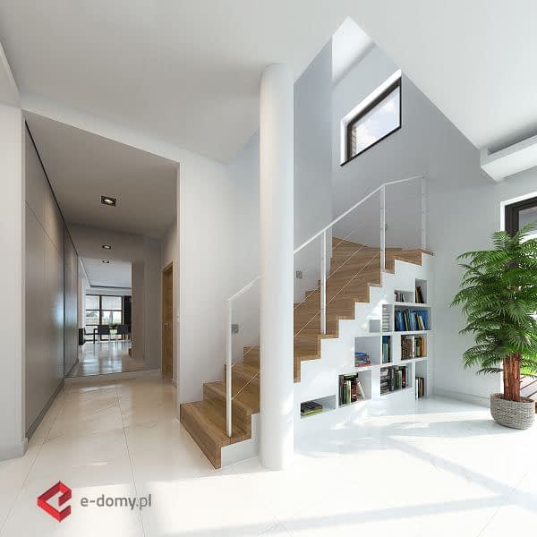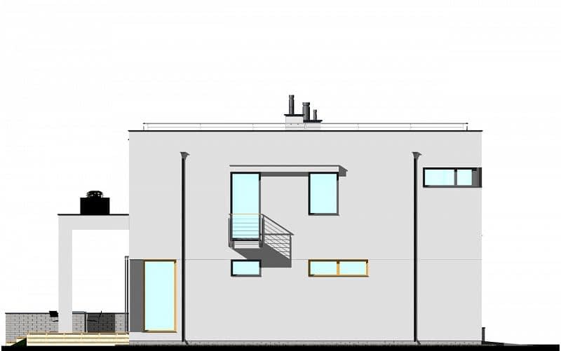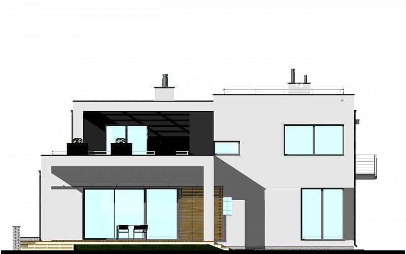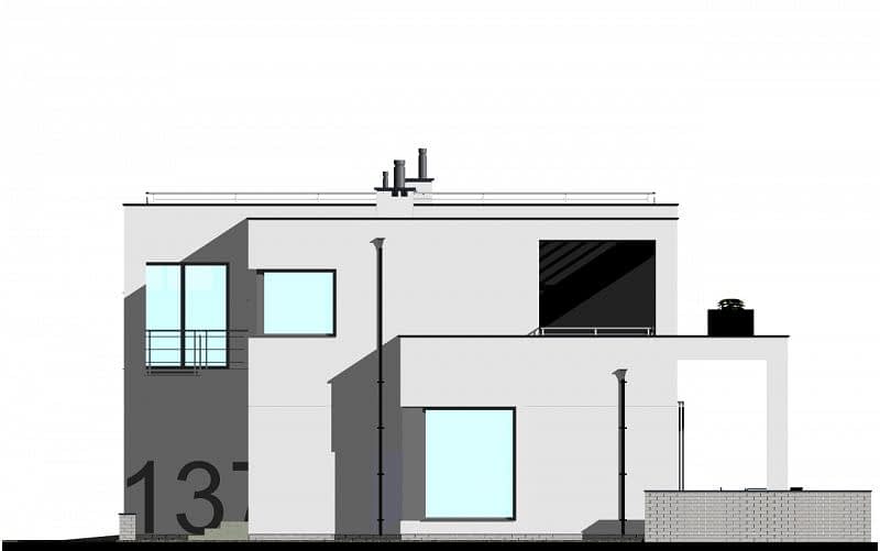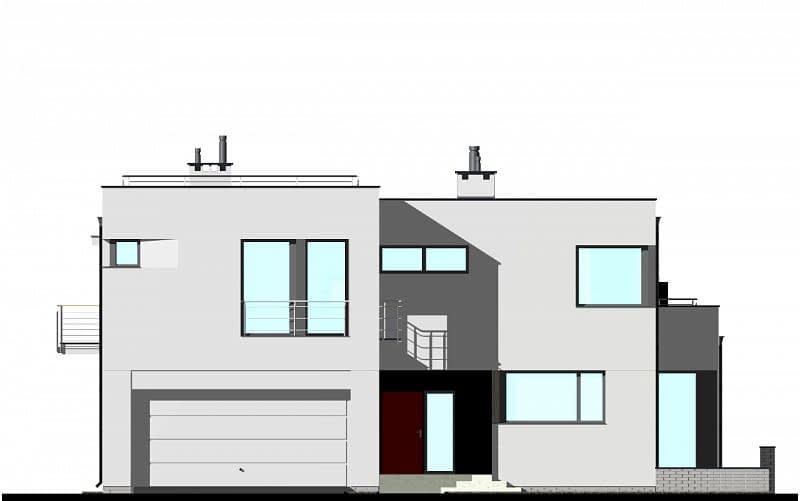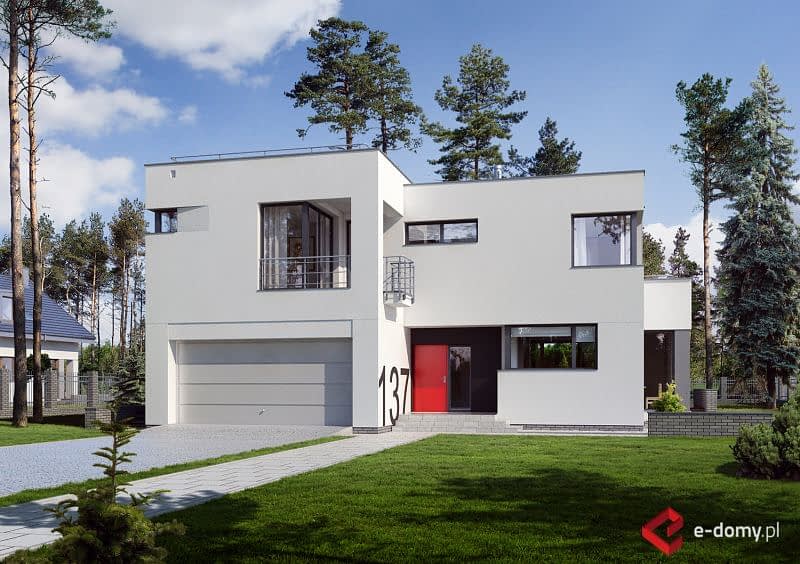 Projekt nowoczesnego domu z dwustanowiskowym garażem, nawiązującego formą do przykładów architektury okresu międzywojennego. W części dziennej zaplanowano salon z jadalnią oraz półotwartą kuchnię. W centralnym miejscu umieszczono kominek. Na parterze zaplanowano również dodatkowy pokój z niewielką łazienką z prysznicem. Na piętrze znajdują się trzy sypialnie, jedna z łazienką i garderobą, oddzielna pralnia oraz duża łazienka dla całej rodziny.