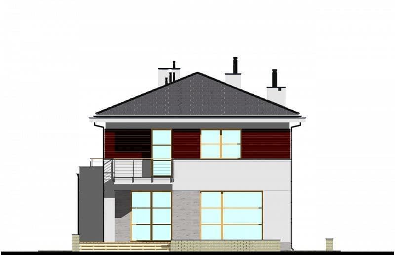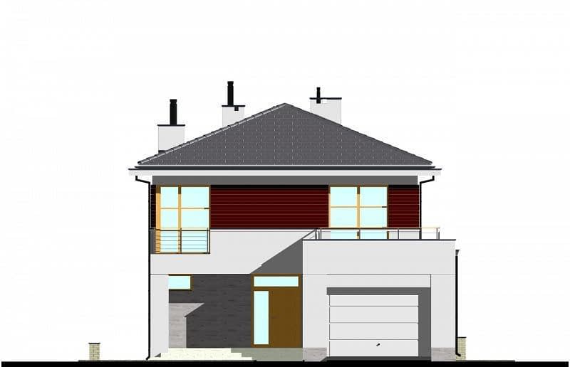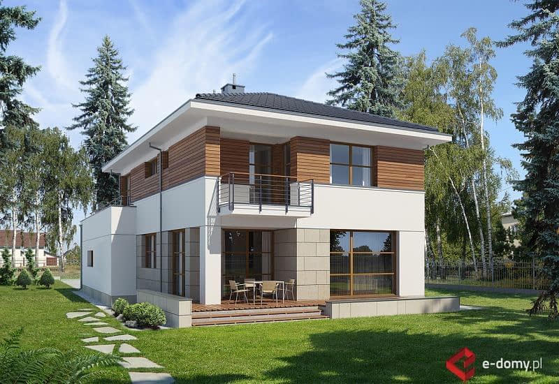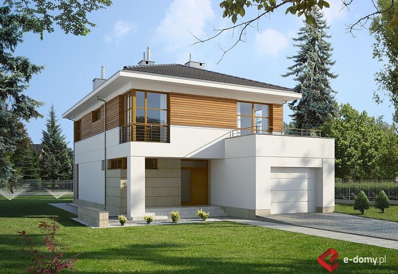 Projekt domu piętrowego z czterospadowym dachem, z jednostanowiskowym garażem, przeznaczonego na wąską działkę. Na parterze zaplanowano salon z jadalnią, z której przechodzi się do kuchni. Kuchnię, w zależności od upodobań przyszłych mieszkańców, można oddzielić od salonu i jadalni. Na piętrze znajdują się trzy sypialnie, w tym jedna główna z garderobą, schowkiem i osobną łazienką. Dodatkowo na tym poziomie zaplanowano łazienkę dla reszty rodziny. Nad garażem zaprojektowano taras zewnętrzny dostępny z jednej z sypialni. UWAGA: Projekt występuje też w wersji z podwójnym garażem, jako E-109.