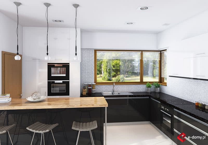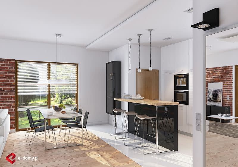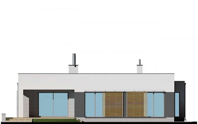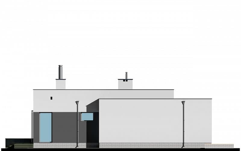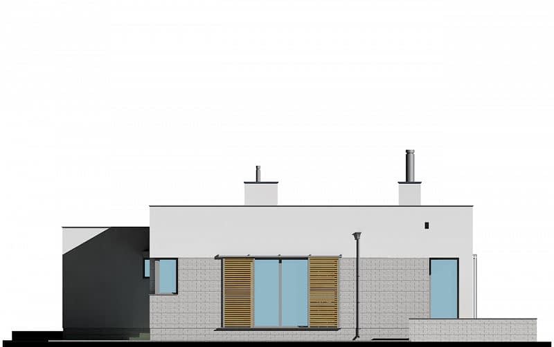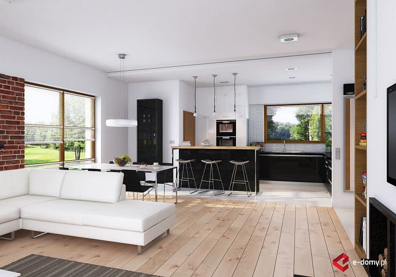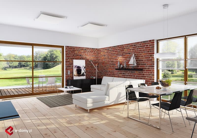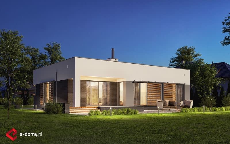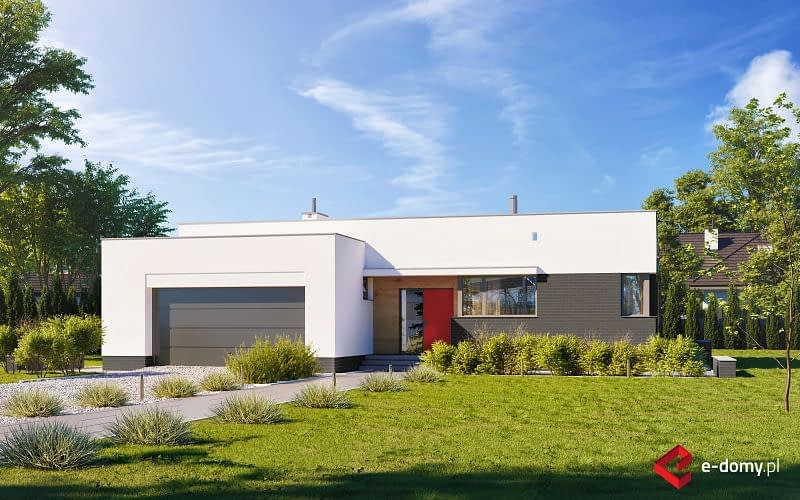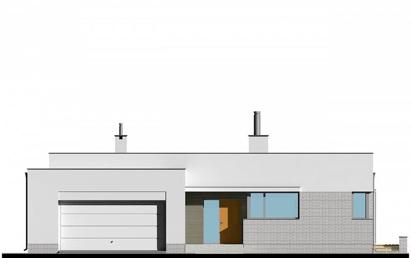 Dom parterowy z płaskim dachem. Na część dzienną składa się jednoprzestrzenny salon z jadalnią oraz kuchnia z półwyspem. Przy kuchni znajduje się praktyczna spiżarnia. Dom posiada wyraźnie zaakcentowane strefowanie pomieszczeń. Do części sypialnej (oddzielonej drzwiami) prowadzi korytarz z pojemnymi szafami po obu stronach. Następnie z niewielkiego holu drzwi prowadzą do dwóch sypialni oraz dużej łazienki z wanną. Druga, mniejsza łazienka wyposażona jest w prysznic. Dom posiada duży garaż, aby można było wygospodarować przestrzeń do przechowywania, niezbędną w domach niepodpiwniczonych.