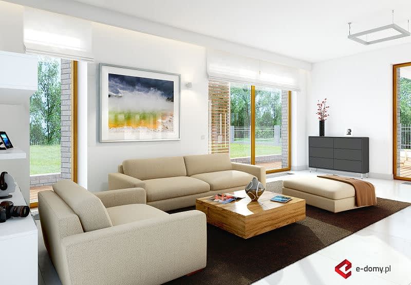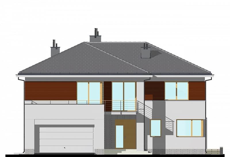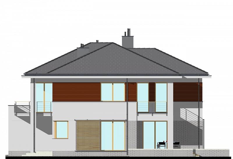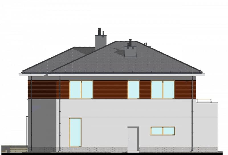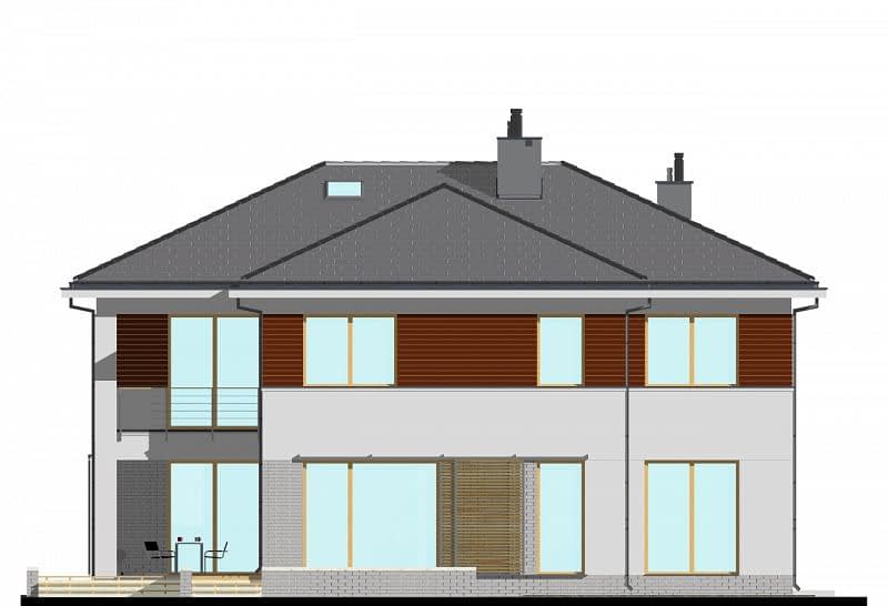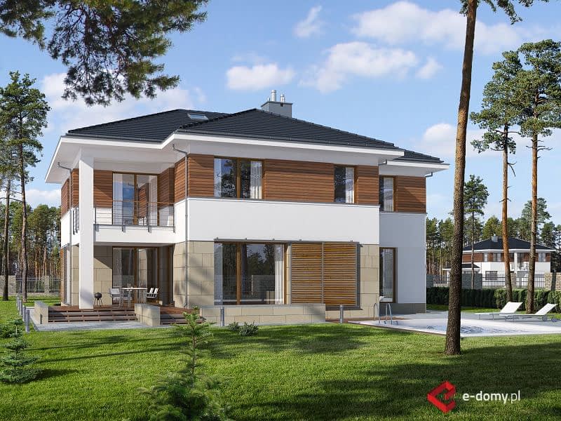 To największa rezydencja z naszej kolekcji. W projekcie zwraca uwagę duży przestronny salon o powierzchni ok. 36m2 połączony z aneksem bibliotecznym. Taras dzięki dużemu zadaszeniu i wyjściu zarówno z salonu jak i jadalni, staje się częścią wnętrza domu. Na parterze zaprojektowano także WC oraz spiżarnię, do których wejście ukryto pod schodami. Na piętrze umieszczono 4 sypialnie, w tym jedną główną z prywatną łazienką i garderobą. Dla pozostałych użytkowników zaprojektowano dużą, wspólną łazienkę i garderobę oraz pomieszczenie na pralnię.