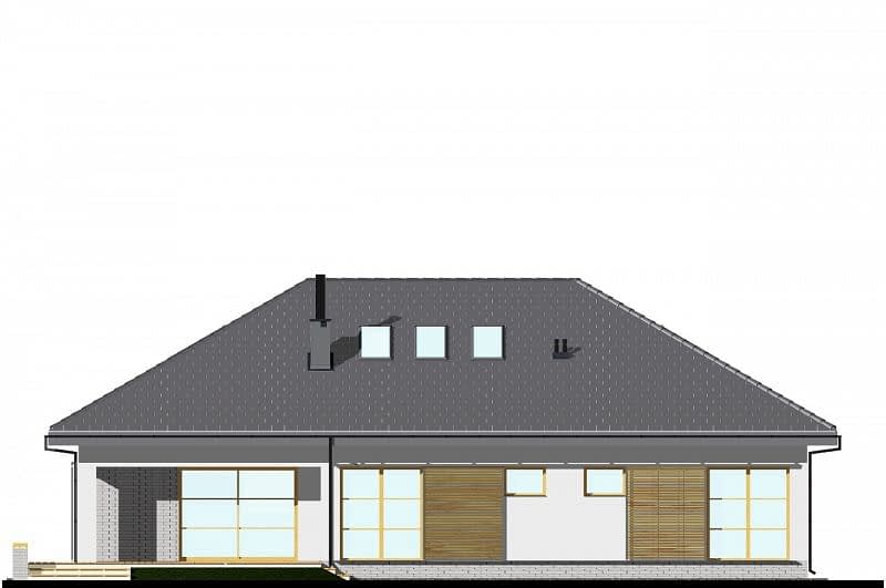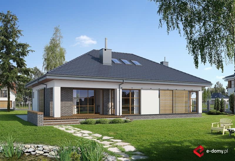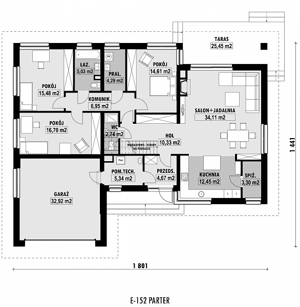 Komfortowy dom z 3 sypialniami. Wnętrze jest widne i przestronne, a połączenie salonu z jadalnią i otwartą kuchnią daje wrażenie przestronności. W części sypialnej domu znajduje się również oddzielne pomieszczenie na pralnię. Na poddaszu pokazujemy wariantową powierzchnię możliwą do zaadaptowania. Dla zobrazowania jej wielkości, na rysunku podano powierzchnię netto poddasza, tj. po obrysie ścian.