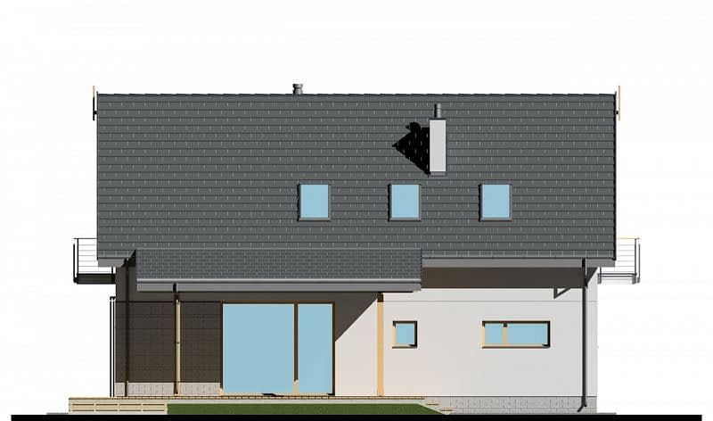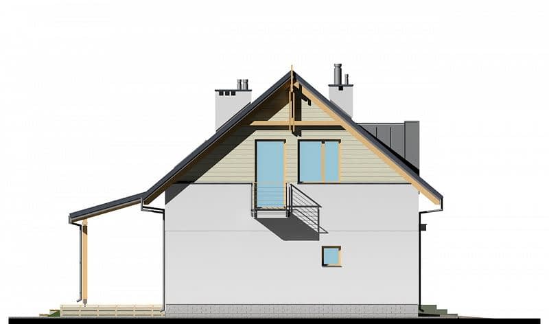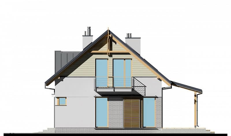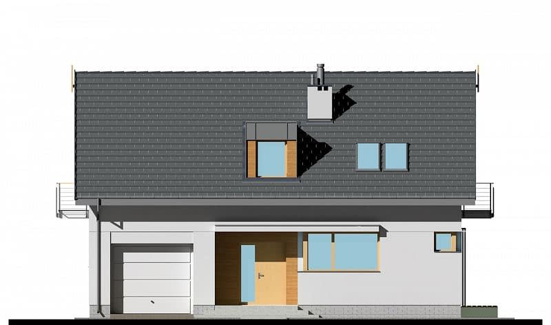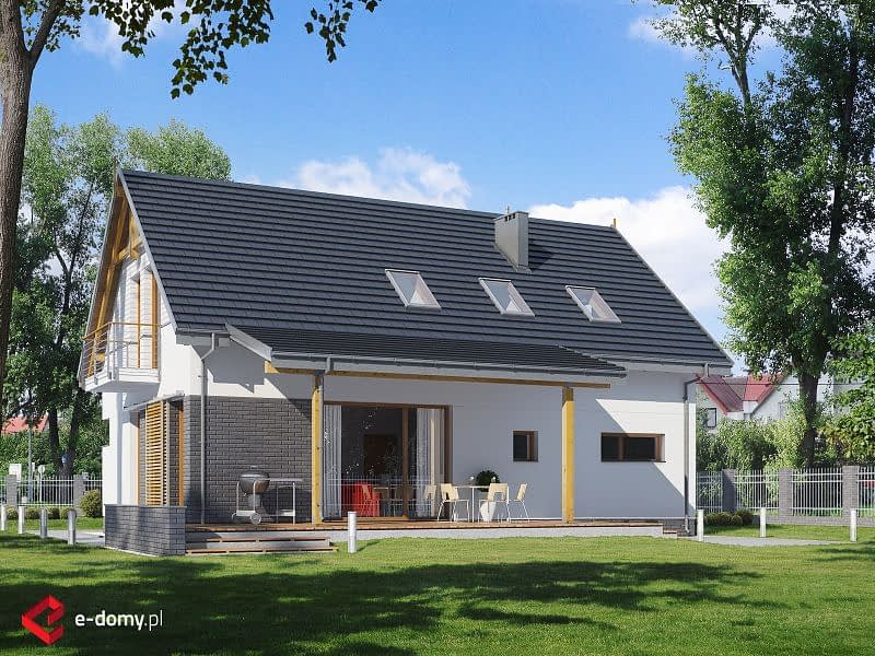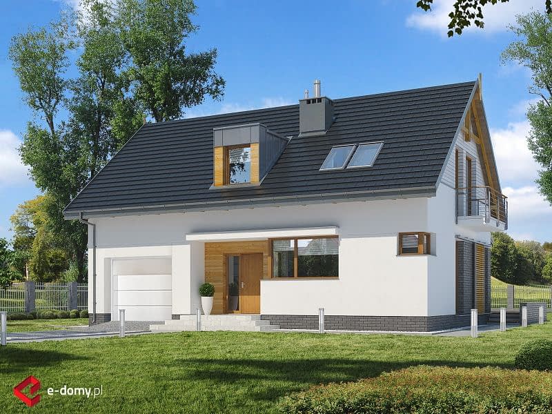 Klasyczny dom z dwuspadowym dachem i garażem wbudowanym w bryłę budynku. Dzięki połączeniu salonu z jadalnią i kuchnią powstała dobrze doświetlona strefa wspólna. Kuchnia została wyposażona w sporą spiżarnię, poprawiającą komfort użytkowania domu. Strefa sypialna znajduje się na poddaszu, gdzie ulokowano 3 pokoje sypialne, w tym jeden z prywatną garderobą.