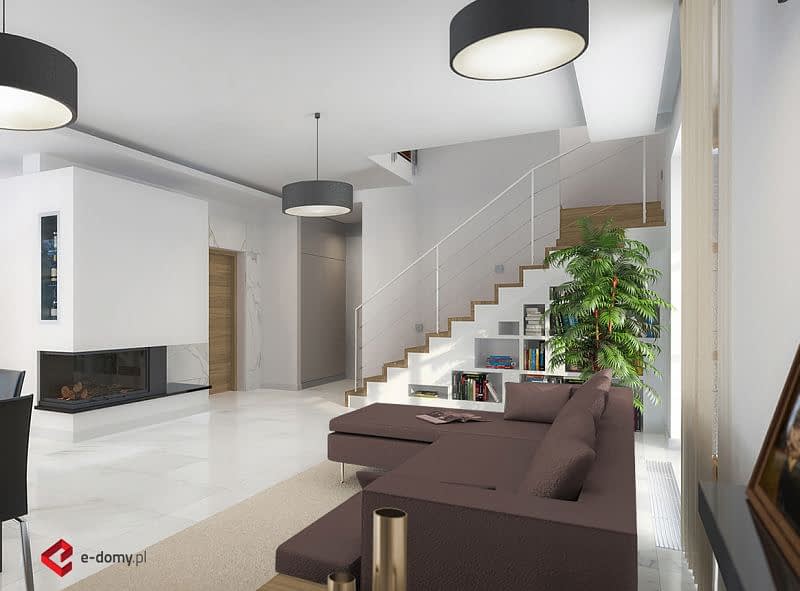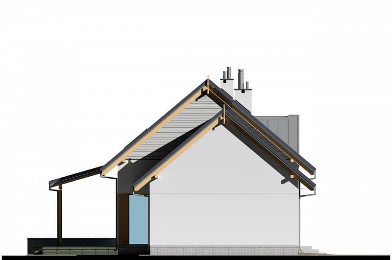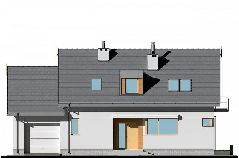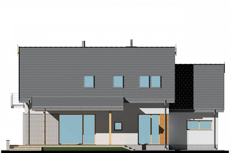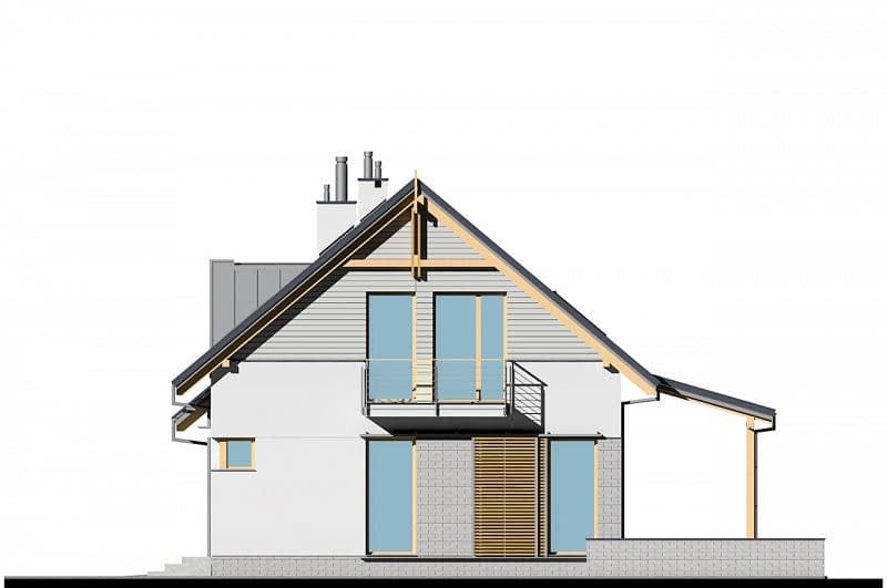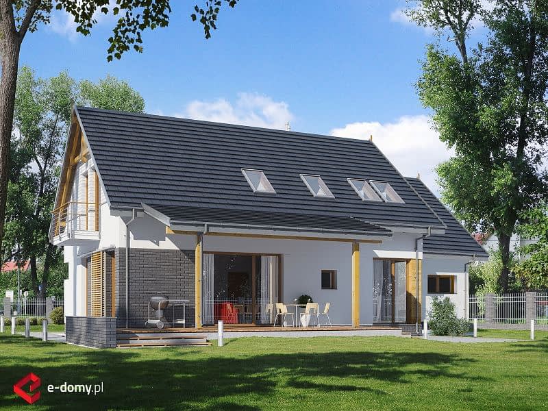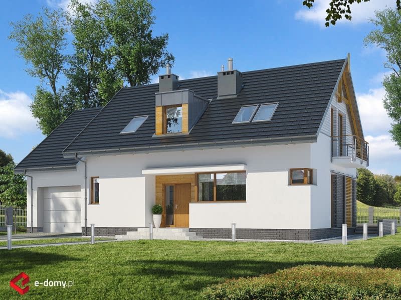 Dom o prostej konstrukcji, w którym fasadę wykończono naturalnymi materiałami (drewno i szara cegła). Salon z jadalnią tworzą jedną przestrzeń, z której zapewniono dostęp do wygodnej, wyposażonej w odrębną spiżarnię kuchni. Na parterze znajduje się także oddzielony pokój idealny na gabinet a także praktyczny schowek pod schodami. Na piętrze zaprojektowane zostały 3 sypialnie, łazienka oraz pomieszczenie na pralnię.