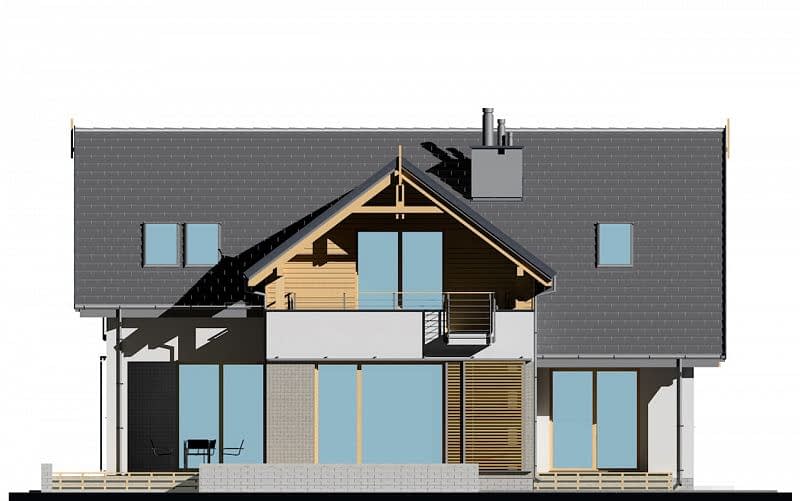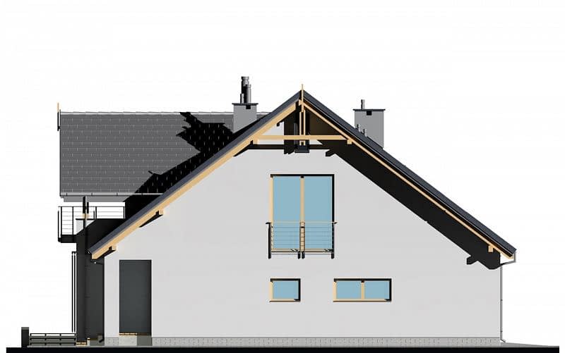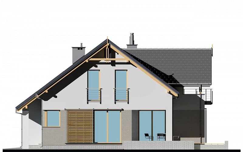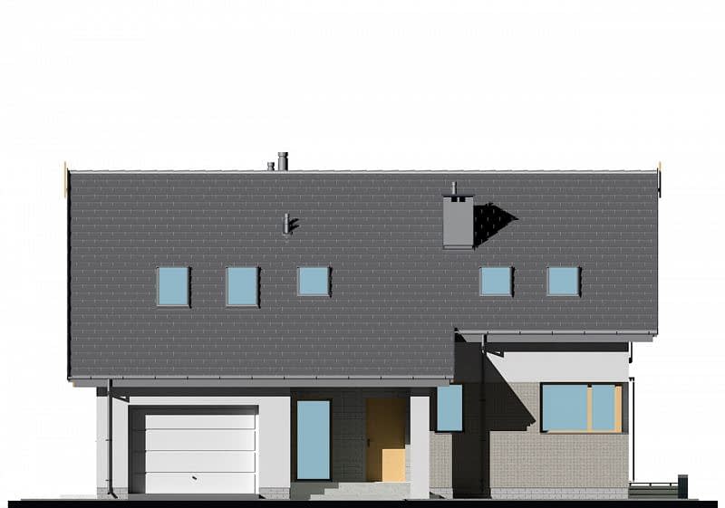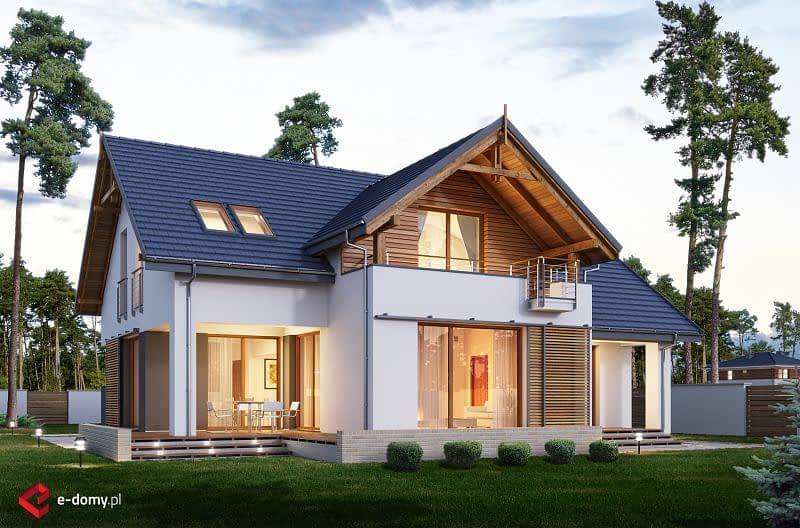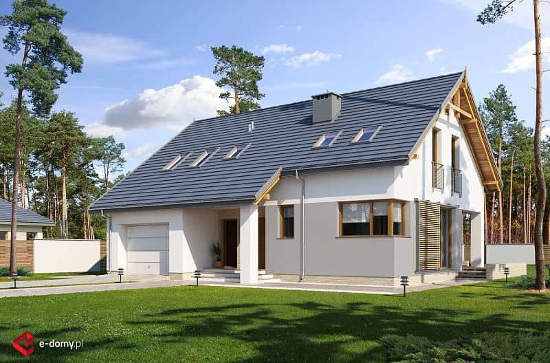 Prosty dom jednorodzinny z poddaszem z jednostanowiskowym garażem. Jest to inna wersja projektu E-157. Przestrzeń salonu, jadalni i kuchni wzajemnie się przenika. Dzięki odpowiedniemu usytuowaniu salonu i jadalni z obu przestrzeni można wyjść na zadaszony taras. Na poddaszu znajdują się 3 sypialnie oraz pomieszczenie rekreacyjne z tarasem, z którego rozciąga się widok na cały ogród. W sypialni na garażem, zaprojektowano wyższą ściankę kolankową, dzięki obniżeniu stropu.