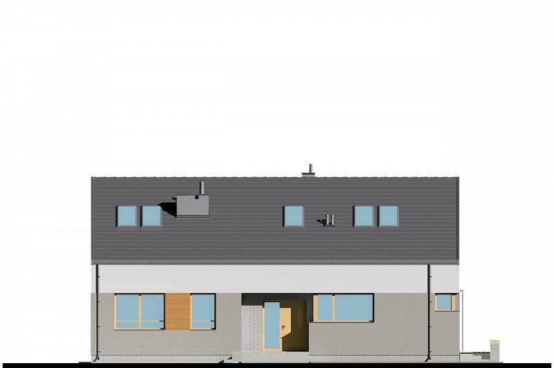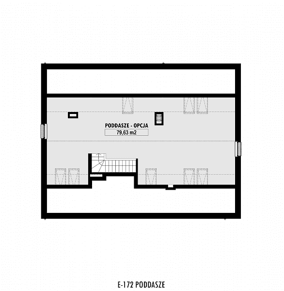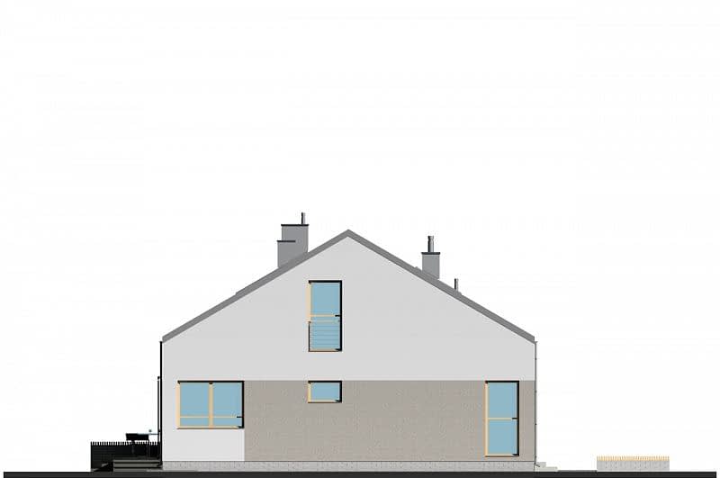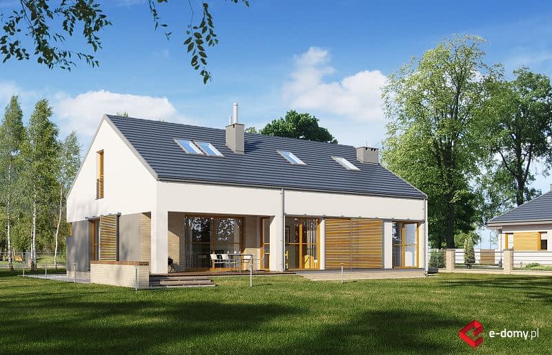 Nowoczesny, nieduży i prosty w budowie dom z dwuspadowym dachem. Jest to projekt podobny do domu E-171, ale w miejsce garażu zaprojektowano dodatkowy pokój. Istnieje możliwość dobudowania jedno- lub dwustanowiskowego garażu. W części dziennej zaplanowano salon z jadalnią oraz półotwartą kuchnię ze spiżarnią. W części nocnej trzy sypialnie, WC oraz łazienkę z wanną i prysznicem. Atutem domu jest możliwość łatwego zaadaptowania poddasza. Na rzucie pokazano lokalizację schodów.