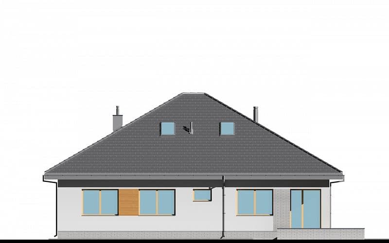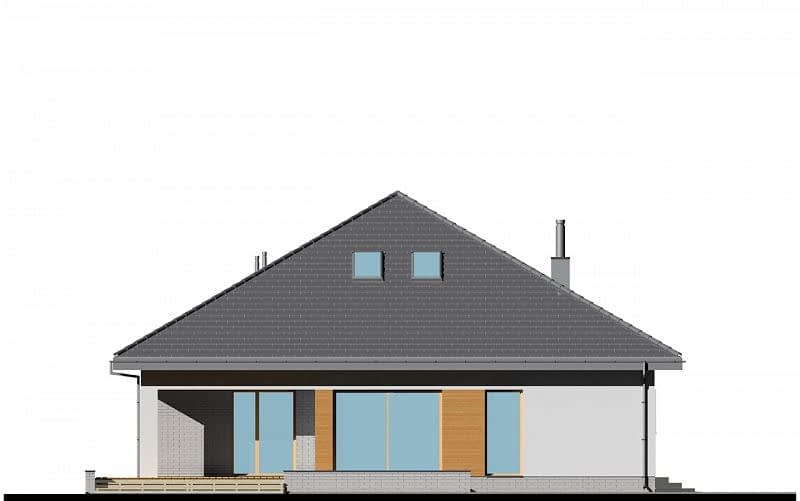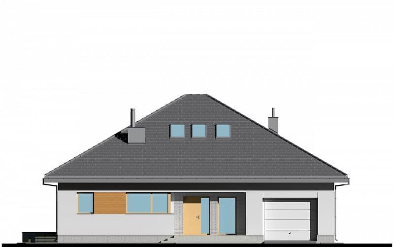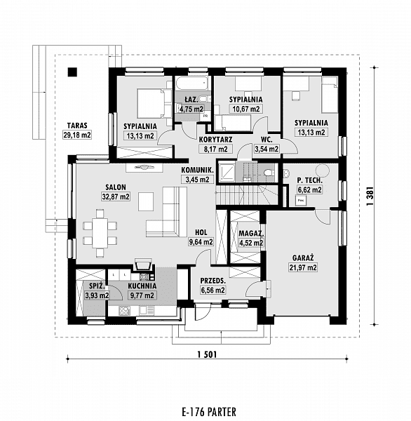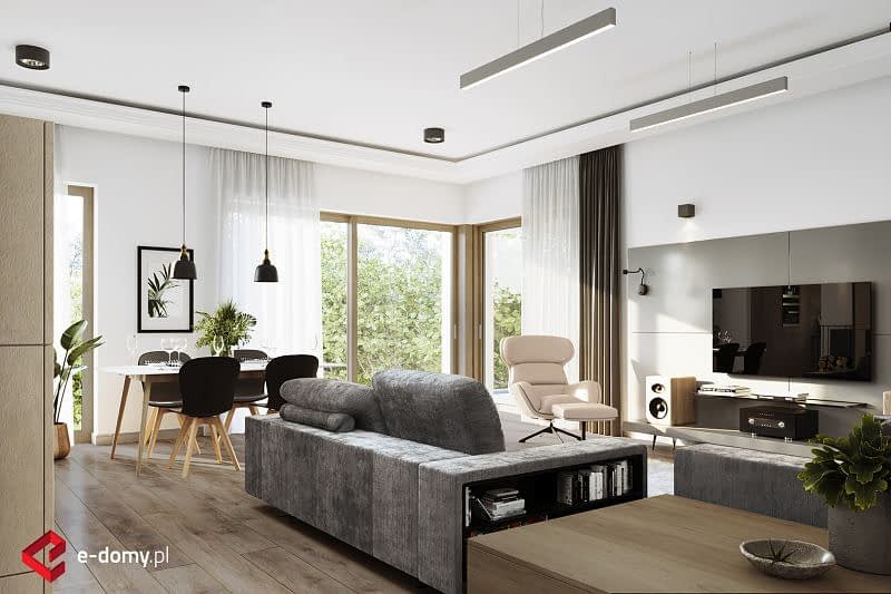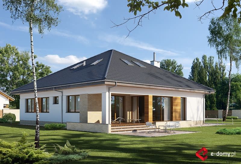 Pomniejszona wersja projektu E-175 z garażem jednostanowiskowym, w prostej bryle opartej na planie prostokąta. W części dziennej zaplanowano duży otwarty salon z jadalnią oraz kuchnię od strony wejścia, ze spiżarnią. Z tyłu domu, w części sypialnej zaplanowano trzy sypialnie, WC oraz pełnowartościową łazienkę z wanną i prysznicem. Atutem domu jest bardzo łatwa możliwość zaadaptowania poddasza (projekt zawiera schody na poddasze).