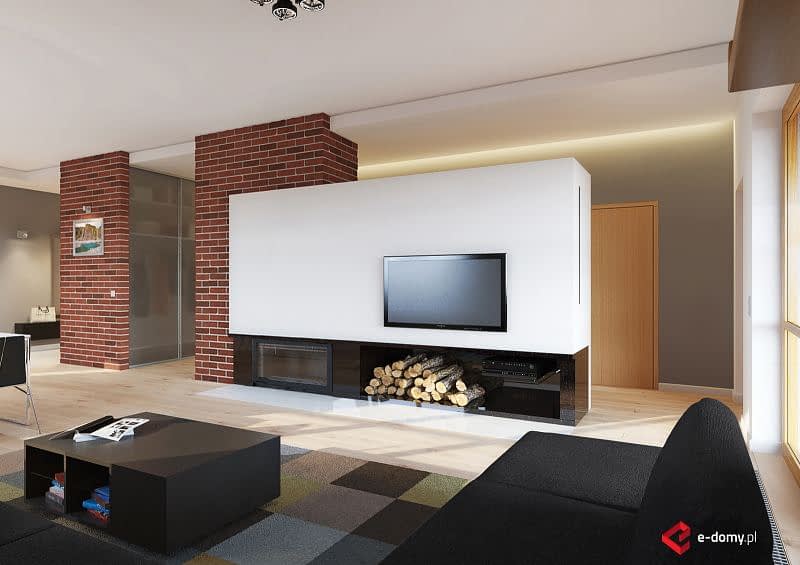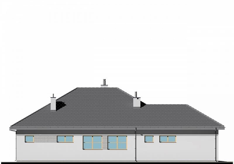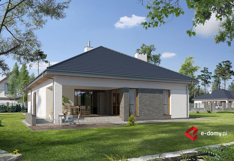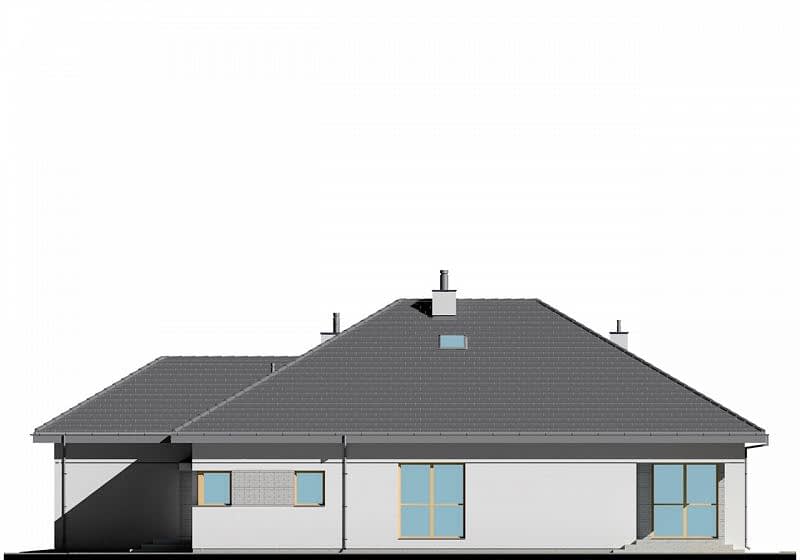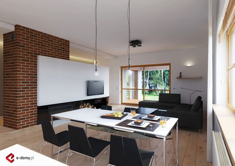Projekt nowoczesnego domu z dwustanowiskowym garażem. Jest to powiększona wersja projektu E-121. W części dziennej zaplanowano salon z jadalnią oraz półotwartą kuchnię. Część sypialną oddzielono od części dziennej ścianą o wysokości 2,2m. Dzięki temu uzyskujemy bardzo przestrzenne wnętrze. W części sypialnianej zaplanowano trzy sypialnie oraz 2 łazienki z wanną i prysznicem, oraz aneks z pralnią. Wysokość pomieszczeń parteru wynosi 2,95m. Istnieje możliwość łatwego zaadaptowania poddasza. Na rzucie pokazano możliwą lokalizację lekkich schodów.