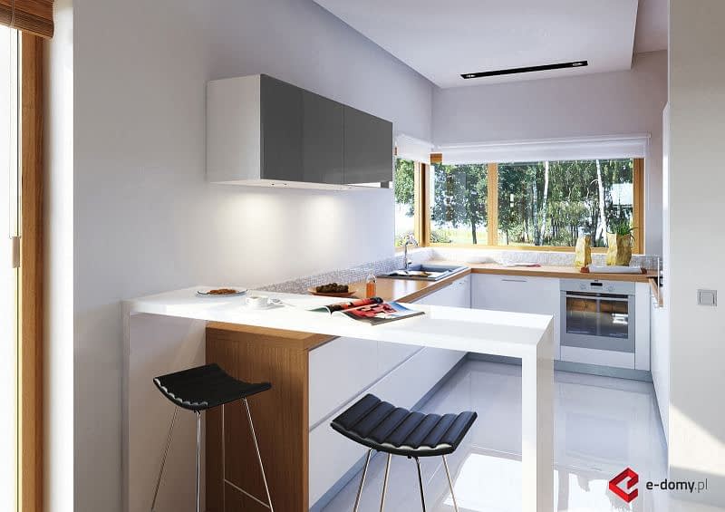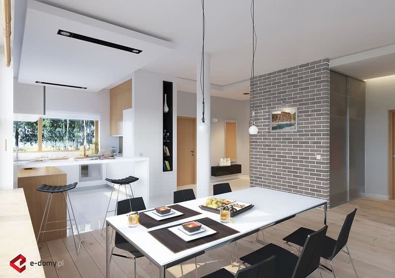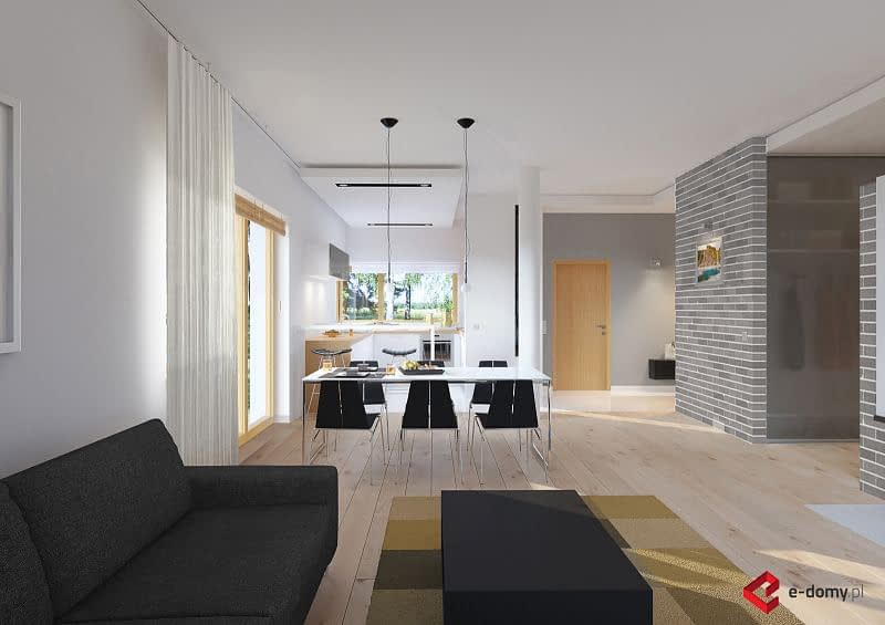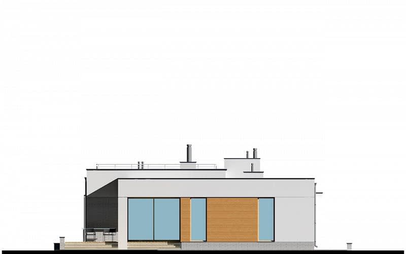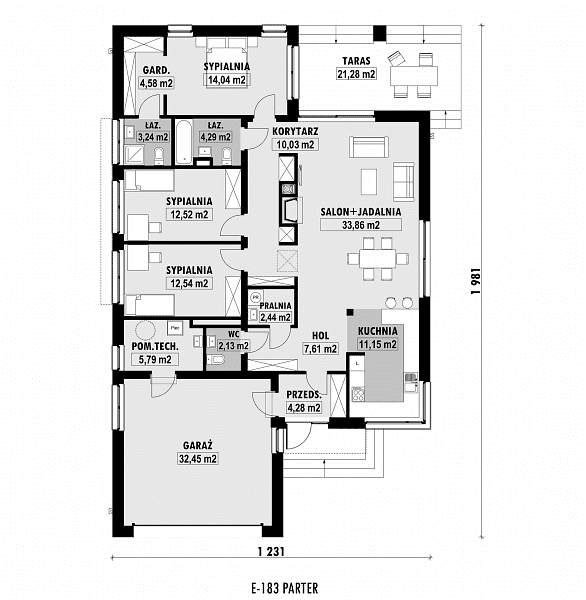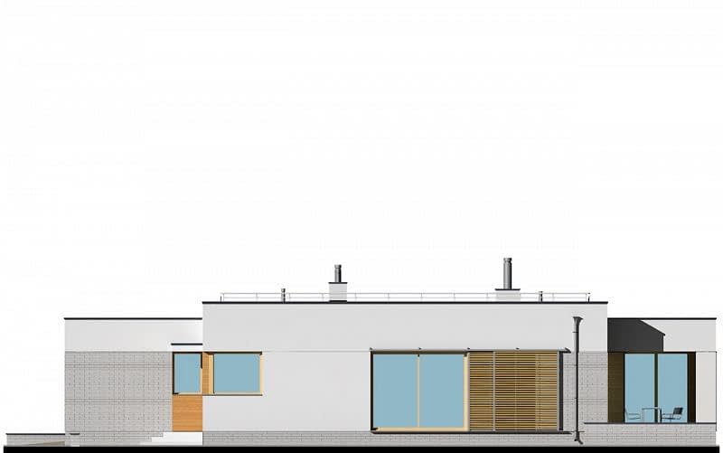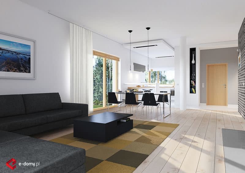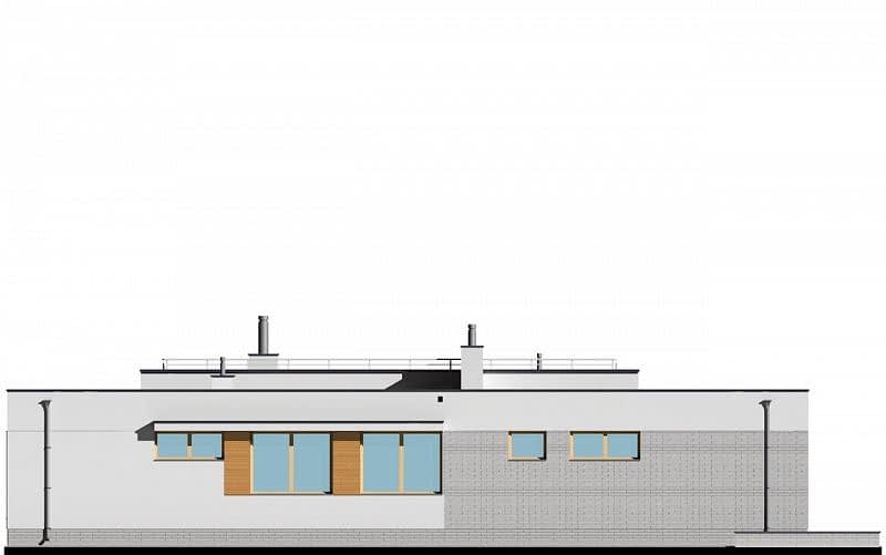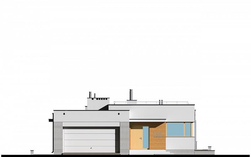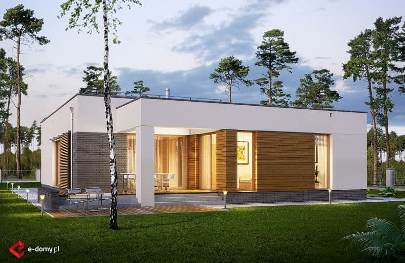 Projekt nowoczesnego domu z dwustanowiskowym garażem i zpłaskim dachem. Jest to powiększona wersja projektu E-182. W części dziennej zaplanowano salon z jadalnią oraz kuchnię. Część sypialną oddzielono od części dziennej ścianą o wysokości 2,2m. W części sypialnianej zaplanowano trzy sypialnie, 2 łazienki z wanną i prysznicem, oraz oddzielna pralnia. Wysokość pomieszczeń parteru wynosi 2,95m.