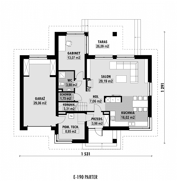 - zmniejszenie lub powiększenie garażu w ramach adaptacji projektu,