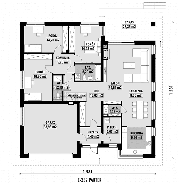 - zmniejszenie lub powiększenie garażu w ramach adaptacji projektu,