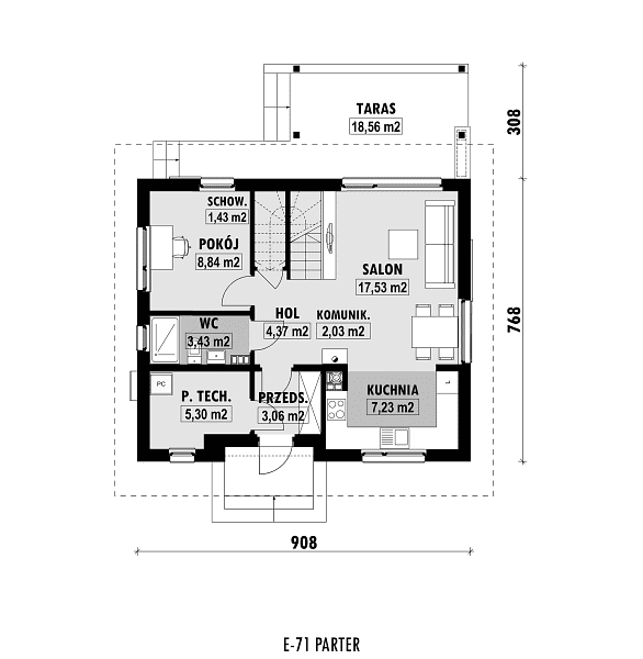 - Minimalne wymiary działki16.68 x 17.08m
