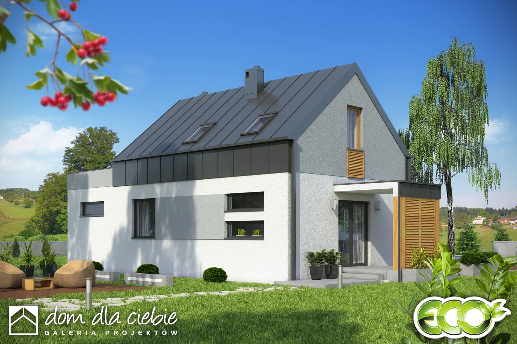 Eco 3 jest to projekt nowoczesnego domu jednorodzinnego dla 4-ro osobowej rodziny. Zaprojektowany dom ma prostą i nowoczesną formę, co przekładać się ma na oszczędności w budowie domu. Parter to część ogólna, która obejmuje: przeszklony dużymi drzwiami tarasowymi, salon z centralnie umiejscowionym kominkiem oraz jadalnią i niewielką kuchnią. Mamy tu też do dyspozycji dodatkowy pokój, niedużą ale wygodną łazienkę oraz pralnie z c.o. Poddasze to część prywatna, która obejmuje: dwie sypialnie oraz wspólną wygodną łazienkę. W jednej sypialni wydzielono przestrzeń na sporą garderobę. Dom z powodzeniem może być wykorzystany jako rekreacyjny - całoroczny... Sprawdź inne projekty domów - Zapraszamy !