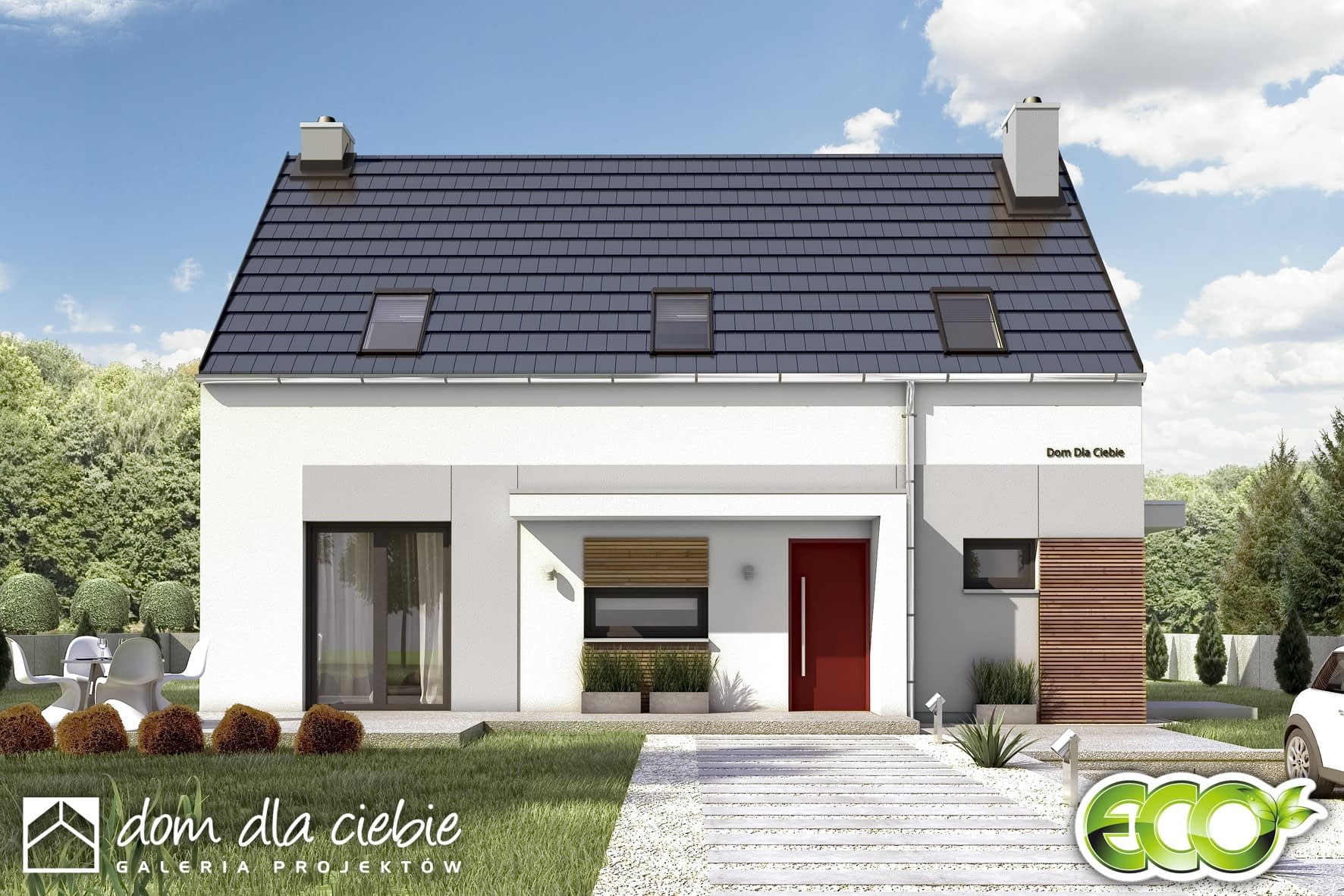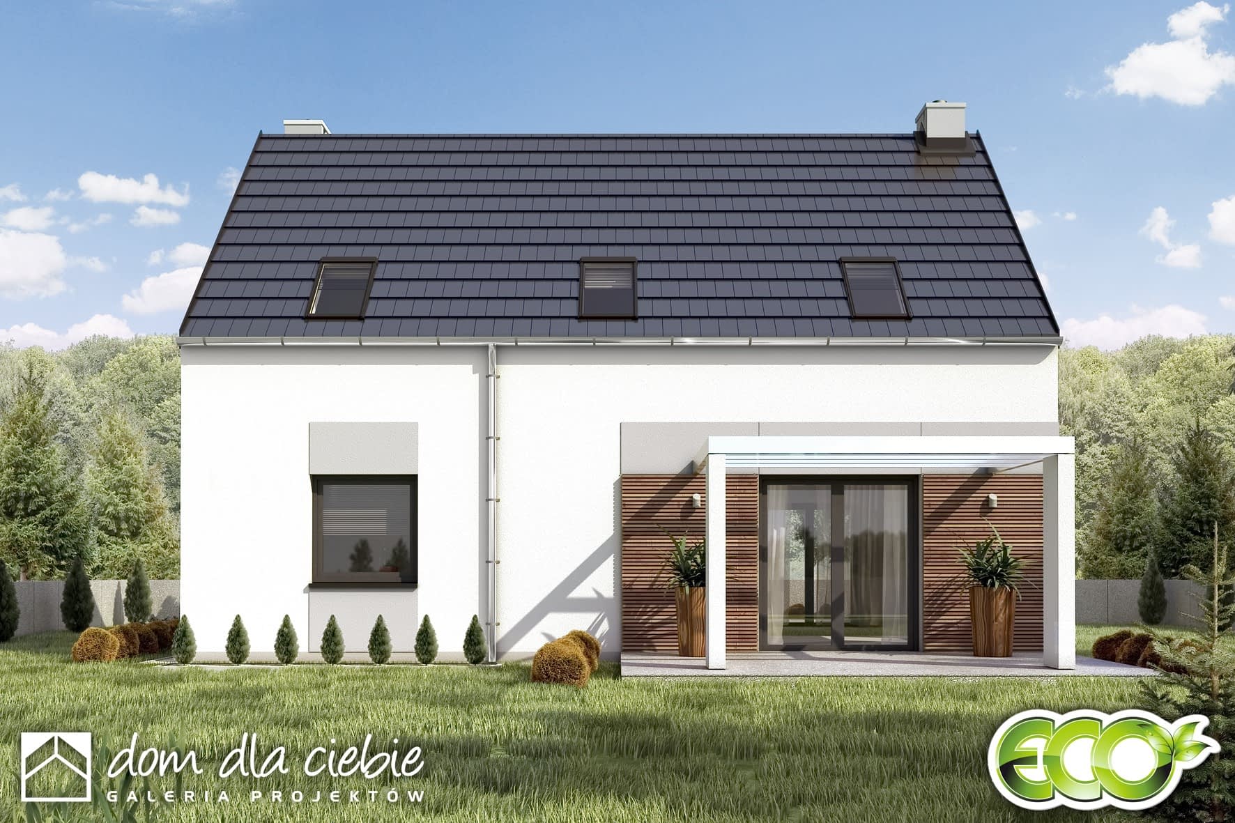 Eco 5 to projekt nowoczesnego domu z serii ECO (to seria projektów domów ekonomicznych: oszczędnych w kosztach budowy oraz w użytkowaniu,). Projekt przewidziany jest dla 4 osobowej rodziny. Na parterze projektuje się cześć ogólną, z otwartym salonem, jadalnią, kuchnią, dodatkowym pokojem sypialnym i łazienką. Z wiatrołapu dostępna jest kotłownia na paliwo stałe, która ma również dostęp od zewnątrz, co ułatwi np dostarczanie paliwa. Poddasze to część prywatna, obejmująca: aż cztery sypialnie oraz wspólną łazienkę.