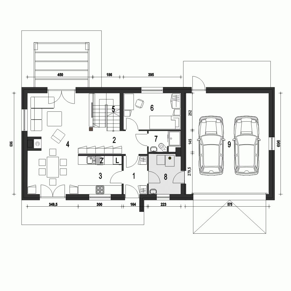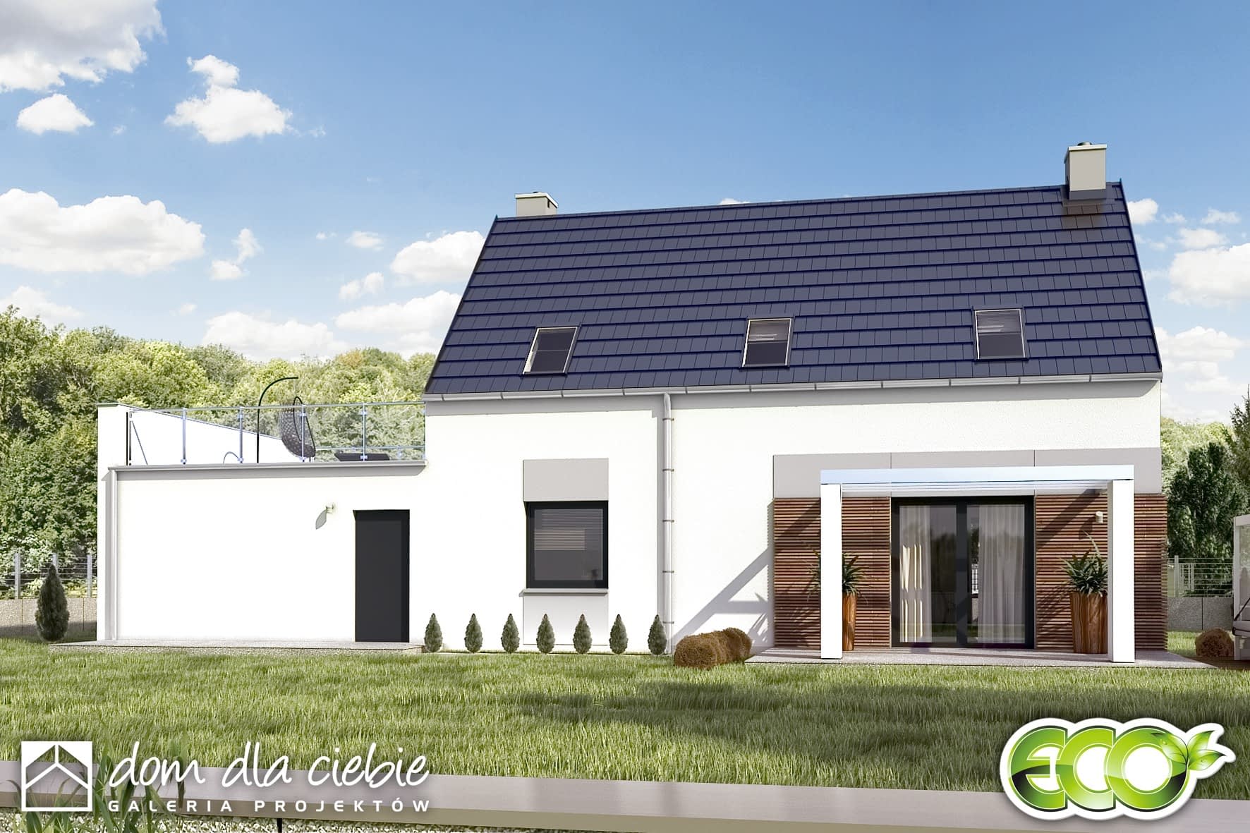 Eco 5 z garażem dwustanowiskowym to projekt nowoczesnego domu z serii ECO (to seria projektów domów ekonomicznych - oszczędnych w budowie oraz w użytkowaniu,). Eco 5 to projekt przewidziany dla 4 osobowej rodziny. Na parterze przewiduje się cześć ogólną, z otwartym salonem, jadalnią, wygodną kuchnią, dodatkowym pokojem sypialnym i łazienką. Z wiatrołapu dostępna jest kotłownia na paliwo stałe, która ma również dostęp od przybudowanego garażu, co ułatwi np dostarczanie paliwa. Poddasze ze ścianką kolankową wys. 60cm, to część prywatna, obejmująca: aż cztery sypialnie oraz wspólną łazienkę. Dwie z sypialni mają zapewnione wyjście na obszerny taras zlokalizowany na dachu garażu. Eco 5 to atrakcyjny, funkcjonalny i energooszczędny dom z poddaszem użytkowym.
