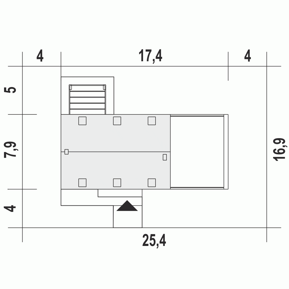 - Minimalne wymiary działki16.9 x 25.4m