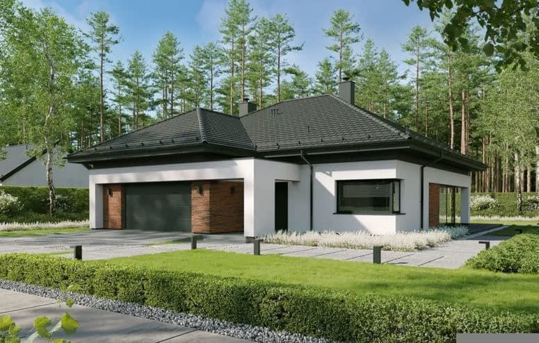 Projekt domu EG-104 to projekt niedużego funkcjonalnego domu z dwustanowiskowym garażem.
